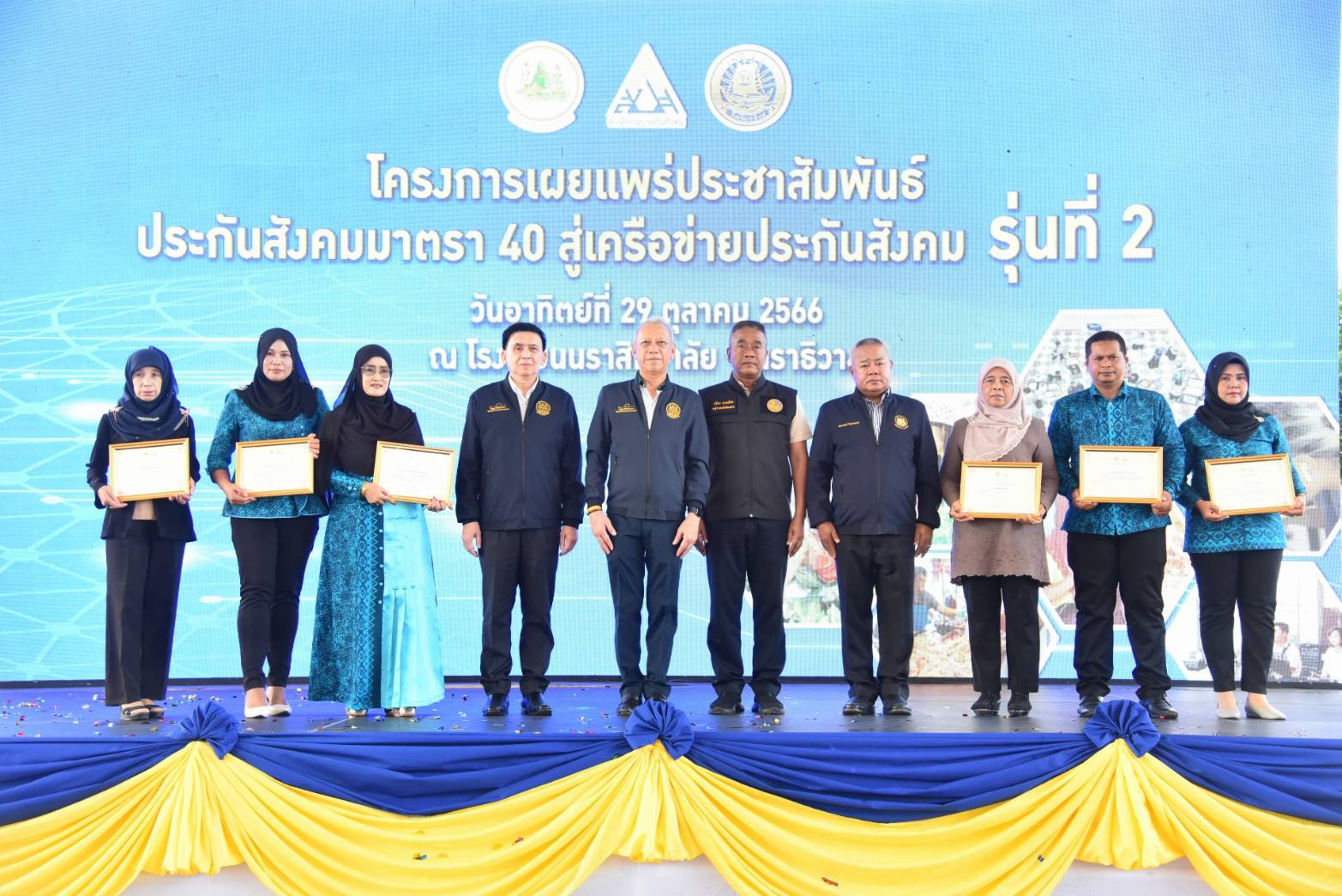 นายพิพัฒน์ รัชกิจประการ รัฐมนตรีว่าการกระทรวงแรงงาน กล่าวว่า ตนมีความยินดีเป็นอย่างยิ่ง ที่ได้รับเกียรติเป็นประธานในพิธีเปิดโครงการเผยแพร่ประชาสัมพันธ์ประกันสังคมมาตรา 40 สู่เครือข่ายประกันสังคม รุ่นที่ 2 ซึ่งจัดขึ้นที่ โรงเรียนนราสิกขาลัย จังหวัดนราธิวาส โดยโครงการนี้มีจุดประสงค์เพื่อรณรงค์เชิญชวนกลุ่มผู้ประกอบอาชีพอิสระ เช่น พ่อค้า แม่ค้า คนขับรถรับจ้าง เกษตรกร ที่มีอายุตั้งแต่ 15 ปีบริบูรณ์ ถึง 65 ปีบริบูรณ์ โดยเฉพาะกลุ่มคนรุ่นใหม่ที่ประกอบอาชีพอิสระ ซึ่งถือเป็นแรงงานสำคัญในระบบเศรษฐกิจของประเทศ ให้สามารถเข้าถึงสิทธิความคุ้มครองสูงสุด 5 กรณี ได้แก่ เงินทดแทนการขาดรายได้เมื่อเจ็บป่วย ทุพพลภาพ ค่าทำศพ บำเหน็จชราภาพ และสงเคราะห์บุตร เพื่อยกระดับคุณภาพชีวิตของกลุ่มแรงงานอิสระให้ดียิ่งขึ้น ซึ่งสอดคล้องกับนโยบายหลักของกระทรวงแรงงาน “การสร้างรากฐานเศรษฐกิจ พัฒนาคุณภาพชีวิตด้วยการคุ้มครองแรงงาน” โดยปัจจุบันมีผู้ประกันตนตามมาตรา 40 ทั่วประเทศ มีจำนวน 10,956,984 คน ตัวแทนเครือข่ายประกันสังคม จำนวน 24,509 คน ผู้ประกันตนตามมาตรา 40 ที่ขึ้นทะเบียนภายใต้เครือข่ายประกันสังคม จำนวน 397,165 คน และเครือข่าย “บวร” กลุ่มสมาชิกบ้าน วัด โรงเรียน และโรงงาน จำนวน 263,429 คน พร้อมนี้ได้มีพิธีมอบเกียรติบัตรให้แก่เครือข่ายที่สนับสนุนงานประกันสังคมดีเด่น และการมอบสิ่งของเครื่องอุปโภค บริโภคที่จำเป็นในการใช้ชีวิตประจำวันให้กับผู้ประกันตนที่ทุพพลภาพซึ่งอยู่ในการดูแลของสำนักงานประกันสังคมจังหวัดนราธิวาส จำนวน 2 ราย โดยรายแรกคือ นางอนงค์ แซ่ภู่ อายุ 67 ปี เป็นผู้ประกันตนมาตรา 40 ทุพพลภาพจากอาการเส้นเลือดในสมองแตก รายที่ 2 คือ นายกรุณา มณีแสง อายุ 66 ปี เป็นผู้ประกันตนมาตรา 39 ทุพพลภาพจากโรคจากไตวายเรื้อรังและโรคเบาหวาน