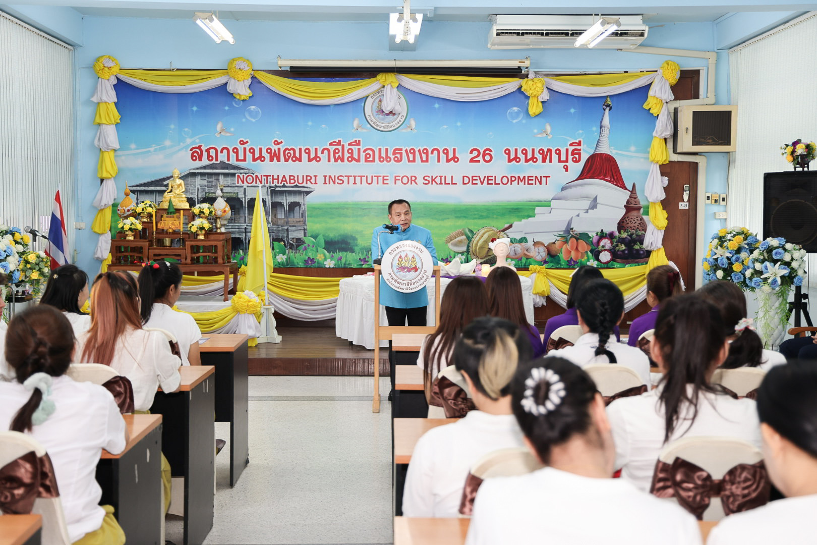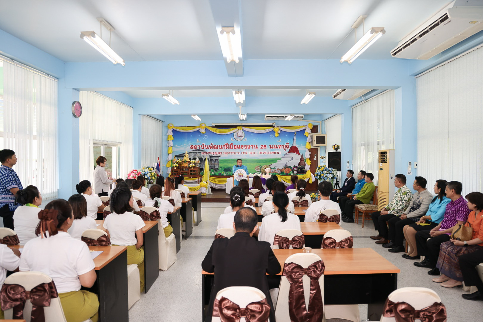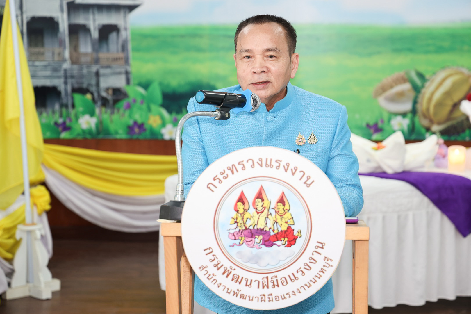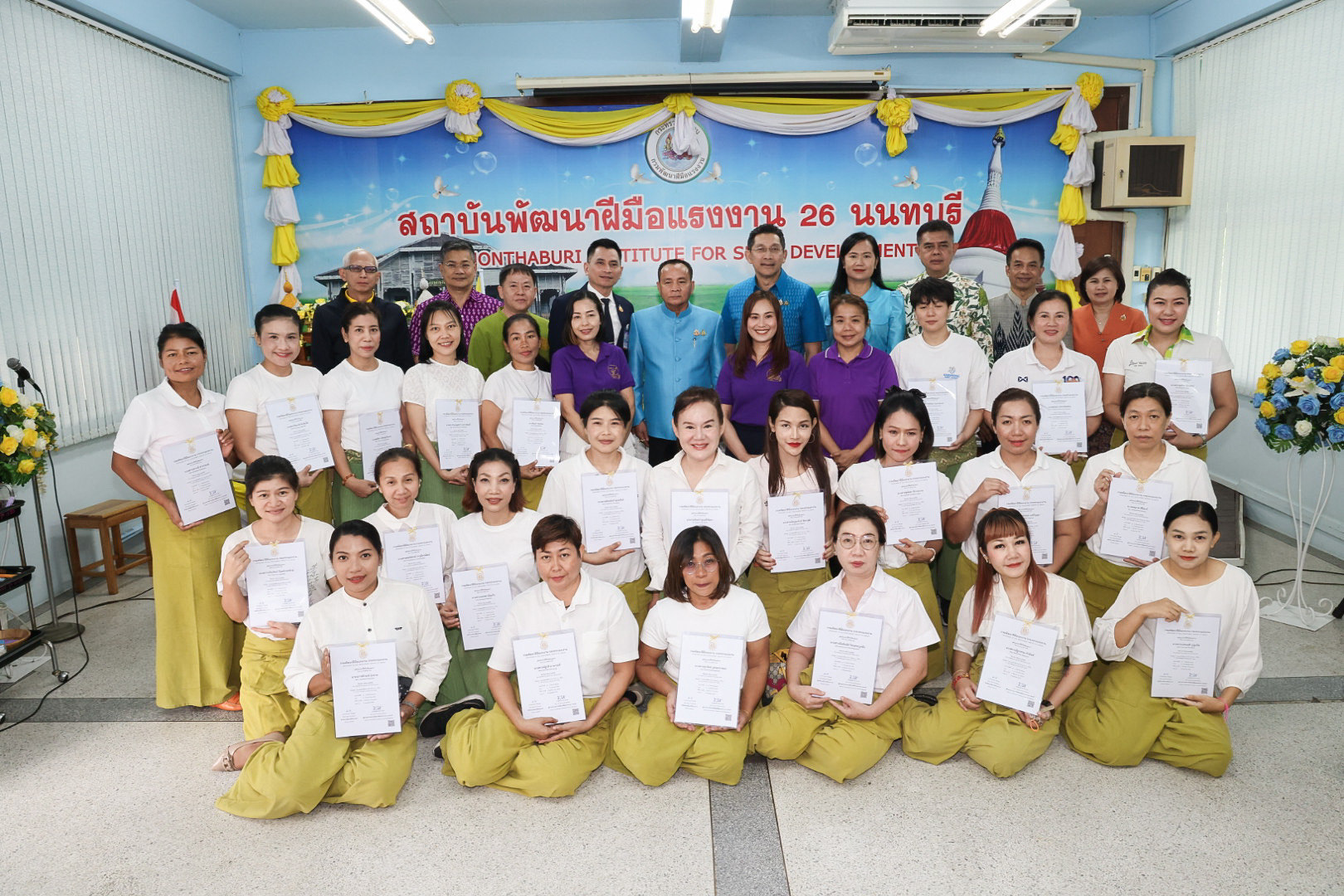 วันที่ 6 กันยายน 2567 นายพิพัฒน์ รัชกิจประการ รัฐมนตรีว่าการกระทรวงแรงงาน มอบหมายให้ นายอารี ไกรนรา เลขานุการรัฐมนตรีว่าการกระทรวงแรงงาน เป็นประธานมอบวุฒิบัตรให้แก่ผู้ผ่านการฝึกอบรมหลักสูตร การนวดหน้าเพื่อความงาม โครงการพัฒนาศักยภาพแรงงานรองรับการขับเคลื่อนอุตสาหกรรมท่องเที่ยวคุณค่าสูง ให้แก่ผู้ผ่านการฝึกอบรม จำนวน 24 คน พร้อมทั้งเยี่ยมชมนิทรรศการ สื่อการสอน หลักสูตร ช่างติดตั้งและบำรุงรักษาระบบเซลล์แสงอาทิตย์ หลักสูตรช่างไฟฟ้าภายในอาคาร และหลักสูตรผู้ประกอบการธุรกิจเครื่องดื่ม และการสาธิตนวดหน้า เพื่อยกระดับพัฒนาศักยภาพแรงงานรองรับการขับเคลื่อนอุตสาหกรรมท่องเที่ยวคุณค่าสูง โดยมี นายสมชาติ สุภารี หัวหน้าผู้ตรวจราชการกรมพัฒนาฝีมือแรงงาน ร่วมเยี่ยมชมการฝึกอบรม พร้อมด้วยหัวหน้าส่วนราชการในสังกัดกระทรวงแรงงาน และเจ้าหน้าที่ จังหวัดนนทบุรี ร่วมให้การต้อนรับ ณ สถาบันพัฒนาฝีมือแรงงาน 26 นนทบุรี