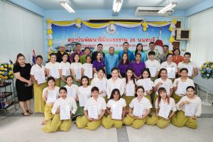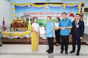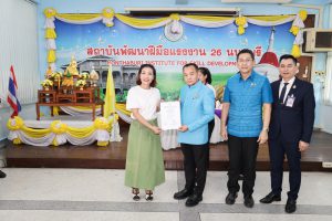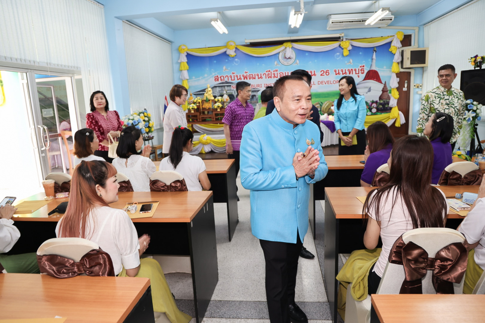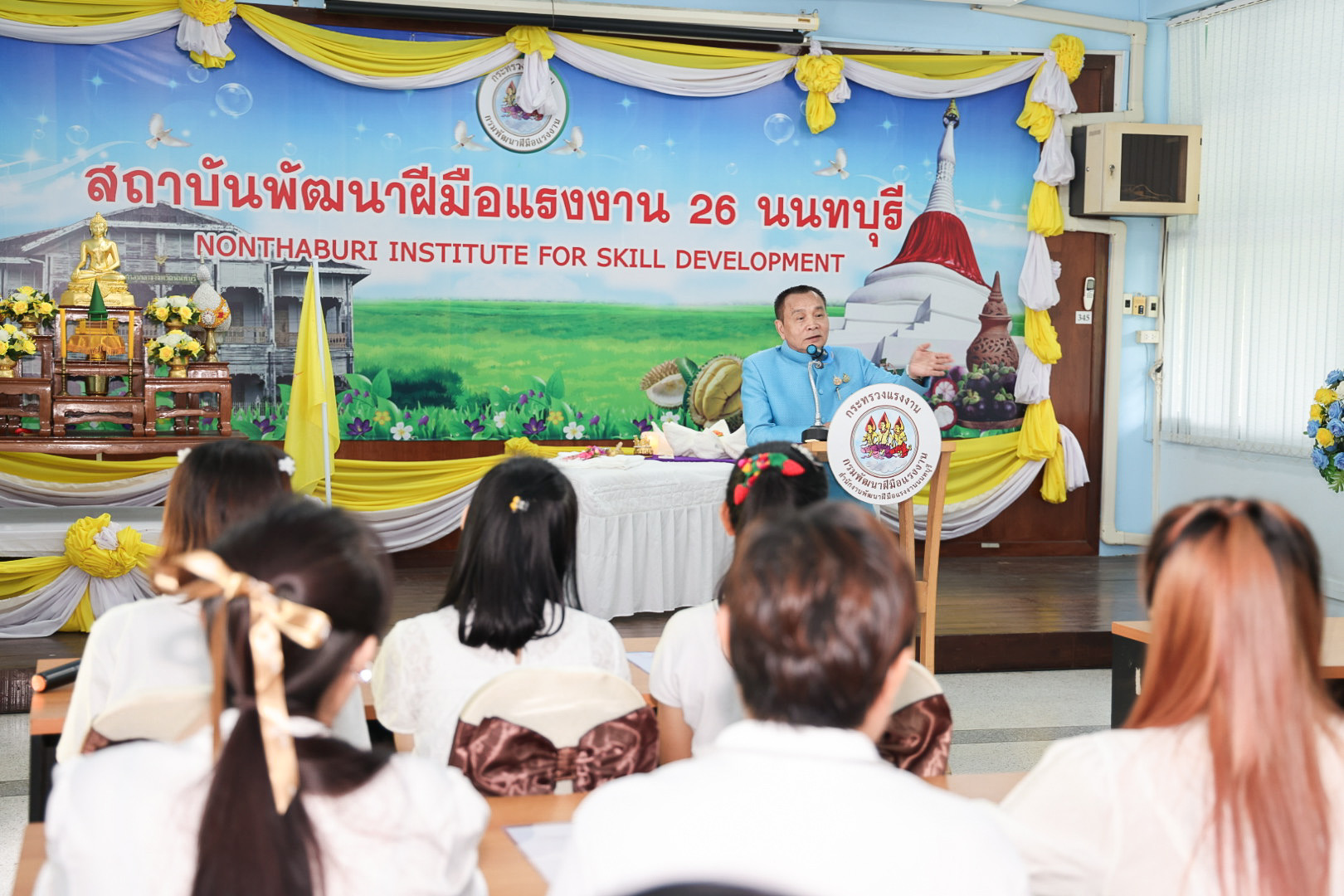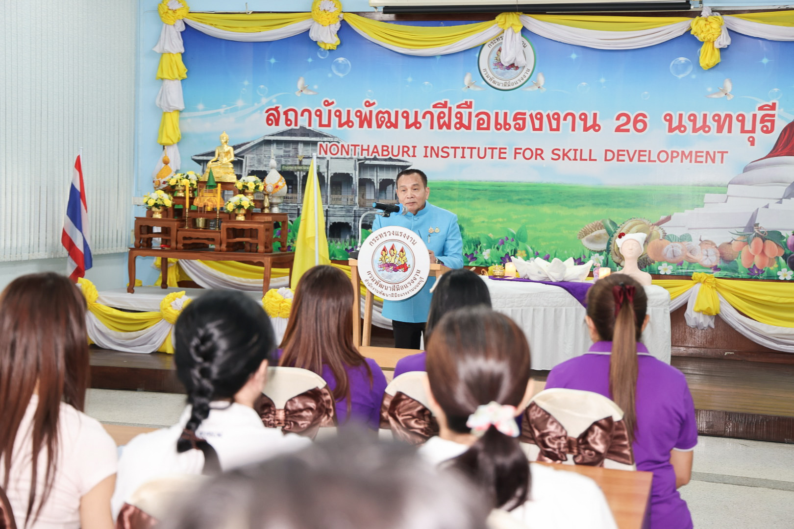 วันที่ 6 กันยายน 2567 นายพิพัฒน์ รัชกิจประการ รัฐมนตรีว่าการกระทรวงแรงงาน มอบหมายให้ นายอารี ไกรนรา เลขานุการรัฐมนตรีว่าการกระทรวงแรงงาน เป็นประธานมอบวุฒิบัตรให้แก่ผู้ผ่านการฝึกอบรมหลักสูตร การนวดหน้าเพื่อความงาม โครงการพัฒนาศักยภาพแรงงานรองรับการขับเคลื่อนอุตสาหกรรมท่องเที่ยวคุณค่าสูง ให้แก่ผู้ผ่านการฝึกอบรม จำนวน 24 คน พร้อมทั้งเยี่ยมชมนิทรรศการ สื่อการสอน หลักสูตร ช่างติดตั้งและบำรุงรักษาระบบเซลล์แสงอาทิตย์ หลักสูตรช่างไฟฟ้าภายในอาคาร และหลักสูตรผู้ประกอบการธุรกิจเครื่องดื่ม และการสาธิตนวดหน้า เพื่อยกระดับพัฒนาศักยภาพแรงงานรองรับการขับเคลื่อนอุตสาหกรรมท่องเที่ยวคุณค่าสูง โดยมี นายสมชาติ สุภารี หัวหน้าผู้ตรวจราชการกรมพัฒนาฝีมือแรงงาน ร่วมเยี่ยมชมการฝึกอบรม พร้อมด้วยหัวหน้าส่วนราชการในสังกัดกระทรวงแรงงาน และเจ้าหน้าที่ จังหวัดนนทบุรี ร่วมให้การต้อนรับ ณ สถาบันพัฒนาฝีมือแรงงาน 26 นนทบุรี