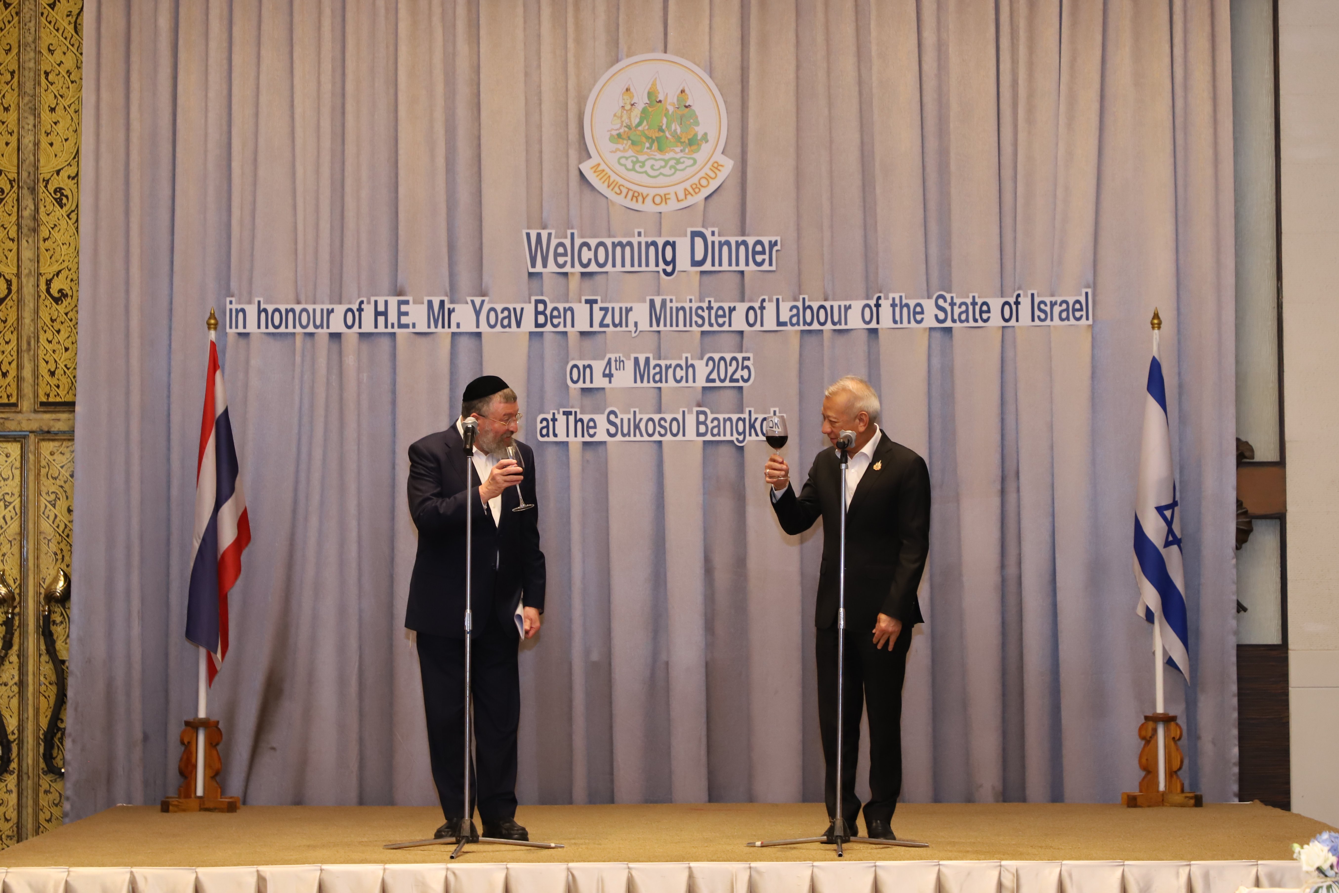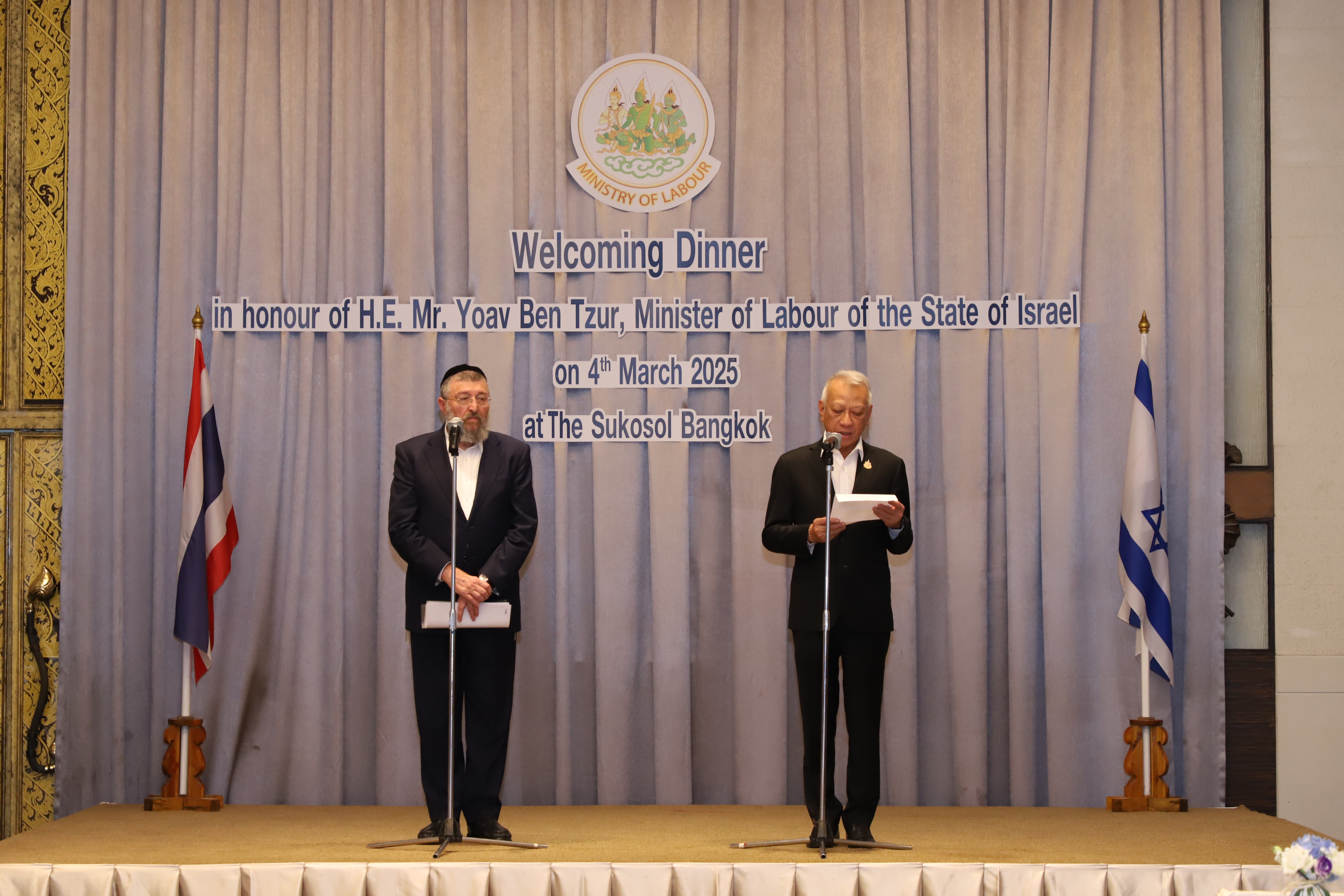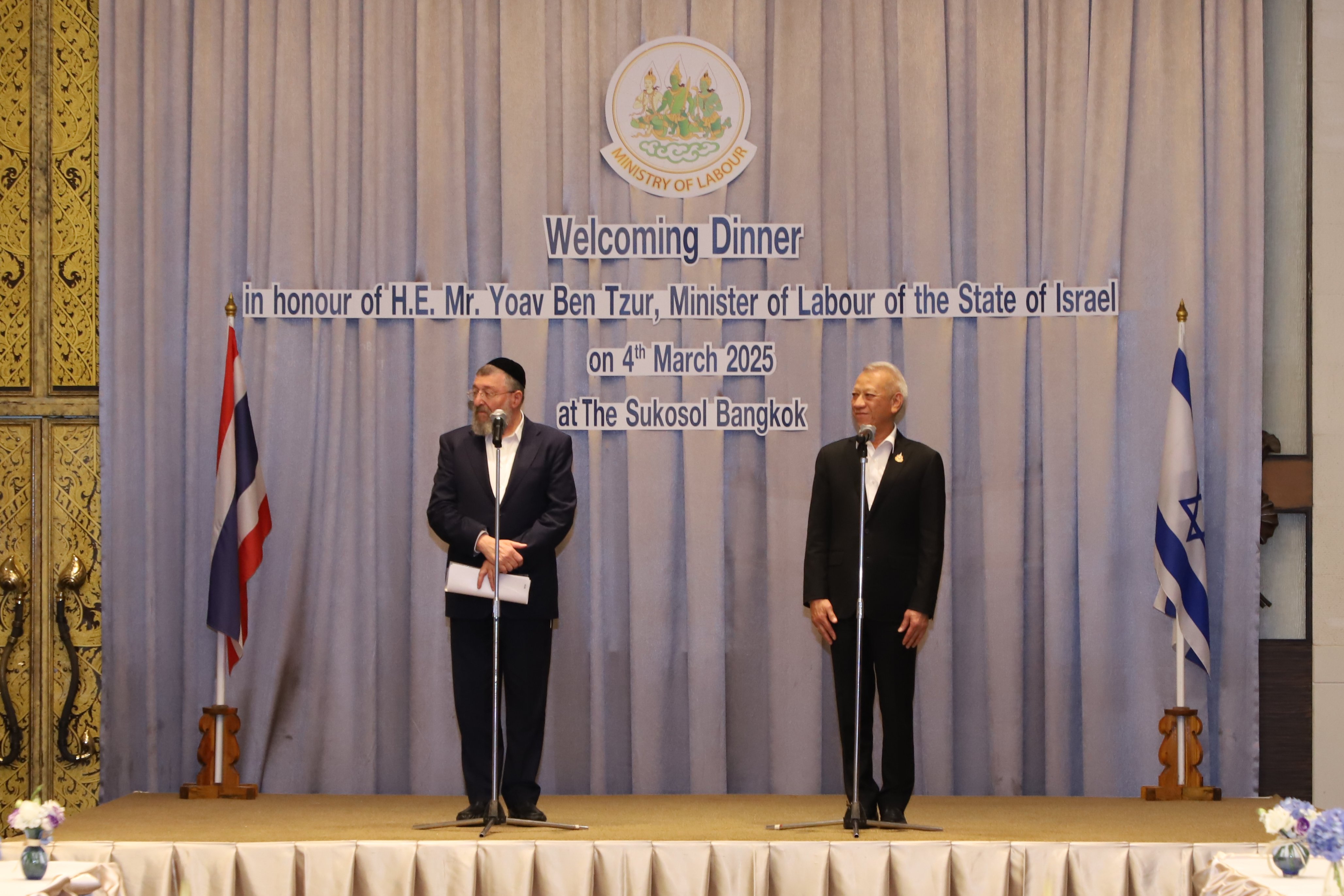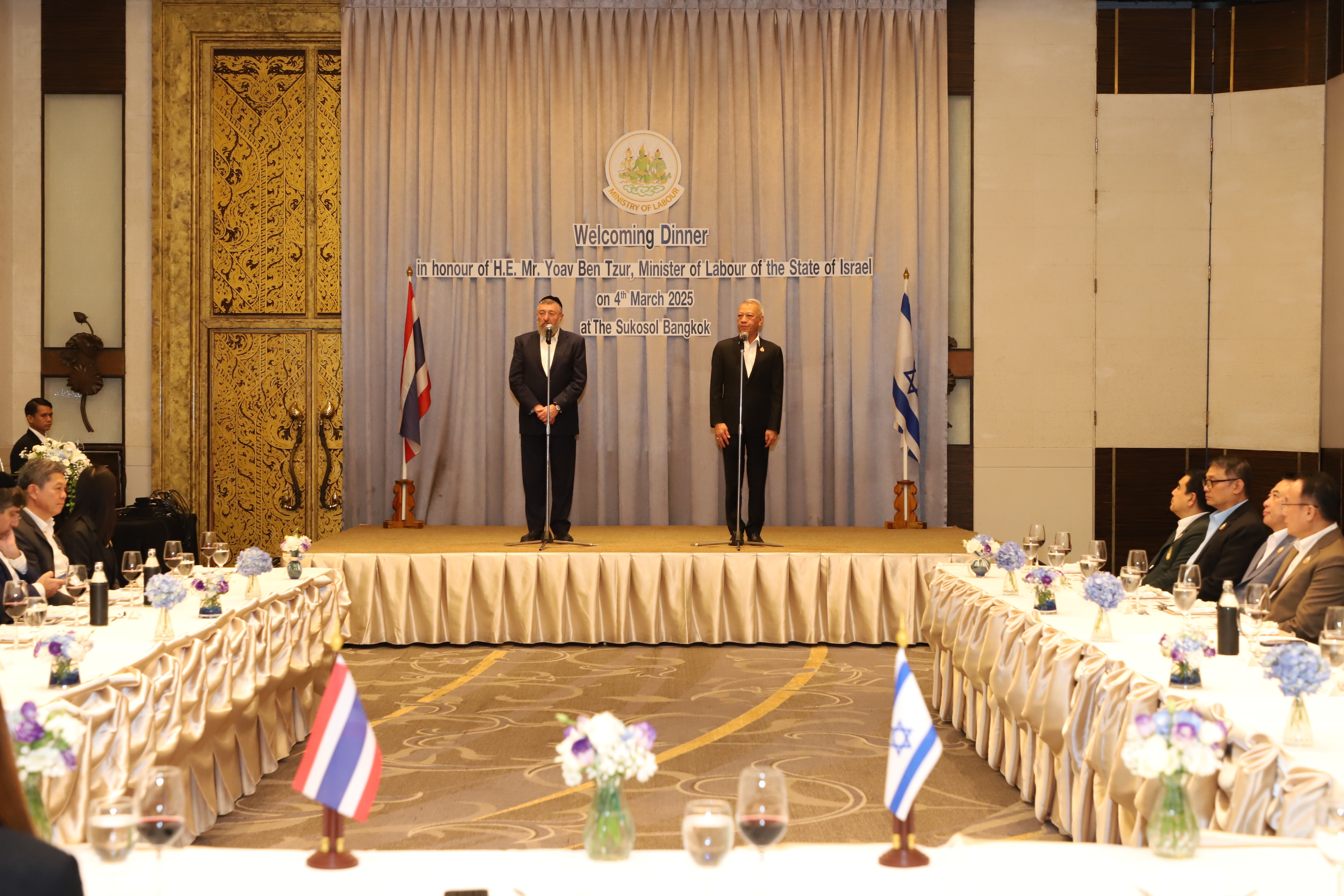 วันที่ 4 มีนาคม 2568 เวลา 18.00 น. นายพิพัฒน์ รัชกิจประการ รัฐมนตรีว่าการกระทรวงแรงงาน เป็นประธานในงานเลี้ยงรับรอง นายโยอาฟ เบน ซูร์ รัฐมนตรีว่าการกระทรวงแรงงานแห่งรัฐอิสราเอล (Mr. Yoav Ben Tzur) และคณะ ในโอกาสเดินทางเยือนประเทศไทยอย่างเป็นทางการ เพื่อการเจรจาทำงาน (Working Visit) ระหว่างวันที่ 2 – 6 มีนาคม 2568 ตามคำเชิญของ นายพิพัฒน์ รัชกิจประการ รัฐมนตรีว่าการกระทรวงแรงงาน เพื่อเยี่ยมคารวะและหารือข้อราชการด้านแรงงาน โดยมี นายอารี ไกรนรา เลขานุการรัฐมนตรีว่าการการกระทรวงแรงงาน นายภุชงค์ วรศรี ประจำสำนักเลขาธิการนายกรัฐมนตรี ปฏิบัติหน้าที่ประจำกระทรวงแรงงาน นาวาอากาศเอก อธิคุณ คงมี คณะที่ปรึกษารัฐมนตรีด้านการบริหารจัดการแรงงานผิดกฎหมาย นายบุญสงค์ ทัพชัยยุทธ์ ปลัดกระทรวงแรงงาน นางสาวบุปผา เรืองสุด รองปลัดกระทรวงแรงงาน นายสมาสภ์ ปัทมะสุคนธ์ รองปลัดกระทรวงแรงงาน นายสันติ นันตสุวรรณ ผู้ตรวจราชการกระทรวงแรงงาน รักษาราชการแทน รองปลัดกระทรวงแรงงาน นายศักดินาถ สนธิศักดิ์โยธิน ผู้ช่วยปลัดกระทรวงแรงงาน นางออร์นา ซากิฟ เอกอัครราชทูตอิสราเอลประจำประเทศไทย และคณะผู้แทนจากรัฐอิสราเอล พร้อมด้วยผู้บริหารกระทรวงแรงงาน และหน่วยงานที่เกี่ยวข้อง ร่วมงาน ณ ห้องกมลทิพย์ 3 ชั้น 2 โรงแรมเดอะ สุโกศล ถนนศรีอยุธยา เขตราชเทวี กรุงเทพมหานคร