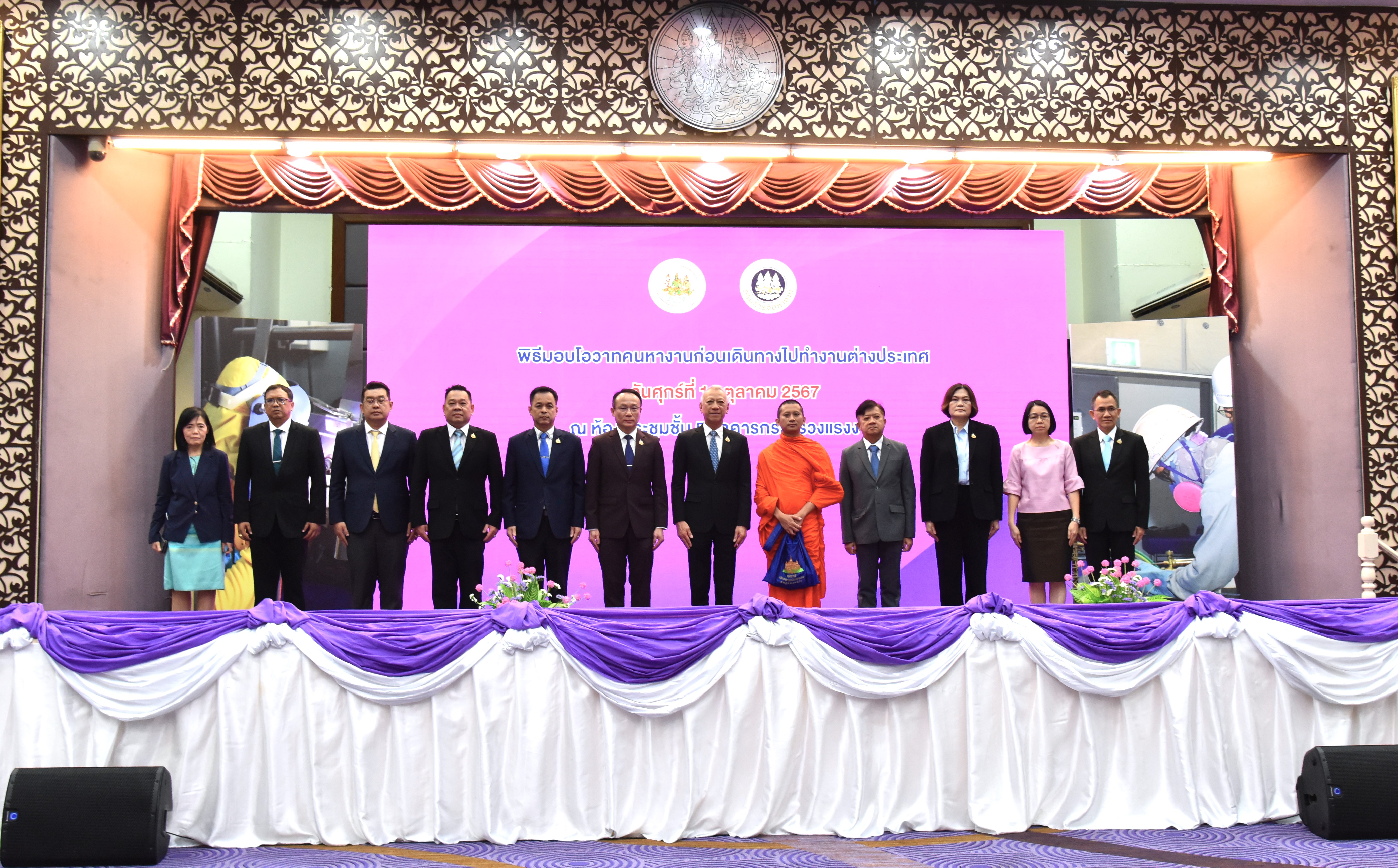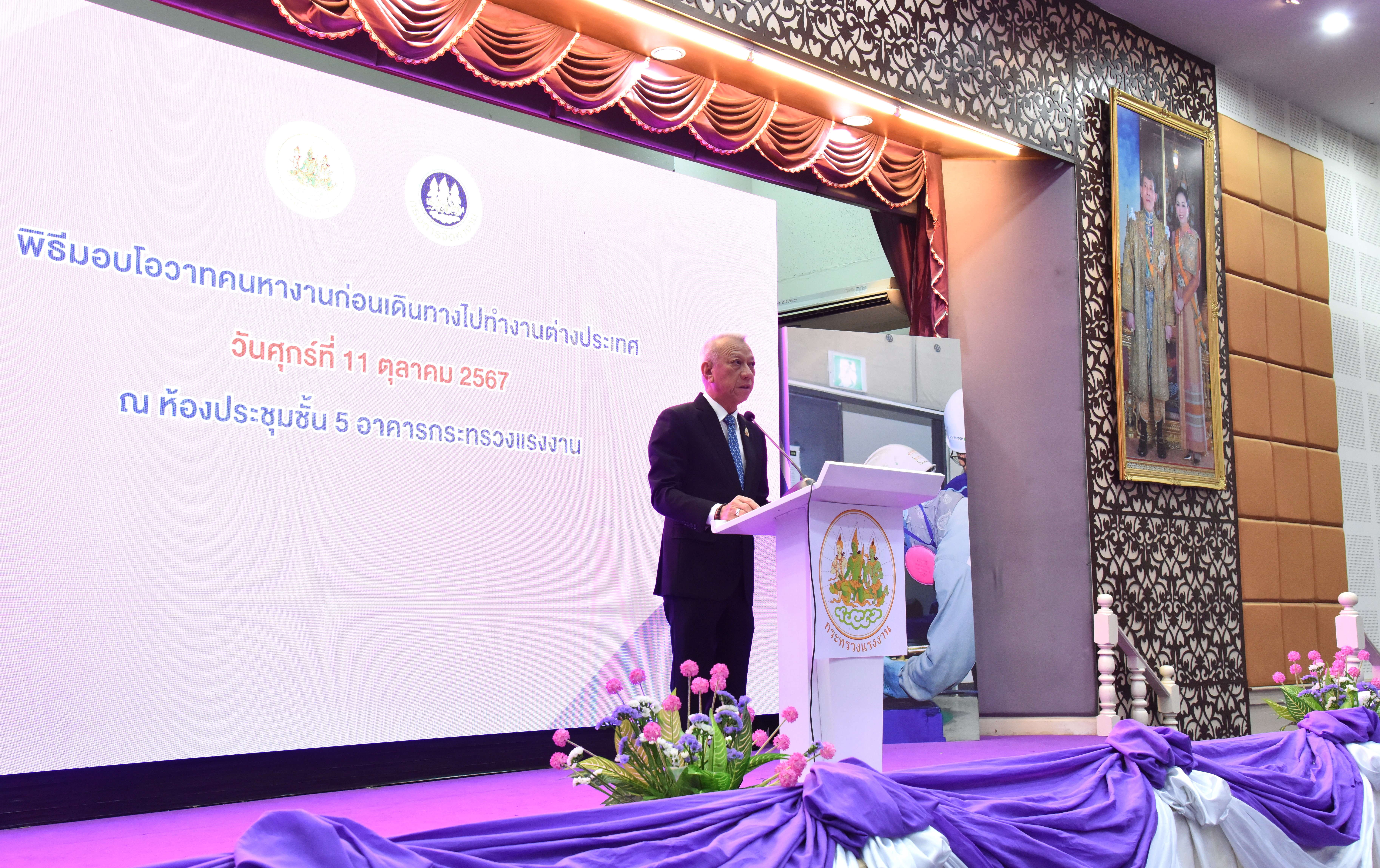นายพิพัฒน์ รัชกิจประการ รัฐมนตรีว่าการกระทรวงแรงงาน กล่าวว่า กระทรวงแรงงานตั้งเป้าหมายจัดส่งแรงงานไทยไปทำงานต่างประเทศ 100,000 อัตรา เพื่อส่งเสริมให้พี่น้องแรงงานไทย มีรายได้มั่นคง และยกระดับคุณภาพชีวิตให้ดีขึ้น อีกทั้งได้นำความรู้และประสบการณ์ในการทำงาน กลับมาพัฒนาตนเอง นำมาถ่ายทอดให้กับสมาชิกในครอบครัว หรือคนในชุมชน ซึ่งจะเป็นการพัฒนาเศรษฐกิจชุมชนและส่งผลต่อการพัฒนาเศรษฐกิจในระดับประเทศ ซึ่งในปี 2567 แรงงานไทยส่งรายได้กลับประเทศ 270,229 ล้านบาท และก่อนเดินทางไปทำงานต่างประเทศ กระทรวงแรงงาน โดยกรมการจัดหางานจะต้องอบรมคนหางาน เพื่อเตรียมความพร้อมให้แรงงานไทยได้มีความรู้เข้าใจขั้นตอนการไปทำงานในต่างประเทศและปฏิบัติได้ถูกต้อง ทราบเงื่อนไขตามสัญญาจ้างงาน สภาพการจ้าง และขนบธรรมเนียม วัฒนธรรม ประเพณี มีความพร้อมในการทำงานและเกิดความมั่นใจ รวมทั้งรู้ช่องทางขอความช่วยเหลือ ทราบสิทธิประโยชน์ และการคุ้มครองคนหางานตามกฎหมาย โดยในวันนี้มีแรงงานไทยเข้ารับการอบรม จำนวน 364 คน เพื่อเตรียมเดินทางไปทำงานไต้หวัน จำนวน 321 คน ในตำแหน่งคนงานกึ่งฝีมือ พนักงานผลิตชิ้นส่วนอิเล็กทรอนิกส์ และพนักงานผลิตผลิตภัณฑ์โลหะ อิสราเอล จำนวน 39 คน ในตำแหน่งช่างไม้ ช่างปูน และช่างปูกระเบื้อง และญี่ปุ่น จำนวน 4 คน ในตำแหน่งพนักงานบริบาล ทั้งหมดเดินทางโดยบริษัทจัดหางานเป็นผู้จัดส่ง