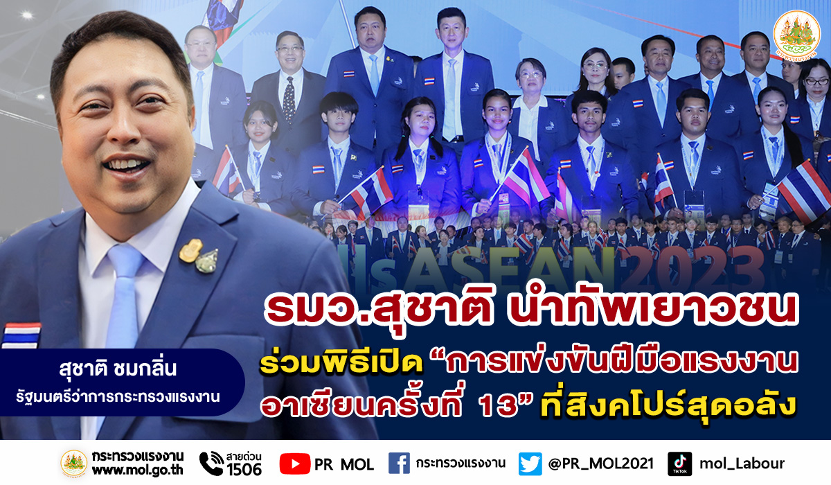 นายสุชาติ ชมกลิ่น รัฐมนตรีว่าการกระทรวงแรงงาน กล่าวว่า วันนี้ได้นำทีมเยาวชนไทยทั้ง 24 คน พร้อมด้วยคณะผู้บริหารสังกัดกระทรวงแรงงาน ผู้เชี่ยวชาญ ล่าม ผู้สังเกตการณ์ของประเทศไทย เข้าร่วมพิธีเปิดการแข่งขันฝีมือแรงงานอาเซียน ครั้งที่ 13 (World Skills ASEAN Singapore 2023) ในปีนี้สาธารณรัฐสิงคโปร์ ได้รับเกียรติเป็นเจ้าภาพจัดการแข่งขันฯ โดยมีนางฮาลิมา ยาขอบ (Mdm Halimah Yacob) ประธานาธิบดีแห่งสาธารณรัฐสิงคโปร์ เป็นประธานในพิธี ภายในพิธีเปิดมีการแสดงสุดอลังการ และมี นายนิรวิทย์ นนทะศิริ ตัวแทน Expert สาขาการเขียนแบบวิศวกรรมเครื่องกลด้วยคอมพิวเตอร์ จากประเทศไทย ให้สัตย์ปฏิญาณในการแข่งขัน โดยมีผู้เข้าร่วมแข่งขันจำนวน 180 คน ซึ่งเป็นตัวแทนจากประเทศสมาชิก 9 ใน 10 ประเทศ ประกอบด้วย สาธารณรัฐอินโดนีเซีย สาธารณรัฐฟิลิปปินส์ ประเทศมาเลเซีย สาธารณรัฐแห่งสหภาพเมียนมา สาธารณรัฐประชาธิปไตยประชาชนลาว สาธารณรัฐสังคมนิยมเวียดนาม ประเทศบรูไน ประเทศไทย และสาธารณรัฐสิงคโปร์ และผู้แทนประเทศร่วมพิธีเปิดรวมแล้วกว่า 500 คน