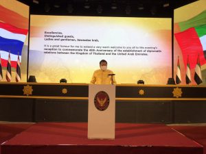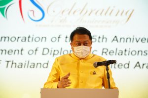 โดย นายสุชาติ กล่าวว่า ประเทศไทยและยูเออีสถาปนาความสัมพันธ์ทางการทูตกันมาตั้งแต่ปี 2518 แม้ไทยและยูเออีจะแตกต่างกันไม่ว่าจะเป็นภูมิหลังทางประวัติศาสตร์ วัฒนธรรม หรือขนาดประเทศและประชากร แต่ก็ไม่ได้เป็นอุปสรรคที่สองประเทศจะสร้างความสัมพันธ์ที่แน่นแฟ้นระหว่างกันได้ ความสัมพันธ์ระหว่างสองประเทศ มีพลวัตรในทุก ๆ ด้าน โดยเฉพาะความสัมพันธ์ด้านเศรษฐกิจ ด้านพลังงานและความสัมพันธ์ระหว่างประชาชนของทั้ง 2 ประเทศ ผมเชื่อเสมอในพลังของคน ซึ่งเป็นปัจจัยสำคัญที่จะช่วยขับเคลื่อนความสัมพันธ์ระหว่างรัฐกับรัฐ และเป็นพื้นฐานที่มั่นคงสำหรับการพัฒนาความร่วมมือระหว่างสองประเทศ ยูเออีถือเป็นบ้าน สถานศึกษา ที่สร้างอาชีพ และโอกาสสำหรับคนไทยกว่า 6,000 คน ที่อาศัยอยู่ในยูเออีอย่างร่มเย็นและเป็นสุข ในขณะเดียวกัน ไทยก็เป็นที่ที่คนยูเออีนิยมเดินทางไปท่องเที่ยวและรักษาพยาบาล โดยก่อนการแพร่ระบาดของโควิด มีคนยูเออีเดินทางไปไทยปีละกว่า 130,000 คน ทั้งนี้ ตั้งแต่วันที่ 1 พฤศจิกายน เป็นต้นมา ไทยได้เปิดรับนักท่องเที่ยวที่เดินทางมาจากยูเออีและฉีดวัคซีนครบ 2 โดสแล้วโดยไม่ต้องกักตัว ซึ่งเป็นที่น่าดีใจว่า ที่ผ่านมา นักท่องเที่ยวจากยูเออีติดลำดับ 1 ใน 5 ของนักท่องเที่ยวต่างชาติที่เดินทางมาไทยมากที่สุด ในนามของประเทศไทย ผมต้องขอขอบคุณนักท่องเที่ยวจากยูเออีที่ยังคิดถึงประเทศไทยและเชื่อมั่นในศักยภาพของรัฐบาลไทยในการรับมือกับปัญหาการแพร่ระบาดของโควิดและหวังเป็นอย่างยิ่งว่าประเทศไทยจะได้ต้อนรับนักท่องเที่ยวจากยูเออีเพิ่มมากขึ้นในอนาคต