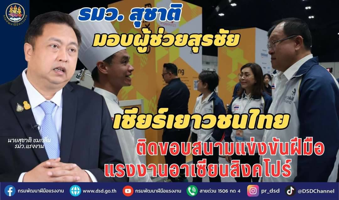 นายสุรชัย ชัยตระกูลทอง ผู้ช่วยรัฐมนตรีประจำกระทรวงแรงงาน เปิดเผยว่า ท่านสุชาติ ชมกลิ่น รัฐมนตรีว่าการกระทรวงแรงงาน มอบหมายให้ผมมาให้กำลังใจน้อง ๆ เยาวชนไทยที่เข้าร่วมการแข่งขันฝีมือแรงงานอาเซียน ครั้งที่ 13 ที่สาธารณรัฐสิงคโปร์ ในวันนี้และเดินเยี่ยมชมการแข่งขันที่เยาวชนไทยทั้ง 24 คนเข้าร่วมแข่งขัน จำนวน 12 สาขา ประกอบด้วย เขียนแบบวิศวกรรมเครื่องกลด้วยคอมพิวเตอร์ หุ่นยนต์เคลื่อนที่ เทคโนโลยีระบบทำความเย็น เทคโนโลยีระบบไฟฟ้าภายในอาคาร เมคคาทรอนิกส์ เทคโนโลยีเว็บ กราฟิกดีไซน์ แฟชั่นเทคโนโลยี แต่งผม ประกอบอาหาร เทคโนโลยียานยนต์ และบริการอาหารและเครื่องดื่ม
