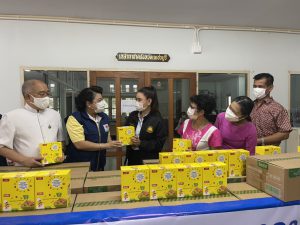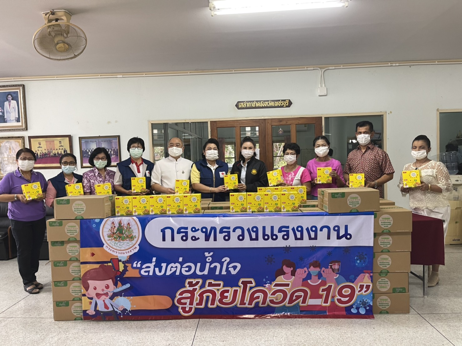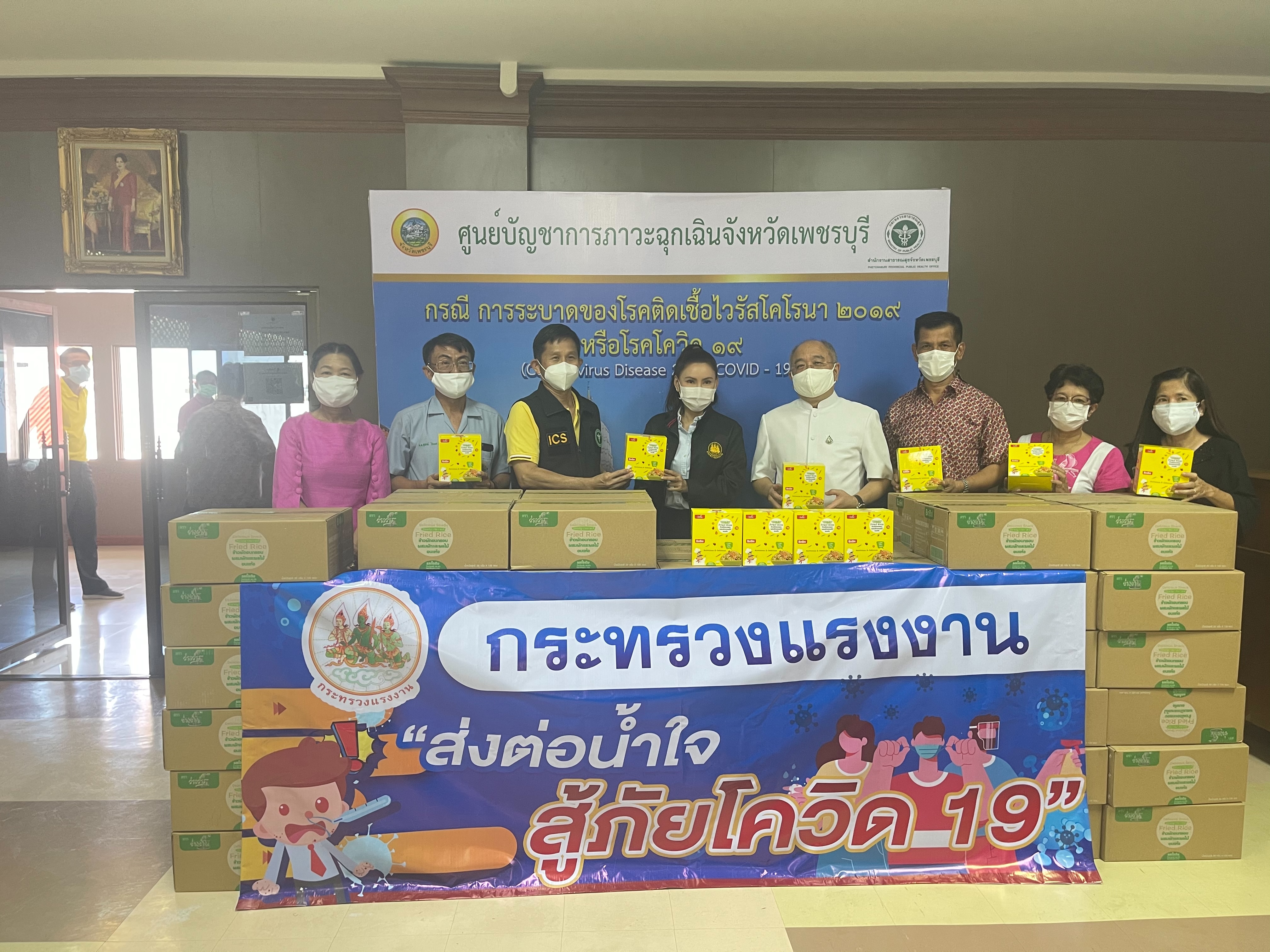 นายสุชาติ ชมกลิ่น รัฐมนตรีว่าการกระทรวงแรงงาน มอบหมายให้ นางธิวัลรัตน์ อังกินันทน์ ที่ปรึกษารัฐมนตรีว่าการกระทรวงแรงงาน ส่งมอบผลิตภัณฑ์อาหารอบแห้ง ตรา ว่าง ว่าง ผลิตภัณฑ์ของบริษัท ไบ่ ลี่ เอ็นเตอร์ไพร์ส จำกัด แก่เจ้าหน้าที่ผู้ปฏิบัติงานบุคลากรทางการแพทย์ จังหวัดเพชรบุรี