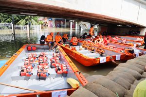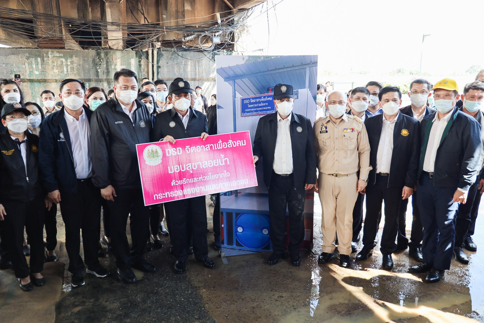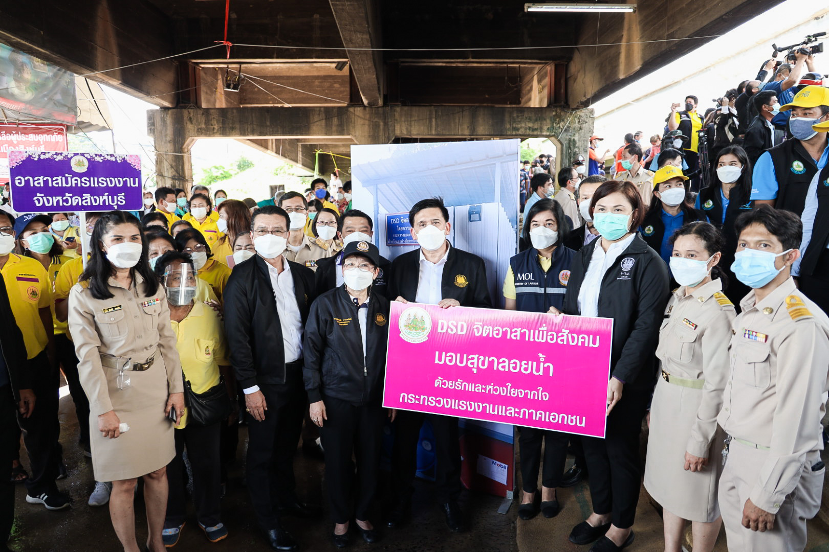 นายสุชาติ ชมกลิ่น รัฐมนตรีว่าการกระทรวงแรงงาน ได้ส่งมอบสุขาลอยน้ำ จำนวน 5 หลัง แก่นายกรัฐมนตรี เพื่อส่งมอบให้แก่ผู้ว่าราชการจังหวัดสิงห์บุรีได้นำไปช่วยเหลือผู้ประสบอุทกภัยเนื่องจากหลายพื้นที่น้ำท่วมสูงติดต่อกันหลายวัน ชาวบ้านใช้ชีวิตด้วยความยากลำบากกระทรวงแรงงาน โดยกรมพัฒนาฝีมือแรงงาน ได้จัดทำโครงการ DSD จิตอาสาเพื่อสังคม ด้วยรักและห่วงใยจากใจกระทรวงแรงงานและภาคเอกชน โดยได้รับความร่วมมือจากเครือข่ายพัฒนาฝีมือแรงงานที่สนับสนุนวัสดุอุปกรณ์ต่าง ๆ เพื่อให้กรมพัฒนาฝีมือแรงงานได้จัดทำสุขาลอยน้ำขึ้นมาส่งมอบให้กับจังหวัดต่าง ๆ ที่ประสบอุทกภัย เพื่อนำไปช่วยเหลือพี่น้องประชาชนที่ได้รับผลกระทบจากอุทกภัยต่อไป จุดที่สองที่บริเวณวัดเฉลิมมาศเพื่อตรวจสภาพพนังกั้นน้ำริมแม่น้ำเจ้าพระยา และจุดที่สามที่วิทยาลัยเทคนิคสิงห์บุรี ตำบลบางพุทธา อำเภอเมืองสิงห์บุรีจังหวัดสิงห์บุรี เพื่อเป็นประธานในพิธีเปิดโครงการ “ส่งสุขภาพดีให้คนไทย จากใจไปรษณีย์ไทย” โดยนายกรัฐมนตรีกดปุ่มปล่อยโดรนสำหรับนำจ่ายกล่องยาไปยังบ้านผู้ประสบภัย