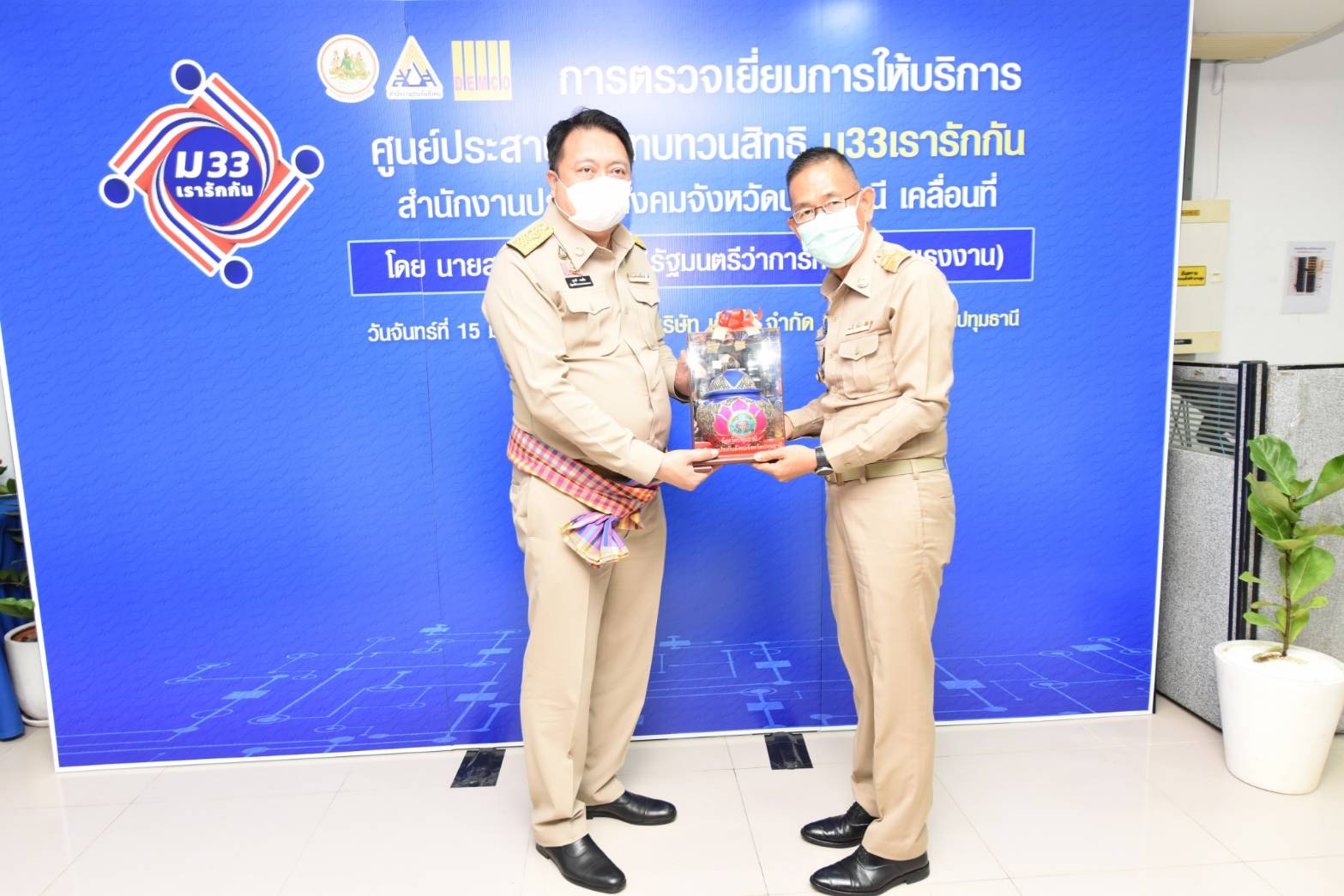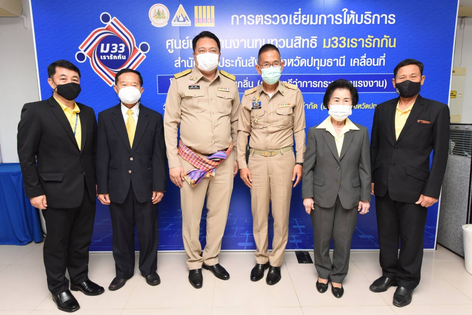 เมื่อวันที่ 15 มีนาคม 2564 นายสุชาติ ชมกลิ่น รัฐมนตรีว่าการกระทรวงแรงงาน เป็นประธานการตรวจเยี่ยมการให้บริการศูนย์ประสานงานทบทวนสิทธิโครงการ ม33เรารักกัน ณ สำนักงานประกันสังคมจังหวัดปทุมธานี ตำบลบ้านกลางอำเภอเมือง จังหวัดปทุมธานี และศูนย์ประสานงานทบทวนสิทธิโครงการ ม33เรารักกันสำนักงานประกันสังคมจังหวัดปทุมธานีเคลื่อนที่ ณ บริษัท เด็มโก้ จำกัด (มหาชน) ตำบลสวนพริกไทย อำเภอเมือง จังหวัดปทุมธานี โดยมี นายสุรชัย ชัยตระกูลทอง ผู้ช่วยรัฐมนตรีประจำกระทรวงแรงงาน นางธิวัลรัตน์ อังกินันทน์ ที่ปรึกษารัฐมนตรีว่าการกระทรวงแรงงาน นายสุเทพ ชิตยวงษ์ เลขานุการรัฐมนตรีว่าการกระทรวงแรงงาน พล.ต.ต.นันทชาติ ศุภมงคล ประจำสำนักเลขาธิการนายกรัฐมนตรี ปฎิบัติหน้าที่ประจำกระทรวงแรงงาน นายสุทธิ สุโกศล ปลัดกระทรวงแรงงาน นายชัยวัฒน์ ชื่นโกสุม ผู้ว่าราชการจังหวัดปทุมธานี นางประพีร์ ปุ้ยพันธวงศ์ ประธานกรรมการบริษัท เด็มโก้ จำกัด (มหาชน) พร้อมด้วยผู้บริหารระดับสูงกระทรวงแรงงาน เข้าร่วมในครั้งนี้ด้วย โดยรัฐมนตรีว่าการกระทรวงแรงงาน กล่าวว่า ตามที่รัฐบาล ภายใต้การนำของ พล.อ.ประยุทธ์ จันทร์โอชา นายกรัฐมนตรีและรัฐมนตรีว่าการกระทรวงกลาโหม และกระทรวงแรงงานภายใต้การกำกับดูแลของ พล.อ.ประวิตร วงษ์สุวรรณ รองนายกรัฐมนตรี ได้ให้ความสำคัญในการช่วยเหลือเยียวยาแบ่งเบาภาระค่าครองชีพของผู้ประกันตนมาตรา 33 ให้ได้รับสิทธิคนละ 4,000 บาท และให้ลงทะเบียนผ่านเว็บไซต์ www.ม33เรารักกัน.com ตั้งแต่วันที่ 21 ก.พ. – 7 มี.ค.64 และมีผู้ลงทะเบียนทั้งสิ้นจำนวน 8,208,286 คน ซึ่งมีการตรวจสอบข้อมูลประมวลผลและคัดกรองผู้ที่ได้รับสิทธิตั้งแต่วันที่ 8-14 มี.ค.64