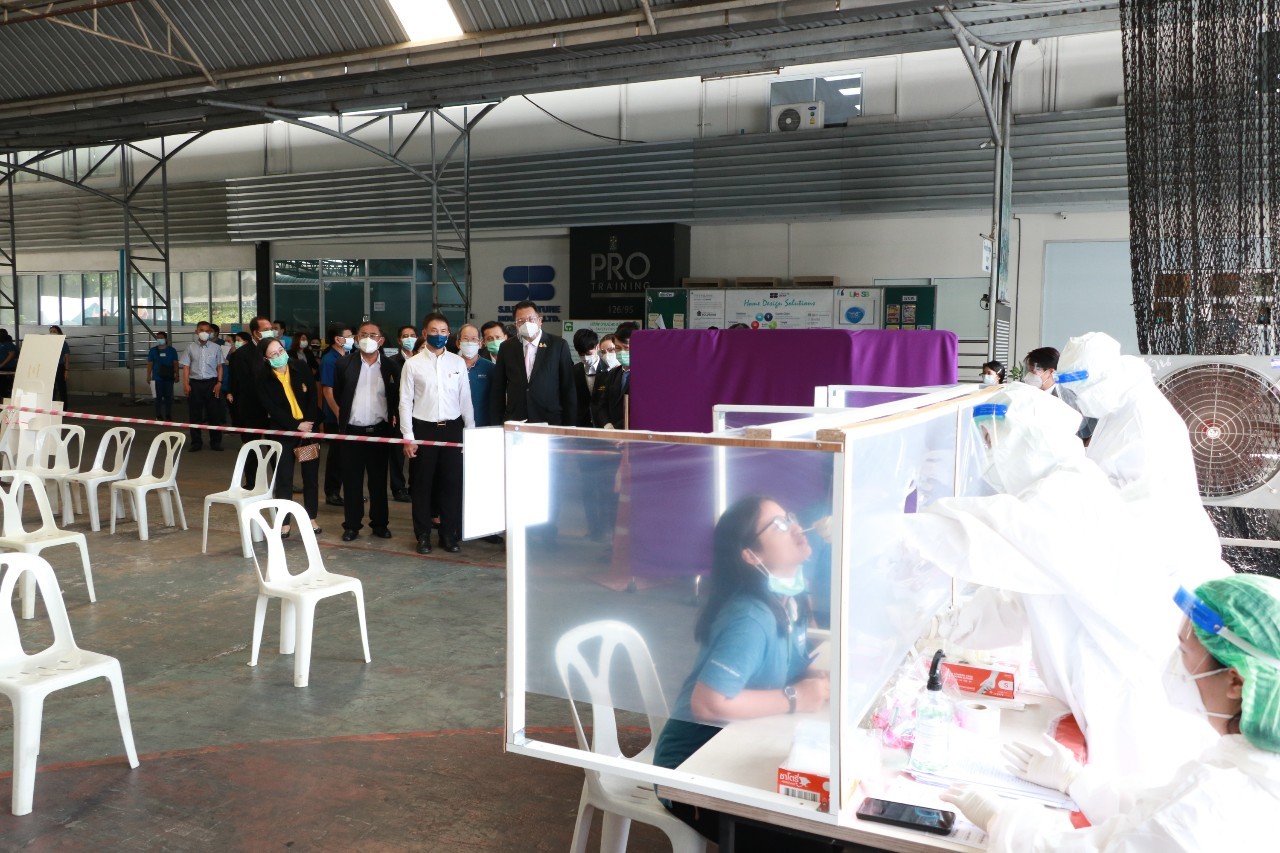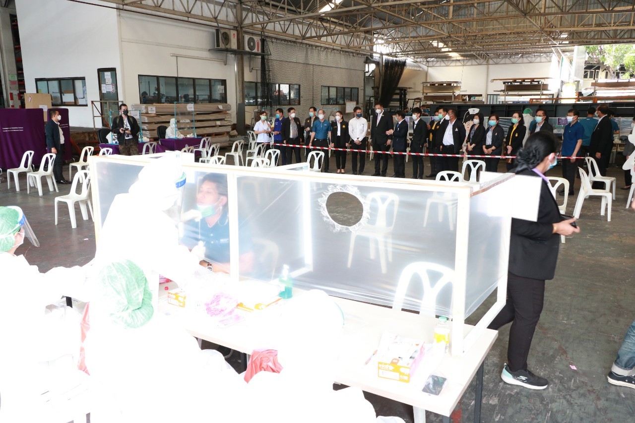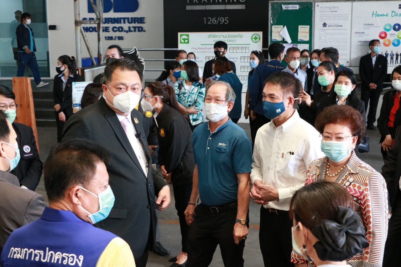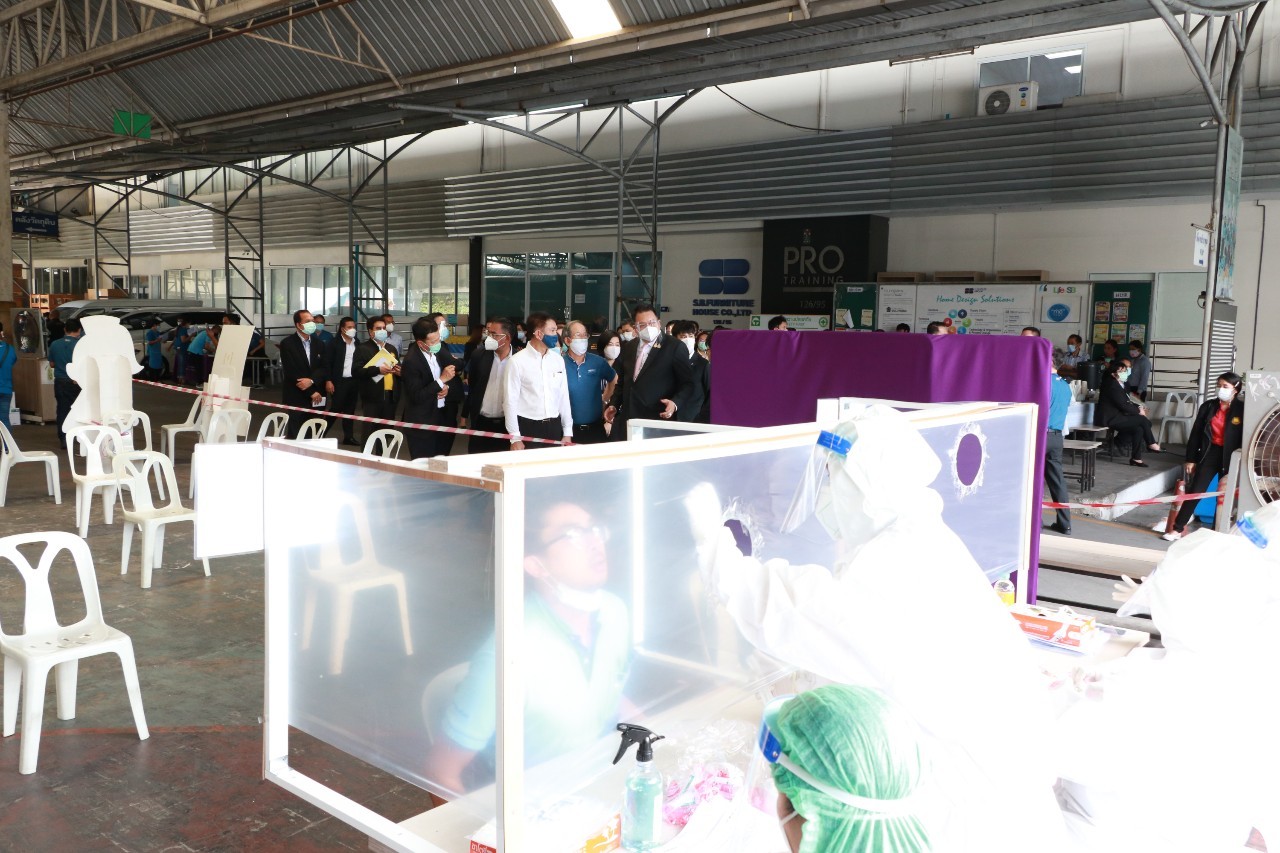 นายสุชาติ ชมกลิ่น รัฐมนตรีว่าการกระทรวงแรงงาน นำคณะลงพื้นที่นนทบุรีตรวจเยี่ยมให้กำลังใจและมอบสิ่งของแก่ลูกจ้างที่ตรวจโควิด-19 เชิงรุกเพื่อผู้ประกันตนในสถานประกอบการ ณ บริษัทแห่งหนึ่ง