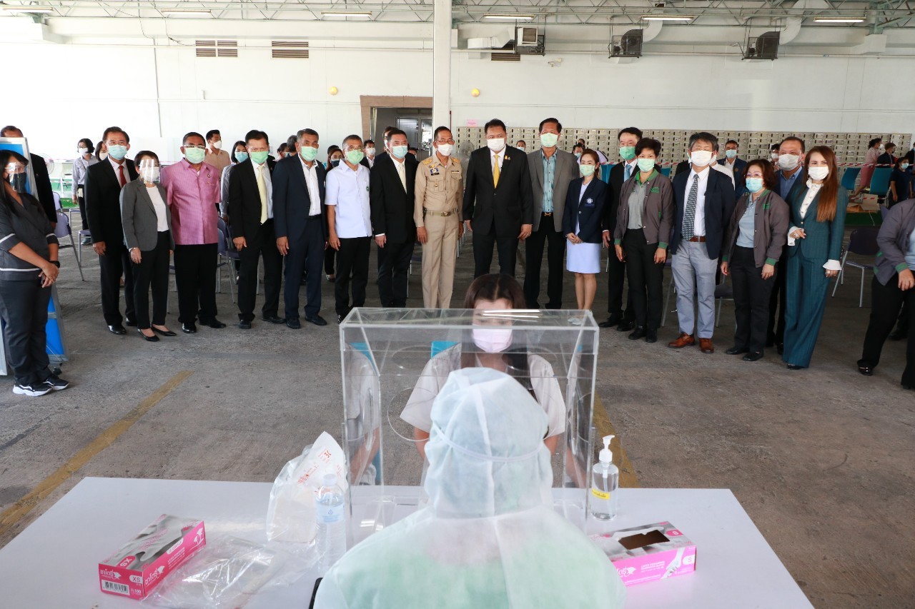 นายสุชาติ กล่าวต่อว่า การจัดงานในวันนี้ผมต้องขอขอบคุณผู้ประกอบการ ในการอนุเคราะห์ด้านสถานที่ในการตรวจคัดกรองฯ และการประชาสัมพันธ์แก่สถานประกอบการในสวนอุตสาหกรรม การดำเนินการตรวจคัดกรองโควิด-19 เชิงรุกในสถานประกอบการแก่ลูกจ้างภายในบริษัทฯ ซึ่งสำนักงานประกันสังคมจังหวัดปทุมธานี ได้ร่วมมือกับโรงพยาบาลการุณเวช ปทุมธานี สำนักงานสาธารณสุขจังหวัด เพื่อบูรณาการทำงานเชิงรุก จัดรถโมบาย ตู้ตรวจโรคไปตั้งยังสถานประกอบการให้ลูกจ้างที่เข้าข่ายกลุ่มเสี่ยงความร่วมมือจากสถานพยาบาล ต่อการสัมผัสเชื้อได้รับการตรวจคัดกรองหาเชื้อโควิด-19 เพื่อให้ทราบผลภายใต้ 24-48 ชั่วโมง โดยบริษัทแห่งนี้ เป็นสถานประกอบการหนึ่งที่อยู่ในแผนการตรวจ มีเป้าหมายผู้ประกันตนที่เข้ารับการตรวจ จำนวน 3,205 คน ซึ่งหากตรวจพบเชื้อก็จะต้องเข้าสู่กระบวนการควบคุมดูแลรักษาตามที่กระทรวงสาธารณสุขกำหนด โดยลูกจ้างในสถานประกอบการไม่ต้องเสียค่าใช้จ่ายในการตรวจ