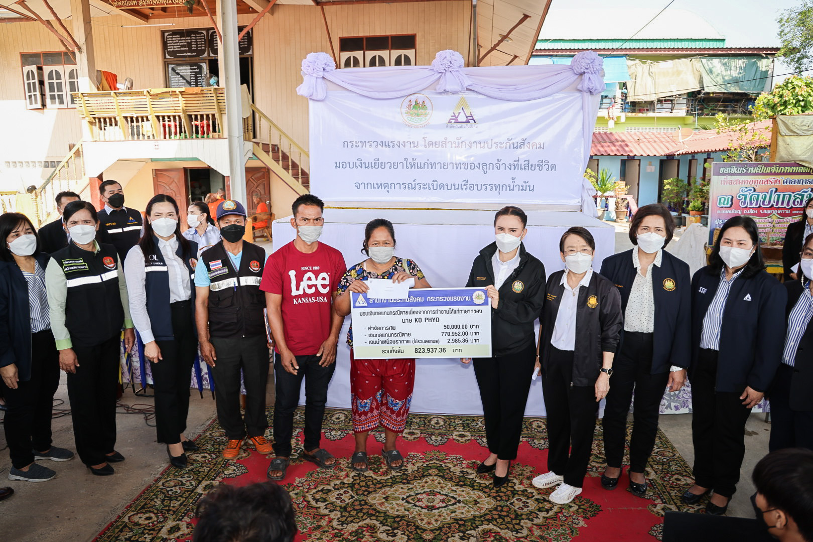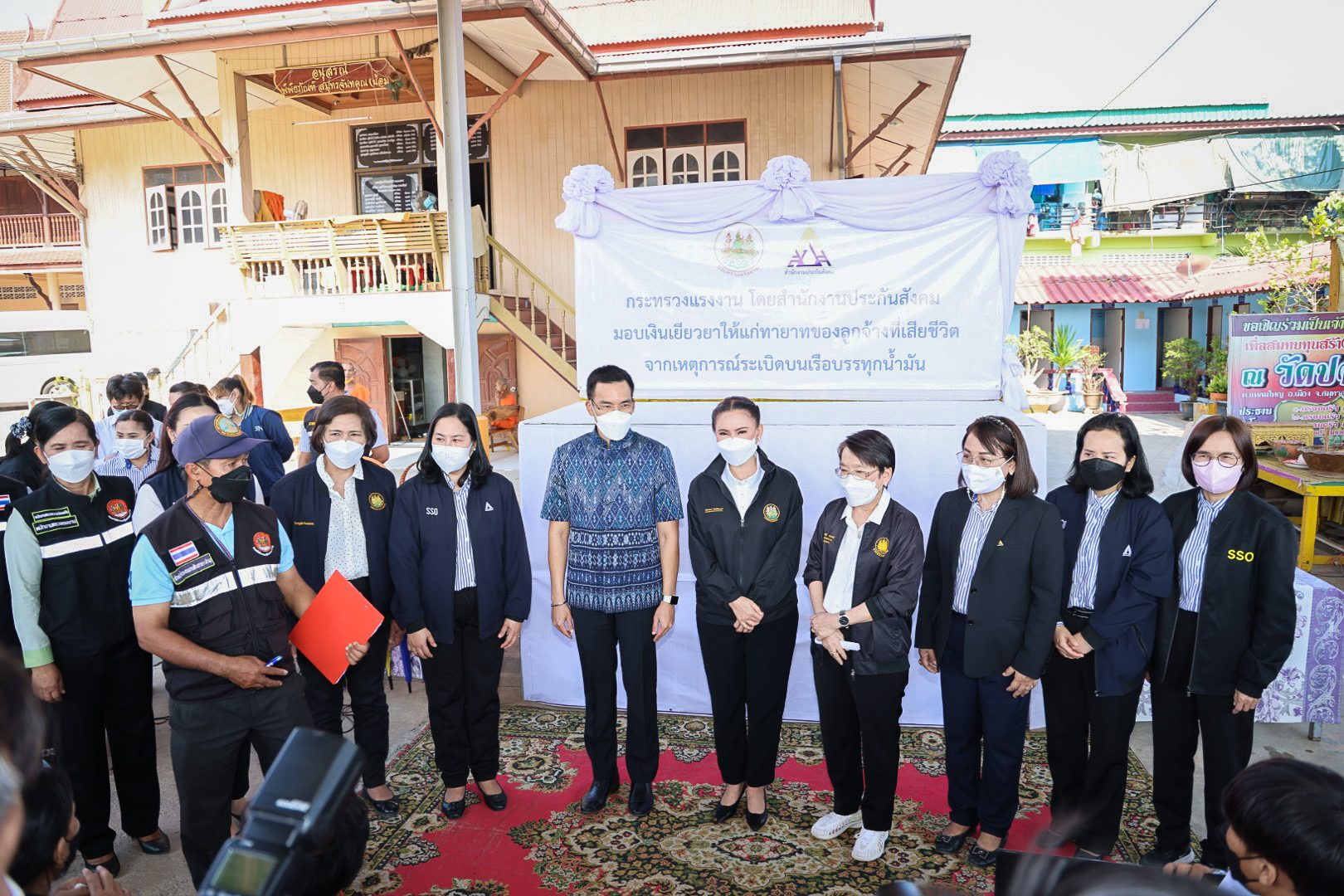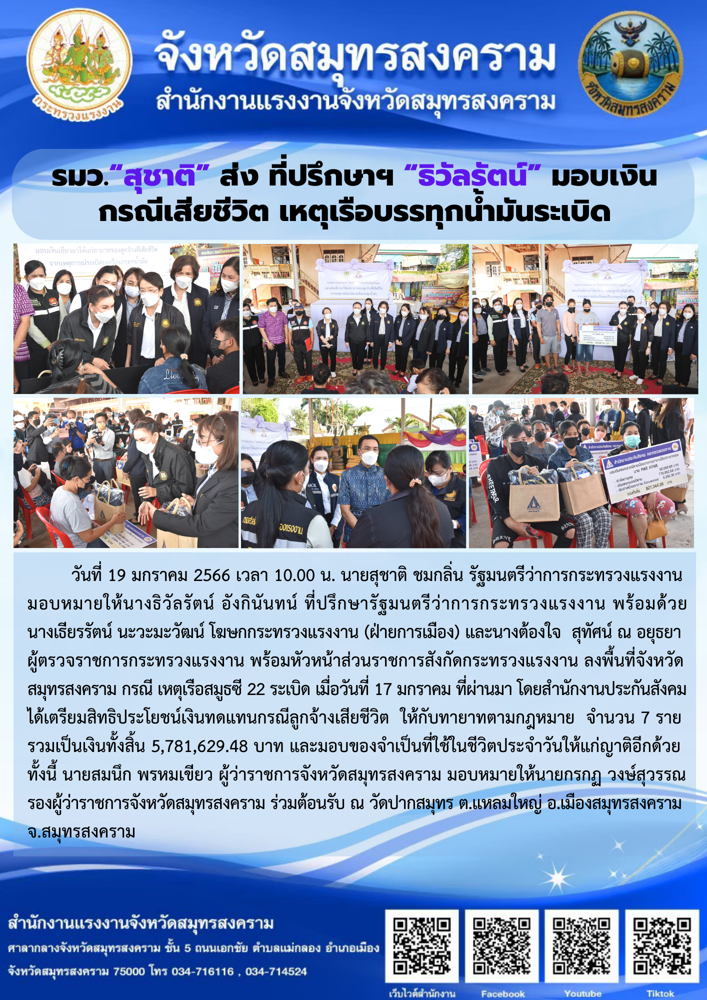 วันที่ 19 มกราคม 2566 เวลา 10.00 น. นายสุชาติ ชมกลิ่น รัฐมนตรีว่าการกระทรวงแรงงาน มอบหมายให้นางธิวัลรัตน์ อังกินันทน์ ที่ปรึกษารัฐมนตรีว่าการกระทรวงแรงงาน พร้อมด้วย นางเธียรรัตน์ นะวะมะวัฒน์ โฆษกกระทรวงแรงงาน (ฝ่ายการเมือง) และนางต้องใจ สุทัศน์ ณ อยุธยา ผู้ตรวจราชการกระทรวงแรงงาน พร้อมหัวหน้าส่วนราชการสังกัดกระทรวงแรงงาน ลงพื้นที่จังหวัดสมุทรสงคราม กรณี เหตุเรือสมูธซี 22 ระเบิด เมื่อวันที่ 17 มกราคม ที่ผ่านมา โดยสำนักงานประกันสังคม ได้เตรียมสิทธิประโยชน์เงินทดแทนกรณีลูกจ้างเสียชีวิต ให้กับทายาทตามกฎหมาย จำนวน 7 ราย รวมเป็นเงินทั้งสิ้น 5,781,629.48 บาท และมอบของจำเป็นที่ใช้ในชีวิตประจำวันให้แก่ญาติอีกด้วย ทั้งนี้ นายสมนึก พรหมเขียว ผู้ว่าราชการจังหวัดสมุทรสงคราม มอบหมายให้นายกรกฏ วงษ์สุวรรณรองผู้ว่าราชการจังหวัดสมุทรสงคราม ร่วมต้อนรับ ณ วัดปากสมุทร ต.แหลมใหญ่ อ.เมืองสมุทรสงคราม จ.สมุทรสงคราม