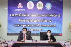 วันนี้ (11 มิถุนายน 2564) เวลา 14.00 น. ที่ห้องประชุม อก.1 ชั้น 2 อาคารสำนักงานปลัดกระทรวงอุตสาหกรรม นายสุชาติ ชมกลิ่น รัฐมนตรีว่าการกระทรวงแรงงาน พร้อมด้วย นายสุริยะ จึงรุ่งเรืองกิจ รัฐมนตรีว่าการกระทรวงอุตสาหกรรม เป็นประธานการประชุมหารือมาตรการป้องกันและควบคุมการแพร่ระบาดของโควิด-19 ในสถานประกอบกิจการโรงงาน ผ่านสื่ออิเล็กทรอนิกส์ (VDO Conference) โดยมี นายสุรชัย ชัยตระกูลทอง ผู้ช่วยรัฐมนตรีประจำกระทรวงแรงงาน นางธิวัลรัตน์ อังกินันทน์ ที่ปรึกษารัฐมนตรีว่าการกระทรวงแรงงาน นายสุเทพ ชิตยวงษ์ เลขานุการรัฐมนตรีว่าการกระทรวงแรงงาน นายสุทธิ สุโกศล ปลัดกระทรวงแรงงาน นายสุพันธุ์ มงคลสุธี ประธานสภาอุตสาหกรรมแห่งประเทศไทย นายสนั่น อังอุบลกุล ประธานกรรมการหอการค้าไทย และสภาหอการค้าแห่งประเทศไทย เข้าร่วมในครั้งนี้ด้วย โดย รมว.แรงงาน กล่าวว่า รัฐบาล ภายใต้การนำของ พล.อ.ประยุทธ์ จันทร์โอชา นายกรัฐมนตรี และ รมว.กลาโหม กระทรวงแรงงานภายใต้การกำกับดูแลของ พล.อ.ประวิตร วงษ์สุวรรณ รองนายกรัฐมนตรี มีความห่วงใยพี่น้องแรงงานในสถานประกอบกิจการโรงงานจากการแพร่ระบาดของโรคโควิด -19 ซึ่งรัฐบาล โดยศูนย์บริหารสถานการณ์โควิด-19 (ศบค.) ได้มอบหมายกระทรวงอุตสาหกรรมและกระทรวงแรงงาน เป็นเจ้าภาพ ในการขับเคลื่อนมาตรการป้องกันและควบคุมการแพร่ระบาดของโควิด-19 สถานประกอบกิจการโรงงาน ทั้งในและนอกนิคมอุตสาหกรรม