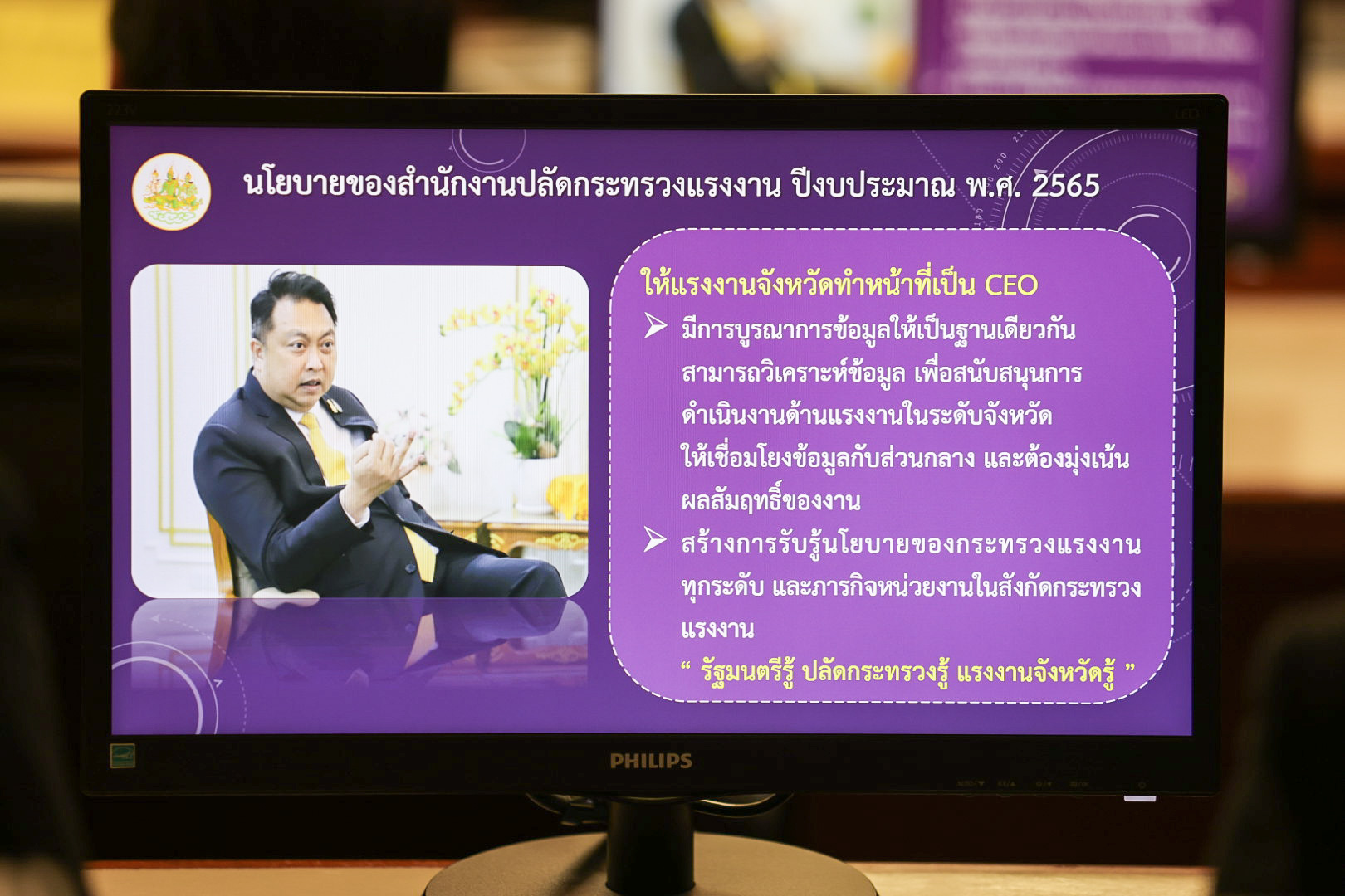เมื่อวันที่ 24 พฤศจิกายน 2564 นายสุชาติ ชมกลิ่น รัฐมนตรีว่าการกระทรวงแรงงาน เป็นประธานการประชุมมอบนโยบายกระทรวงแรงงาน ปีงบประมาณ พ.ศ. 2565 ณ ห้องประชุมชั้น5 อาคารกระทรวงแรงงาน โดยมี นายสุรชัย ชัยตระกูลทอง ผู้ช่วยรัฐมนตรีประจำกระทรวงแรงงาน นายพรศักดิ์ เจริญประเสริฐ ผู้ช่วยรัฐมนตรีประจำนายกรัฐมนตรี ปฏิบัติหน้าที่ประจำกระทรวงแรงงาน นางธิวัลรัตน์ อังกินันทน์ ที่ปรึกษารัฐมนตรีว่าการกระทรวงแรงงาน นายสุเทพชิตยวงษ์ เลขานุการรัฐมนตรีว่าการกระทรวงแรงงาน พล.ต.ต.นันทชาติ ศุภมงคล ประจำสำนักเลขาธิการนายกรัฐมนตรี ปฏิบัติหน้าที่ประจำกระทรวงแรงงาน นางเธียรรัตน์ นะวะมะวัฒน์โฆษกกระทรวงแรงงาน (ฝ่ายการเมือง) นายบุญชอบ สุทธมนัสวงษ์ ปลัดกระทรวงแรงงาน พร้อมด้วยผู้บริหารระดับสูงกระทรวงแรงงาน เข้าร่วมในครั้งนี้ด้วย โดย รมว.แรงงาน กล่าวว่าขอขอบคุณผู้บริหาร ข้าราชการ และเจ้าหน้าที่กระทรวงแรงงานทุกท่าน ใน 1 ปีที่ผ่านมา ได้รับความร่วมมือเป็นอย่างดี จากทุกท่านทุกกรมของหน่วยงานในการทำงานเพื่อช่วยเหลือพี่น้องแรงงาน ผู้ประกอบการที่ให้ความช่วยเหลือผู้ได้รับผลกระทบจากโรคโควิด-19 และภาวะทางเศรษฐกิจที่ถดถอย จนกระทั่งสามารถผ่านพ้นวิกฤตที่สำคัญ เป็นที่ประจักษ์ตามนโยบายกระทรวงแรงงาน ผมขอมอบนโยบายกระทรวงแรงงาน ปีงบประมาณ พ.ศ. 2565 ดังนี้สำนักงานปลัดกระทรวงแรงงาน ให้แรงงานจังหวัดเป็น CEO ในการขับเคลื่อนงานระดับจังหวัดในทุกมิติ มีการบูรณาการข้อมูลให้เป็นฐานเดียวกัน สามารถวิเคราะห์ข้อมูลเพื่อสนับสนุนการดำเนินงานด้านแรงงานระดับจังหวัดและเชื่อมโยงกับส่วนกลาง มุ่งเน้นผลสัมฤทธิ์ของงาน สร้างการรับรู้นโยบายในทุกระดับและภารกิจของทุกหน่วยงาน “รัฐมนตรีรู้ ปลัดกระทรวงรู้ แรงงานจังหวัดรู้”อาสาสมัครแรงงานและบัณฑิตแรงงาน เป็นกลไกสำคัญในการขับเคลื่อนภารกิจของกระทรวงแรงงาน ให้สร้างความเข้มแข็งของเครือข่ายในรูปแบบที่เหมาะสม เช่น จัดตั้งกลุ่มไลน์แรงงานจังหวัดระดับภาคเพื่อเชื่อมโยงการทำงาน, การตั้งกลุ่มไลน์อาสาสมัครแรงงานและบัณฑิตแรงงาน เป็นต้น การใช้ช่องทางการสื่อสารจาก Social Media ที่มีความเหมาะสมและทันต่อสถานการณ์ เพื่อแลกเปลี่ยนข้อมูลและสามารถใช้ประโยชน์ในการทำงานแบบเครือข่ายไยแมงมุม ให้อัครทูตที่ปรึกษาฝ่ายแรงงาน ทำการขยายตลาดแรงงานในต่างประเทศแก่แรงงานไทยในต่างประเทศ เพื่อสร้างรายได้กลับประเทศไทย โครงการแก้ไขปัญหาความเดือดร้อนด้านอาชีพ สามารถนำเงินลงในระบบเศรษฐกิจเพื่อขับเคลื่อนประเทศ ในปี 2565 ขอให้ดำเนินการ