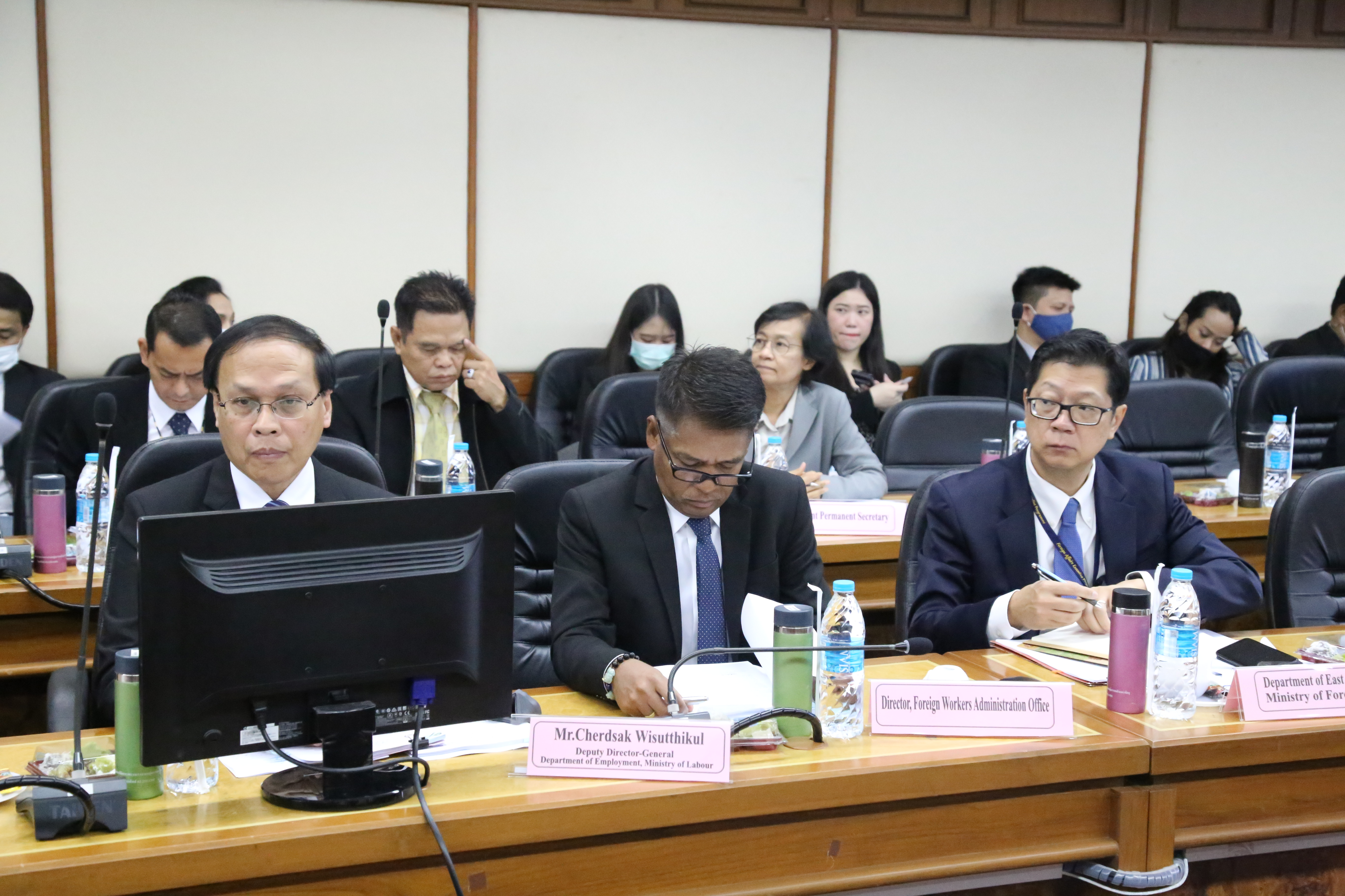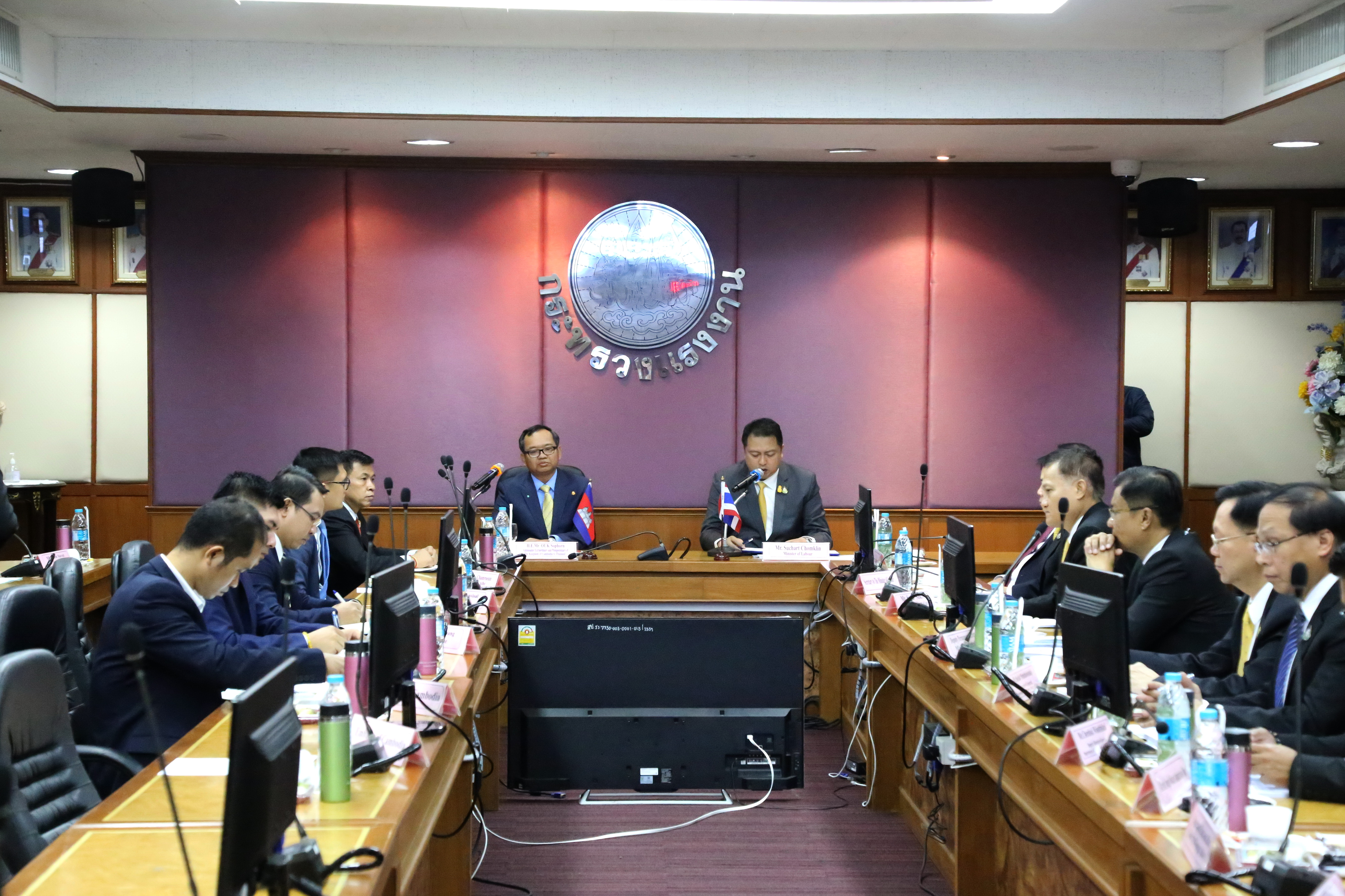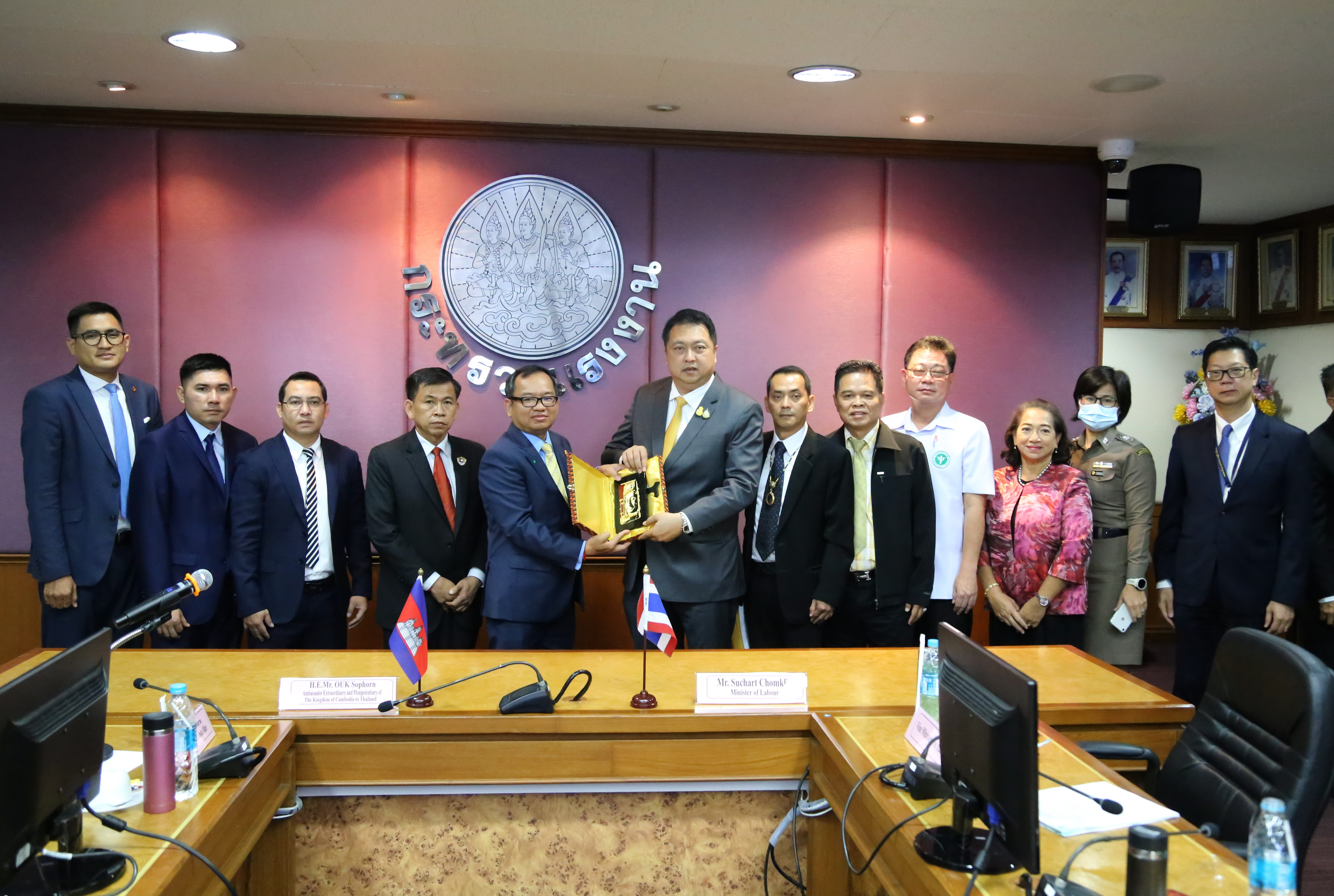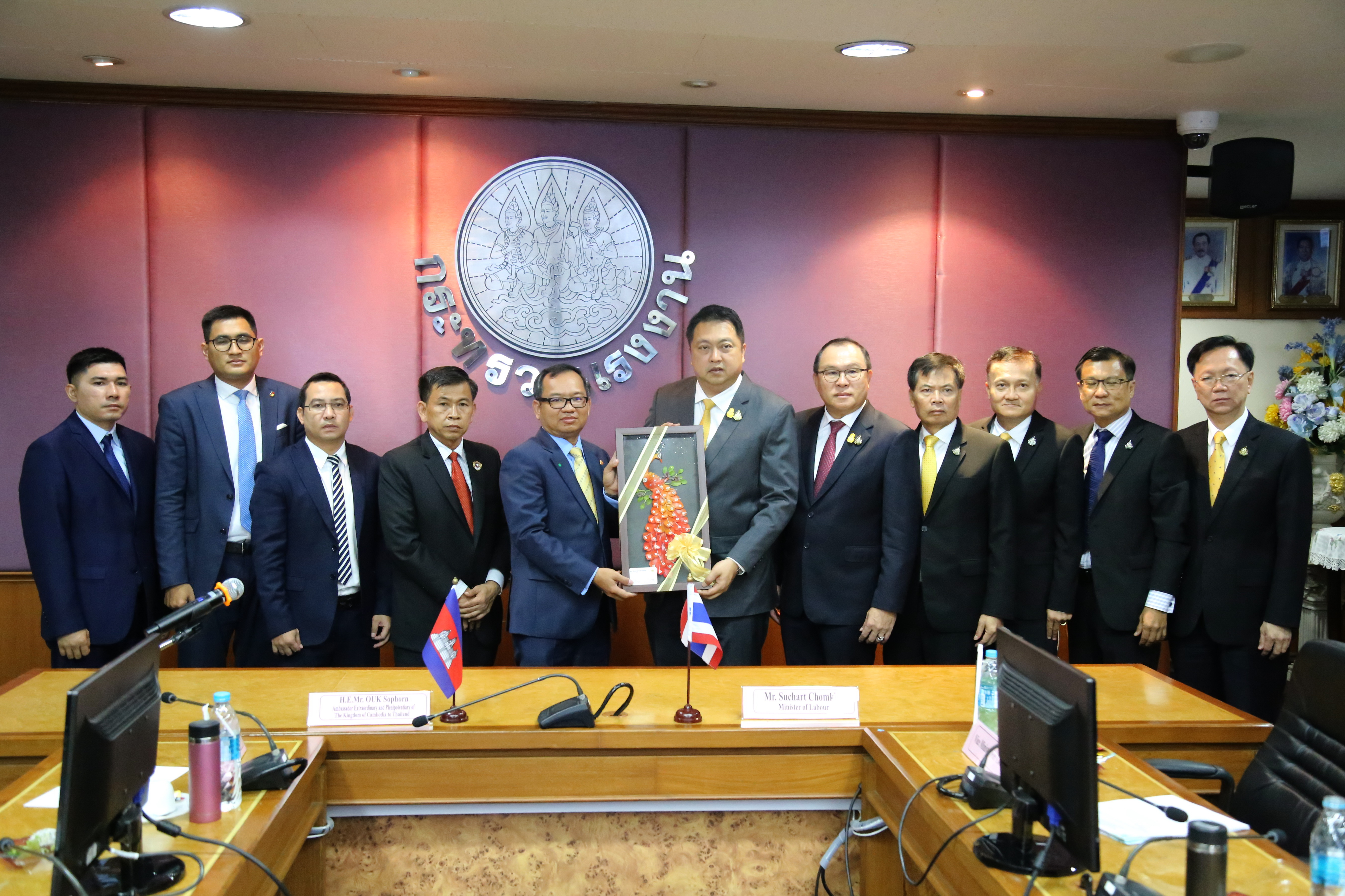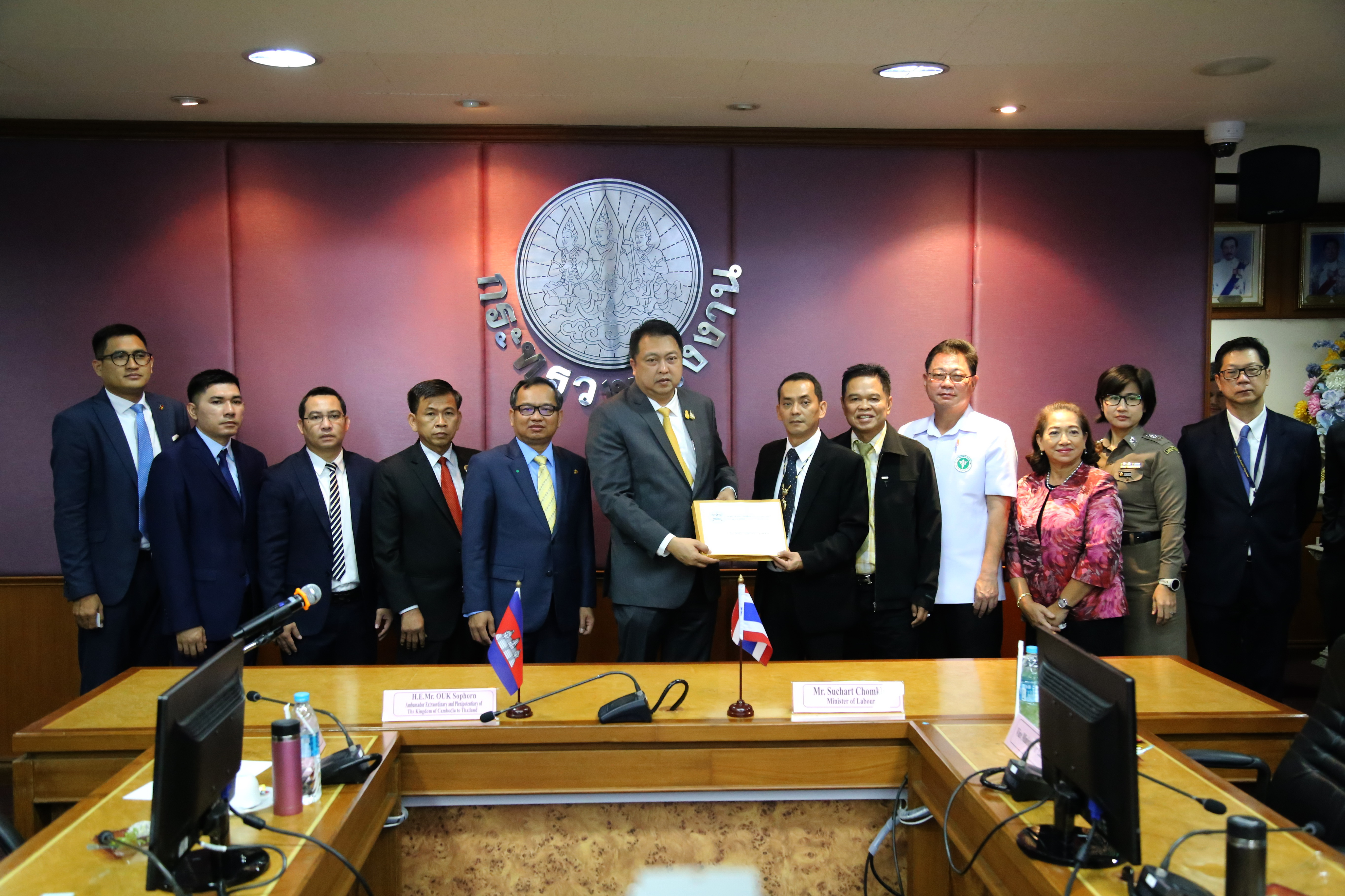 เมื่อวันที่ 2 ตุลาคม 2563 นายสุชาติ ชมกลิ่น รัฐมนตรีว่าการกระทรวงแรงาน ให้การต้อนรับ นายอูก ซอร์พวน (H.E. Mr.Ouk Sorphorn) เอกอัครราชทูตอาณาจักรกัมพูชาประจำประเทศไทย ในโอกาสเข้าพบรัฐมนตรีว่าการกระทรวงแรงงาน เพื่อเยี่ยมคารวะและหารือประเด็นการนำเข้าแรงงานกัมพูชามาเก็บลำไยในจังหวัดจันทบุรี ณ ห้องประชุมประสงค์ รณะนันท์น ชั้น 5 อาคารกระทรวงแรงงาน โดยมี นายสุรชัย ชัยตระกูลทอง ผู้ช่วยรัฐมนตรีประจำกระทรวงแรงาน นายสุเทพ ชิตยวงษ์ เลขานุการรัฐมนตรีว่าการกระทรวงแรงงาน และนายสุทธิ สุโกศล ปลัดกระทรวงแรงงาน และหน่วยงานที่เกี่ยวข้องภาครัฐและเอกชน ได้แก่ กระทรวงมหาดไทย กระทรวงการต่างประเทศ นายแพทย์สาธารณสุขจังหวัดจันทบุรี สมาคมการค้าและการท่องเที่ยวชายแดนไทย – กัมพูชา และสมาคมชาวสวนลำไยจันทบุรี เข้าร่วมในครั้งนี้ด้วย โดยที่ประชุมได้ขอให้ฝ่ายกัมพูชาดำเนินการเร่งรัดให้แรงงานที่ใช้บัตรผ่านแดน (Border Pass) จำนวน 500 คน เดินทางเข้ามาทำงานโดยเร็ว และดำเนินการแก้ไขร่างบันทึกข้อตกลงว่าด้วยการจ้างแรงงานระหว่างรัฐบาลแห่งราชอาณาจักรไทยกับรัฐบาลแห่งราชอาณาจักรกัมพูชา เพื่อกำหนดให้มีการจ้างงานระยะสั้นได้