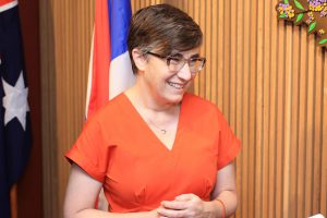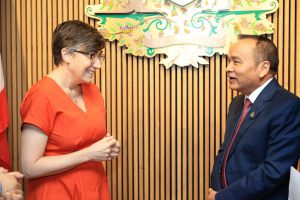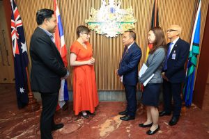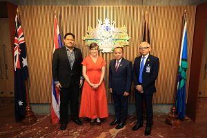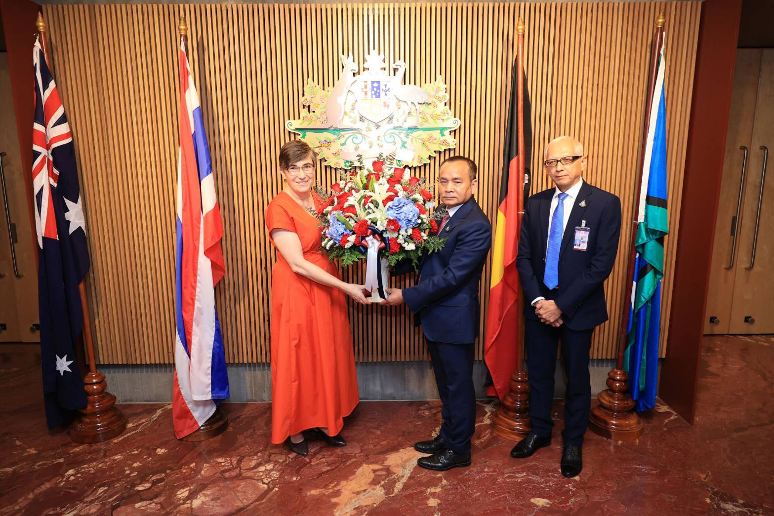 On January 25, 2024, at 11.00 hours, the Labour Minister, Mr. Phiphat Ratchakitprakarn, assigned the Secretariat to the Labour Minister, Mr. Aree Krainara, as a representative to present flowers in congratulating H.E. Ms. Angela Macdonald, Ambassador of Australia to Thailand, on the occasion of Australia Day. The occasion took place at the Australian Embassy in Thailand.