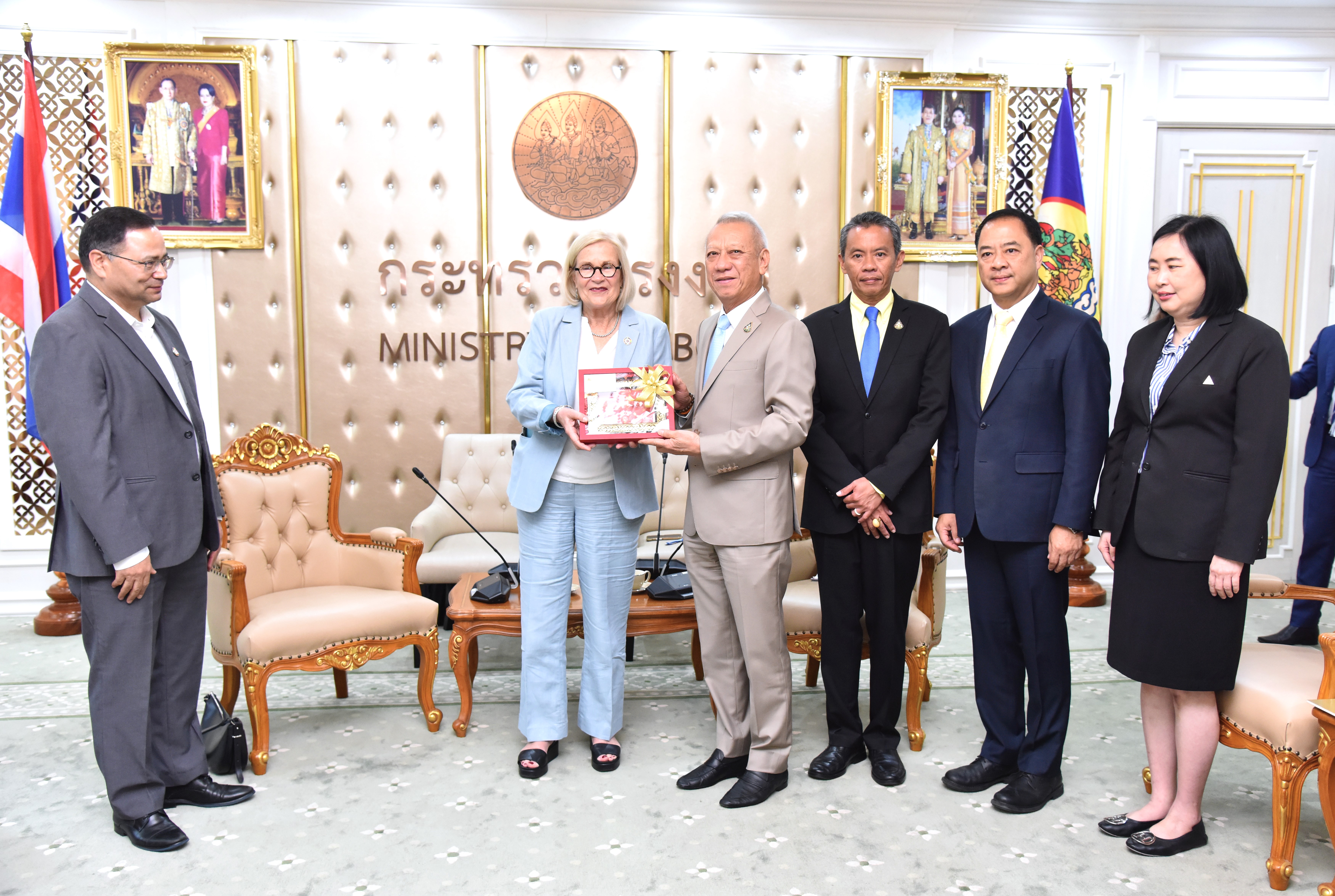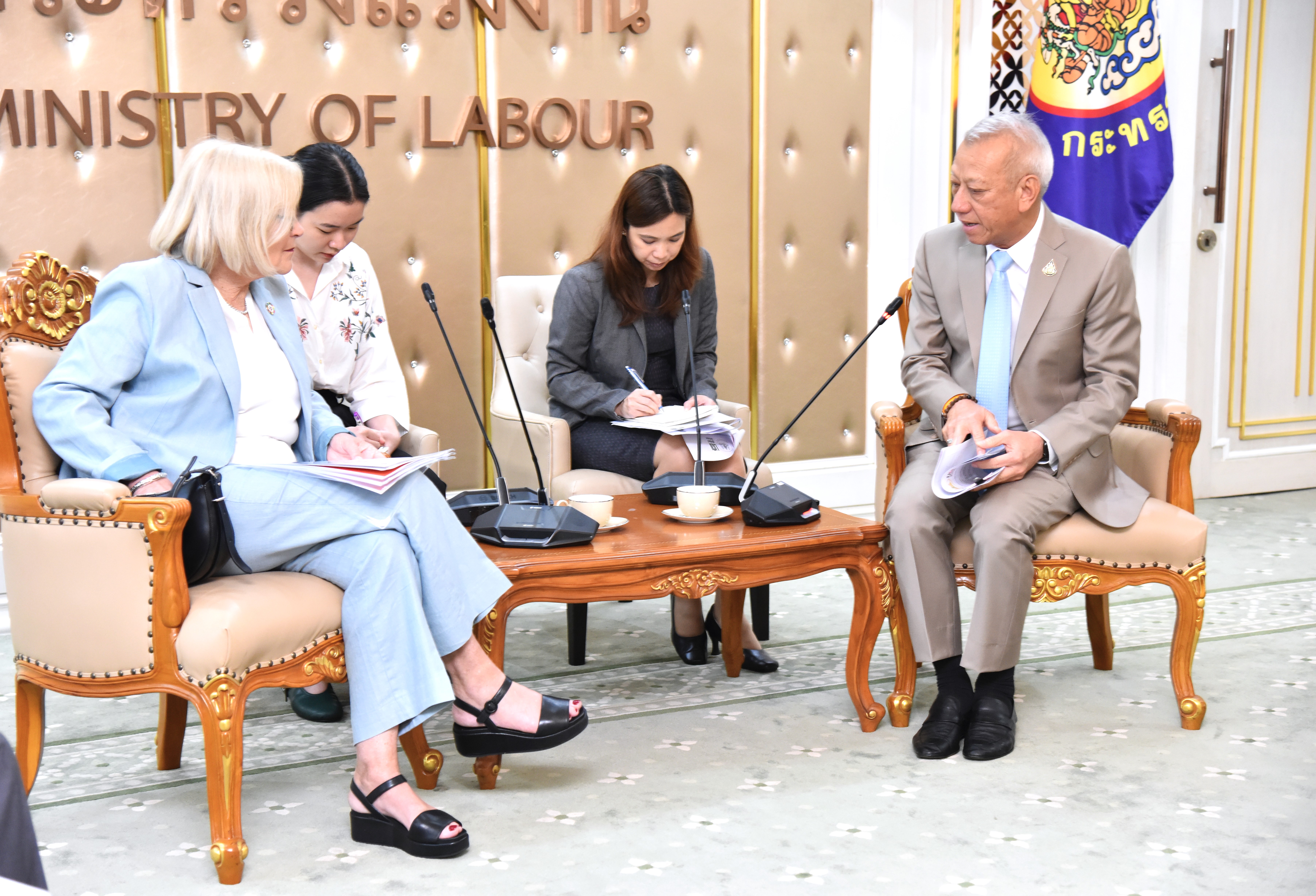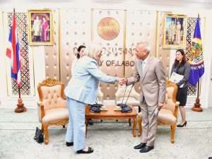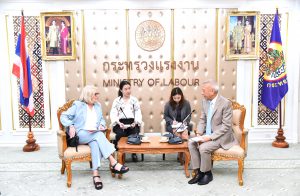 On April 30, 2024, at 13.30 hours, the Labour Minister, Mr. Phiphat Ratchakitprakarn, from the Prime Minister’s Secretariat’s Office, performing duties for the Ministry of Labour, Mr. Phuchong Worasri, the Ministry of Labour’s Inspector-General, Mr. Samat Pattamasukon, and the Ministry of Labour’s executives welcomed the Secretary General of the UNI Global Union, Ms. Christy Hoffman, and the Secretary General of the UNI Asia & Pacific, Mr. Rajendra Acharya, at the Chatumongkol Room, 6th floor, Ministry of Labour.
