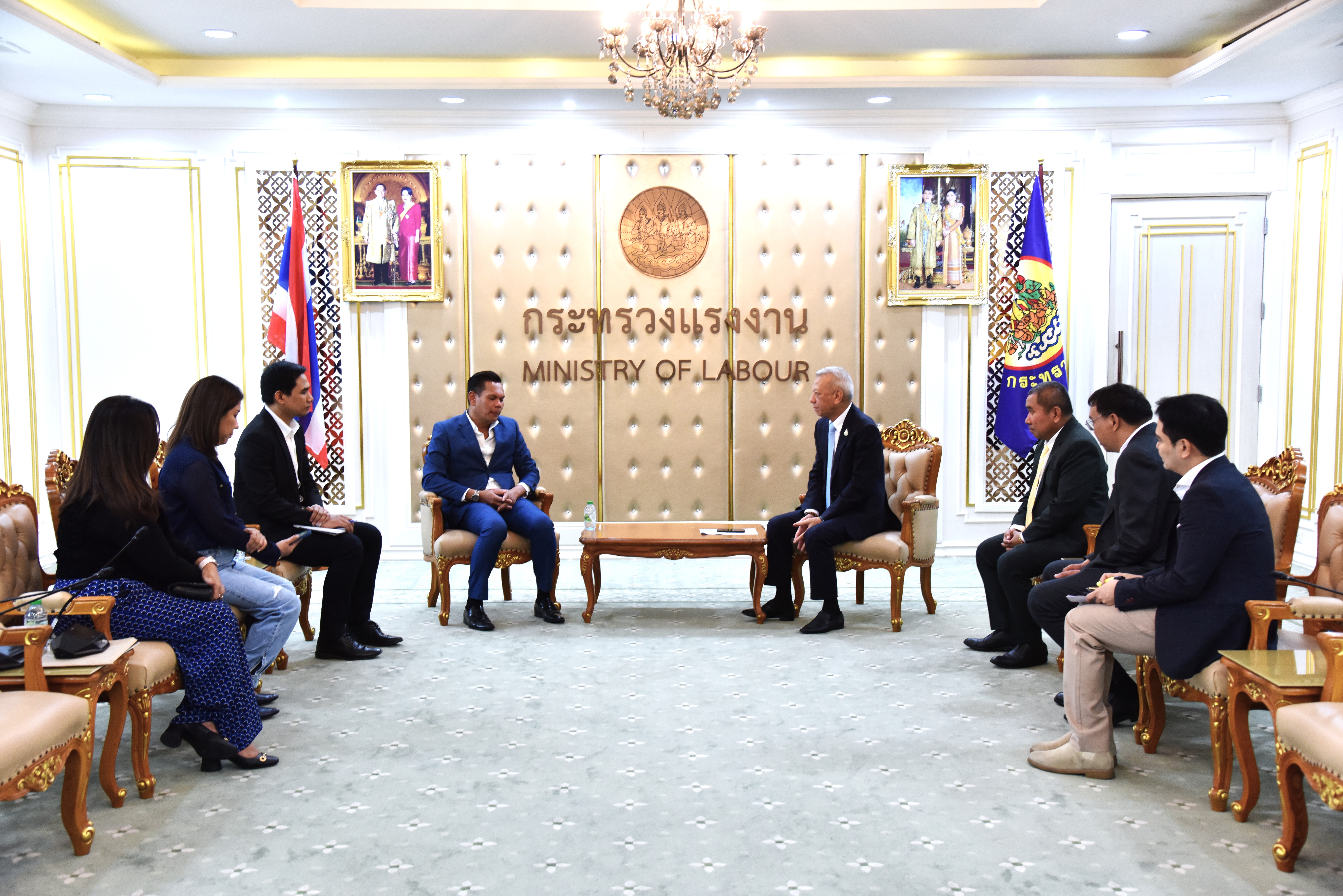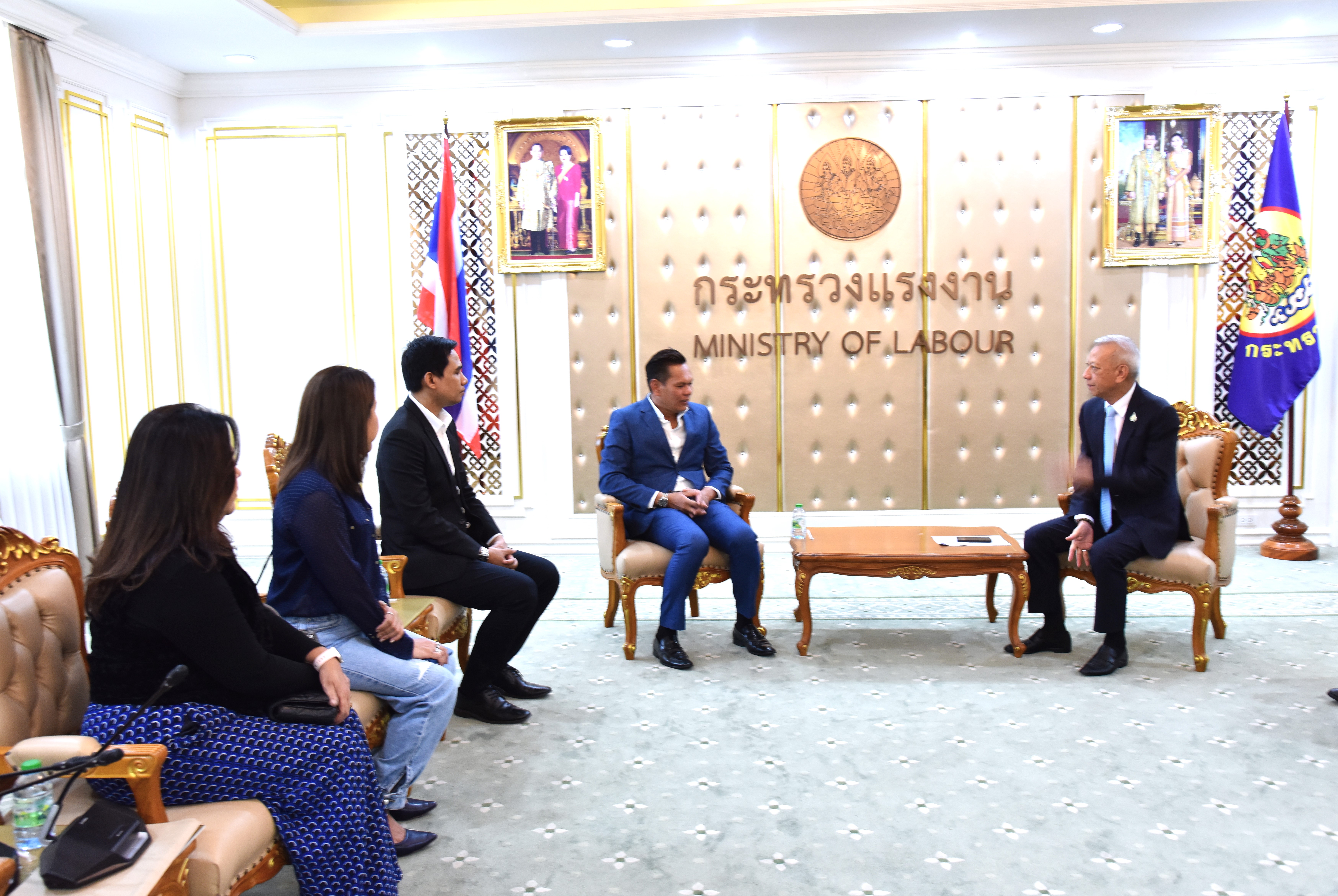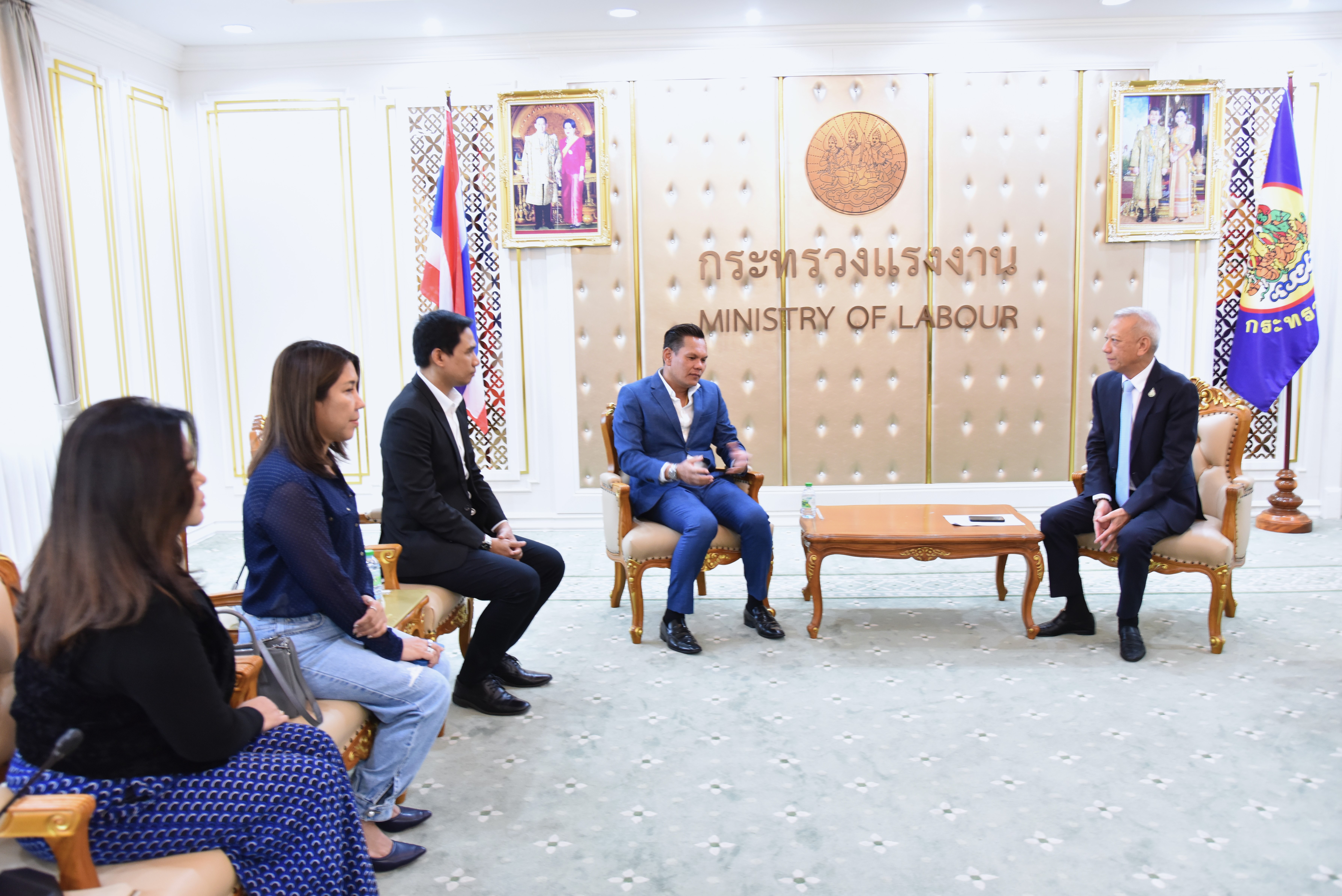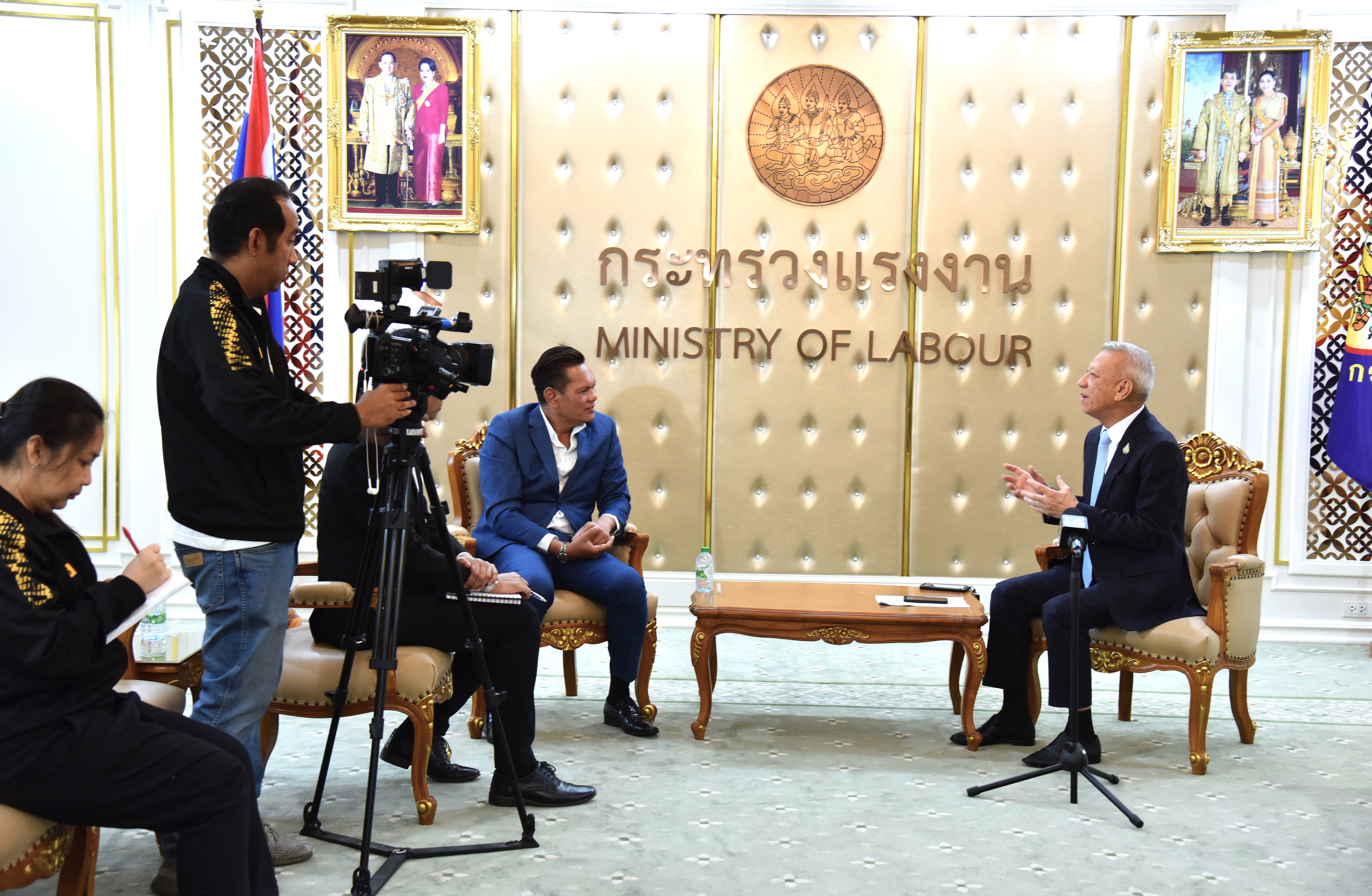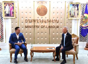 On May 17, 2024, at 15.00 hours, the Labour Minister, Mr. Phiphat Ratchakitprakarn, welcomed the Managing Director of Top News Digital Media Company Limited, Mr. Chatchai Phukhokwai, and the delegation on the occasion of meeting the Labour Minister for a special interview on the progress of opening the labour market for Thai workers to work abroad. The occasion took place at the Chatumongkol Room, 6th floor, Ministry of Labour.