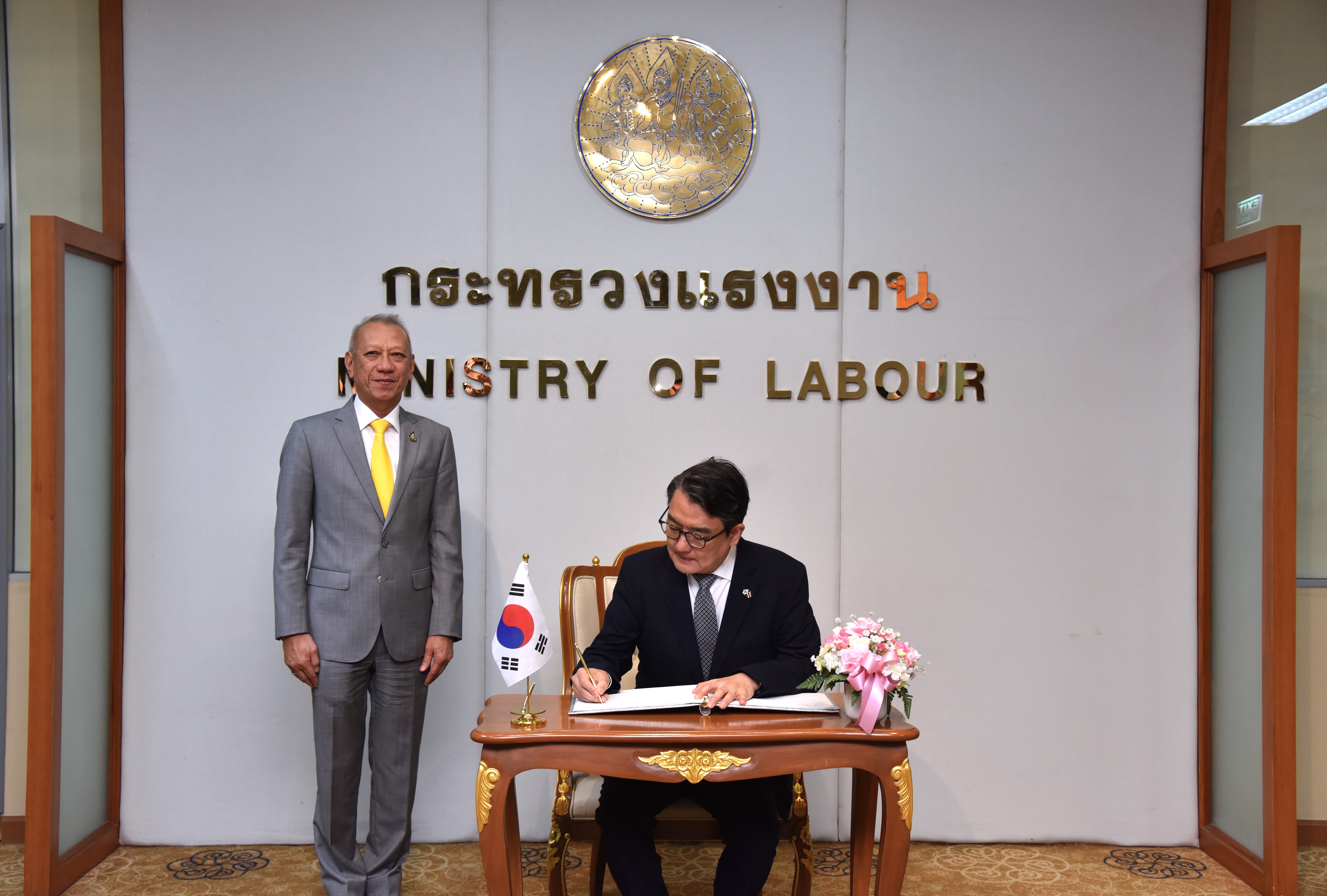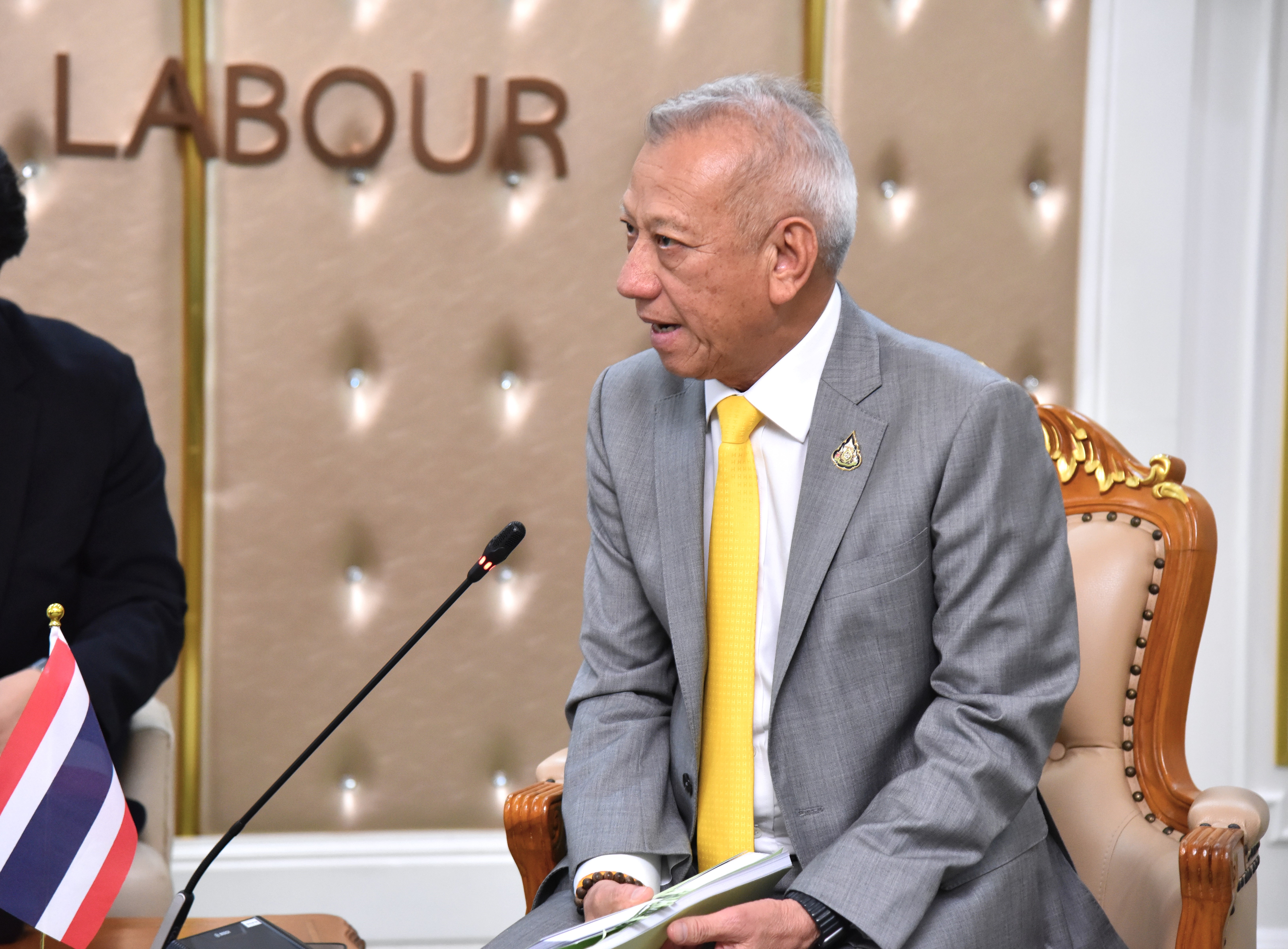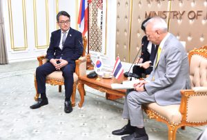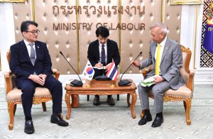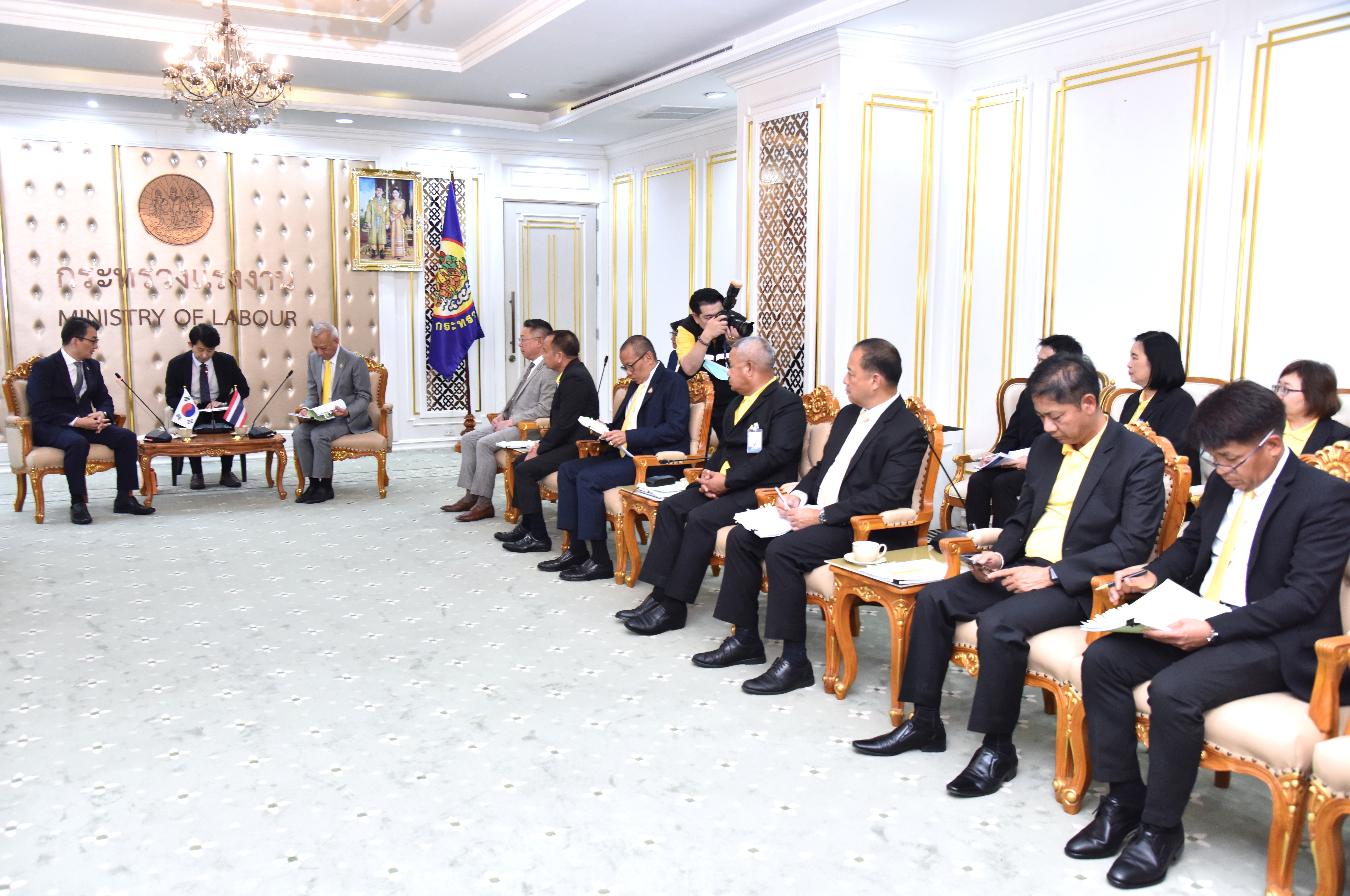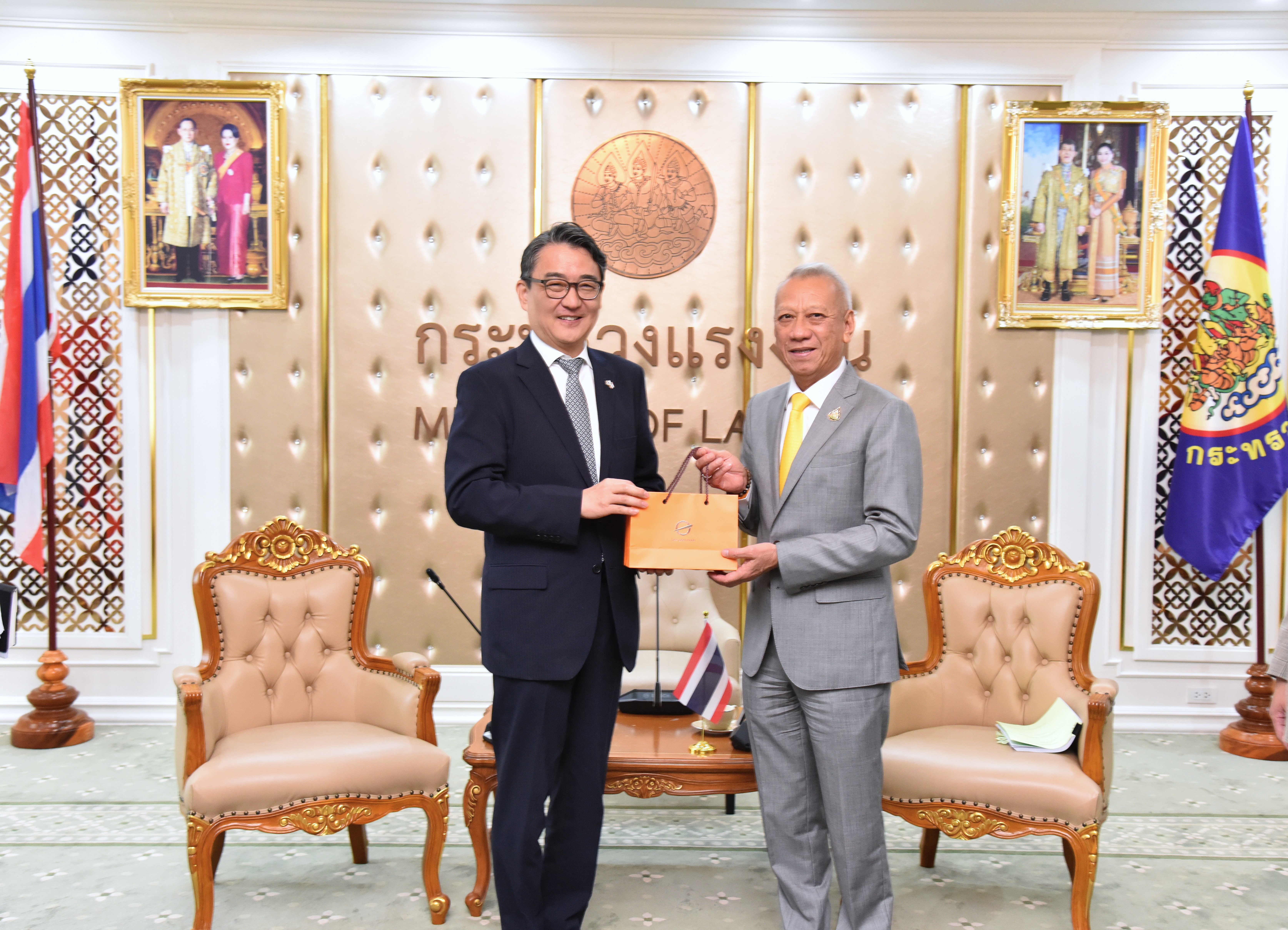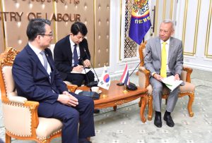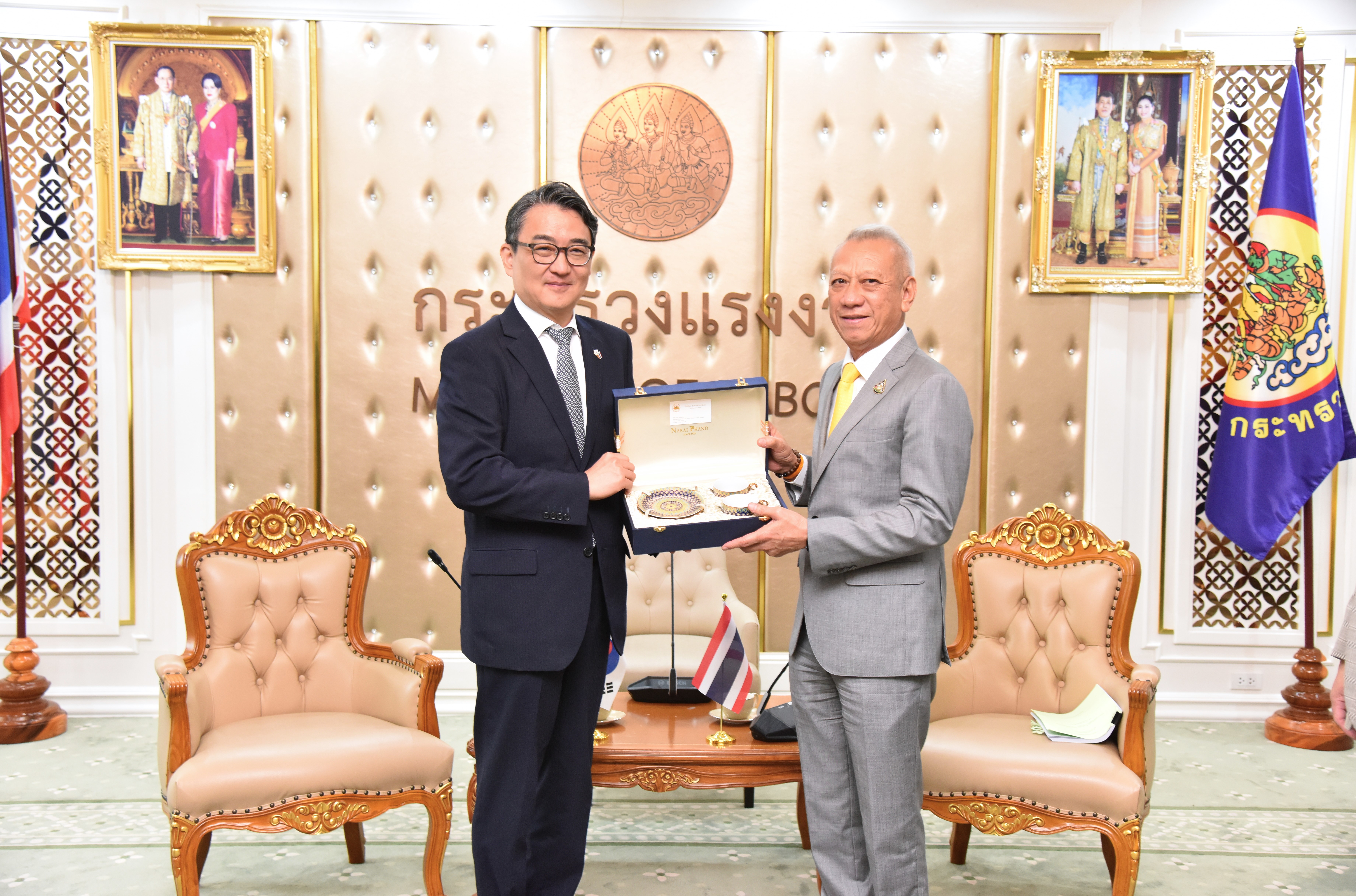On March 4, 2024, at 14.00 hours, the Labour Minister, Mr. Phiphat Ratchakitprakarn, welcomed the Ambassador of the Republic of Korea to Thailand, Mr. Park Yongmin, and a delegation on occasion of a courtesy visit to discuss government matters regarding labour. The Labour Minister’s Advisor, Mr. Thanat Thaweekueakulkit, the Secretariat to the Labour Minister, Mr. Aree Krainara, from the Prime Minister’s Secretariat’s Office, performing duties for the Ministry of Labour, Mr. Phuchong Worasri, the Social Security Office’s Secretary-General, Mr. Boonsong Thapchaiyut, the Ministry of Labour’s Inspector-General, Mr. Samat Pattamasukon, and the Ministry of Labour’s executives joined the occasion at the Chatumongkol Room, 6th floor, Ministry of Labour.