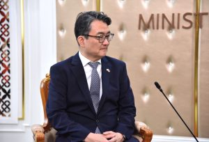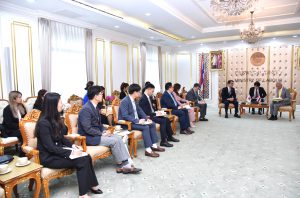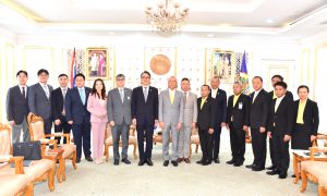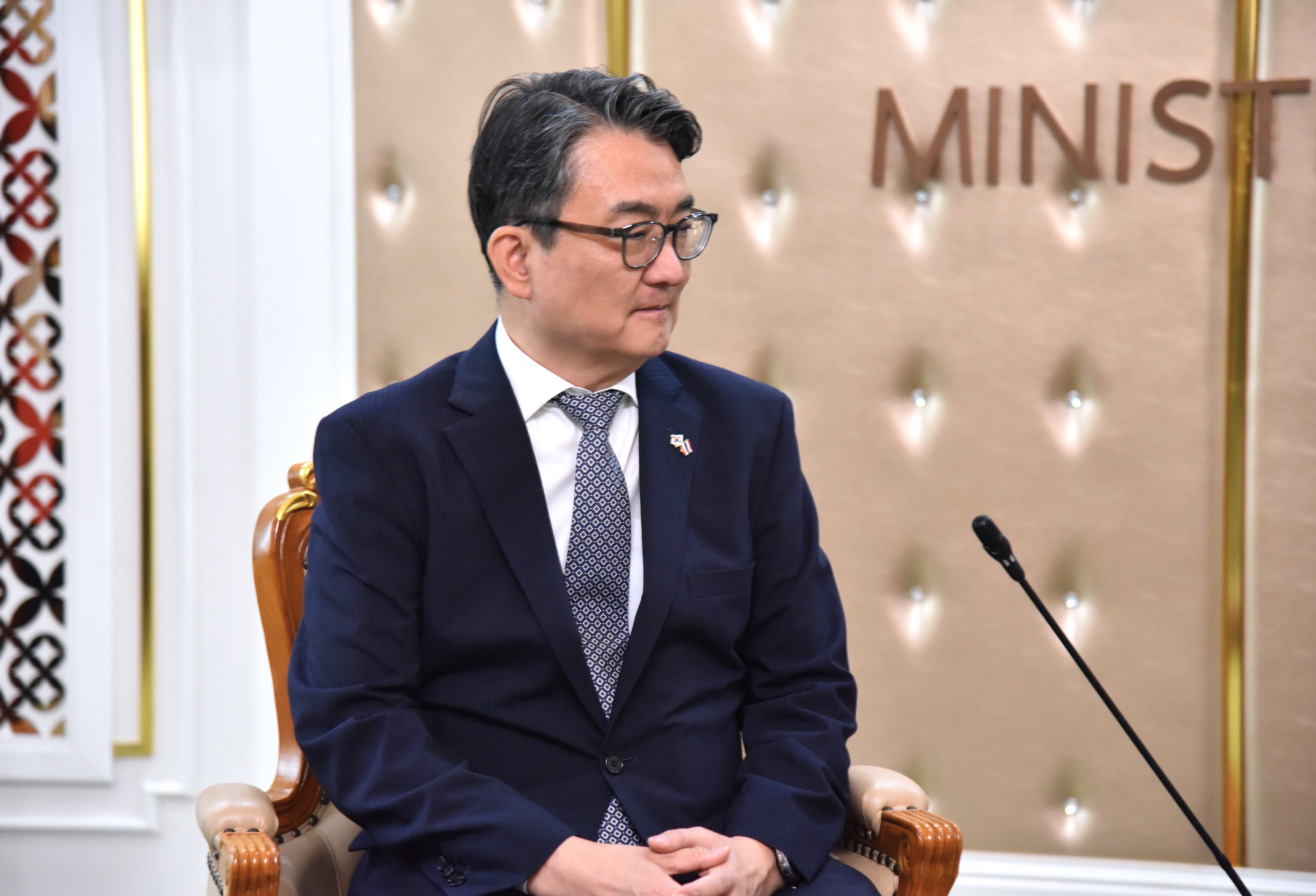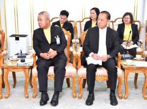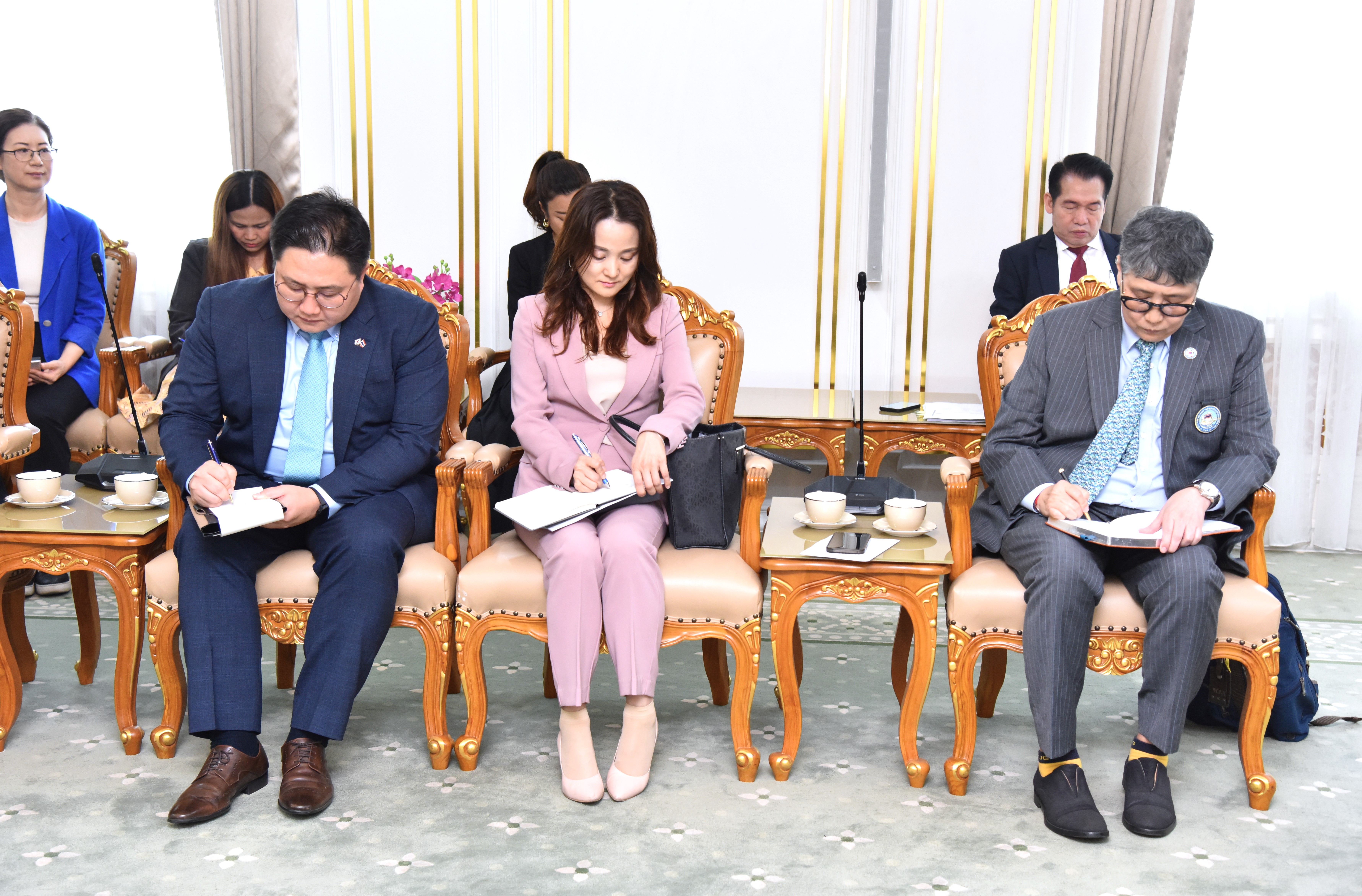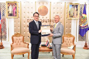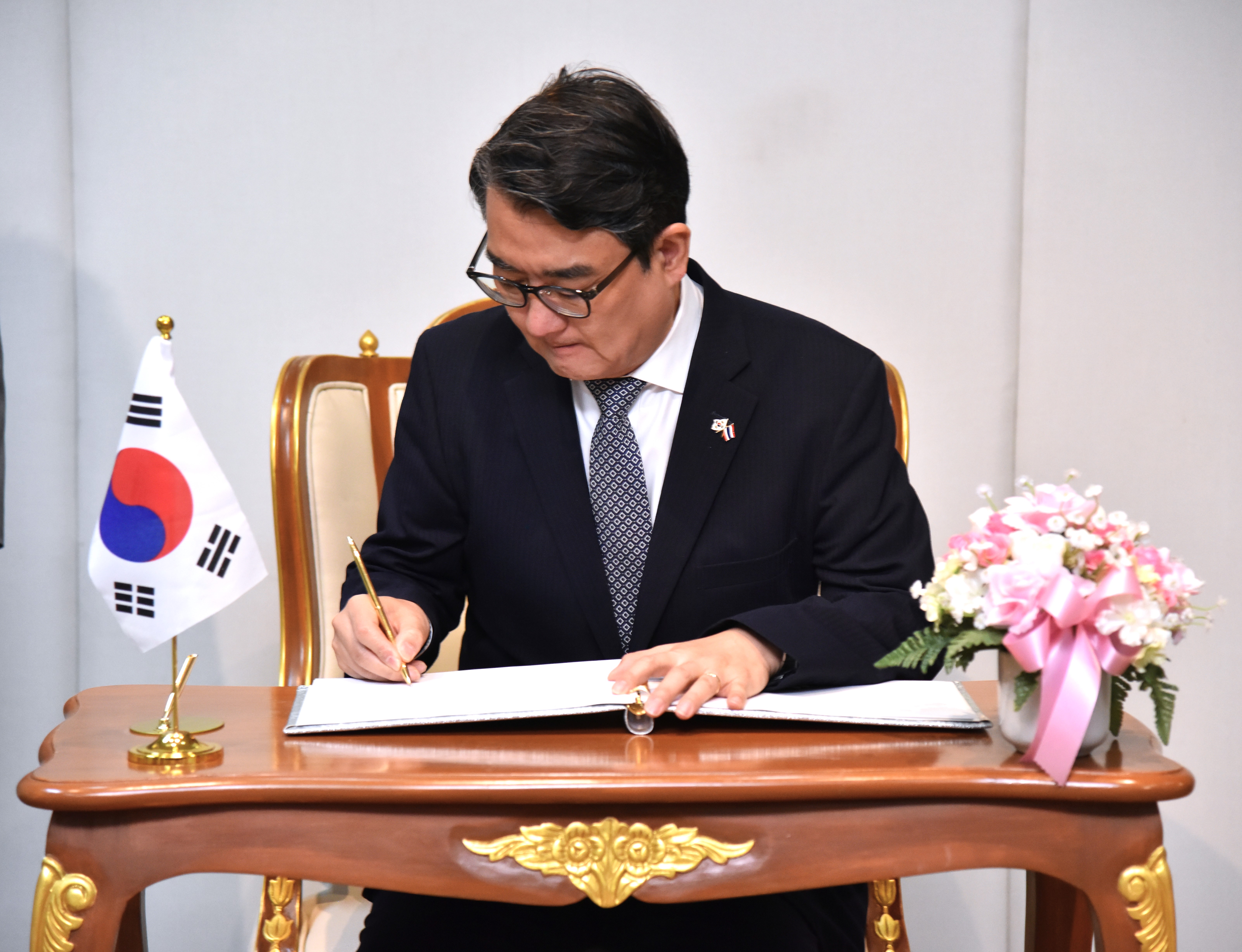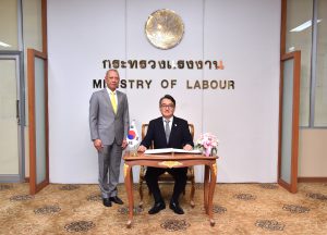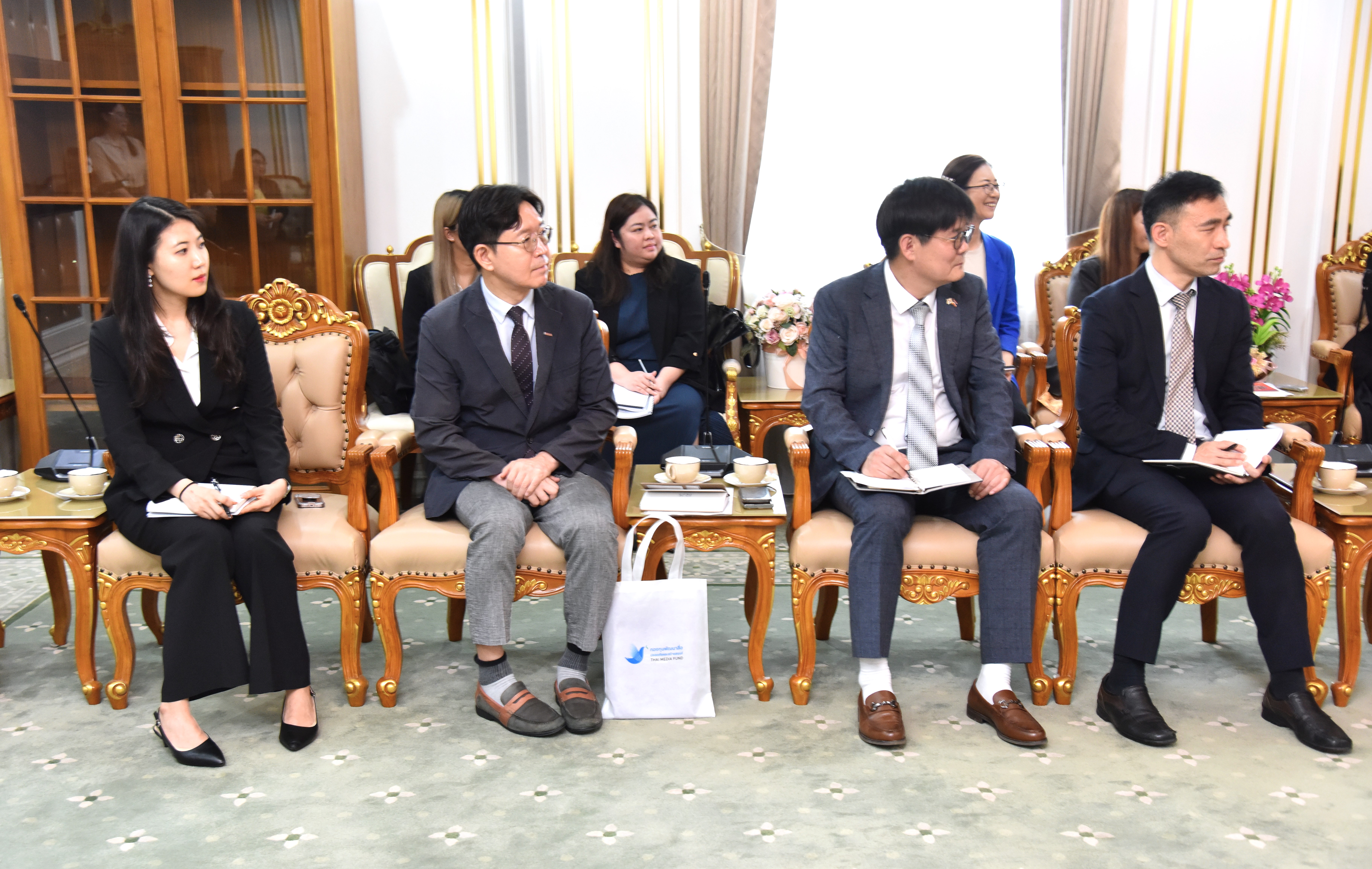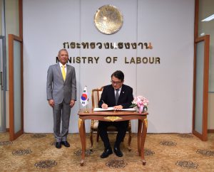 On March 4, 2024, at 14.00 hours, the Labour Minister, Mr. Phiphat Ratchakitprakarn, welcomed the Ambassador of the Republic of Korea to Thailand, Mr. Park Yongmin, and a delegation on occasion of a courtesy visit to discuss government matters regarding labour. The Labour Minister’s Advisor, Mr. Thanat Thaweekueakulkit, the Secretariat to the Labour Minister, Mr. Aree Krainara, from the Prime Minister’s Secretariat’s Office, performing duties for the Ministry of Labour, Mr. Phuchong Worasri, the Social Security Office’s Secretary-General, Mr. Boonsong Thapchaiyut, the Ministry of Labour’s Inspector-General, Mr. Samat Pattamasukon, and the Ministry of Labour’s executives joined the occasion at the Chatumongkol Room, 6th floor, Ministry of Labour.