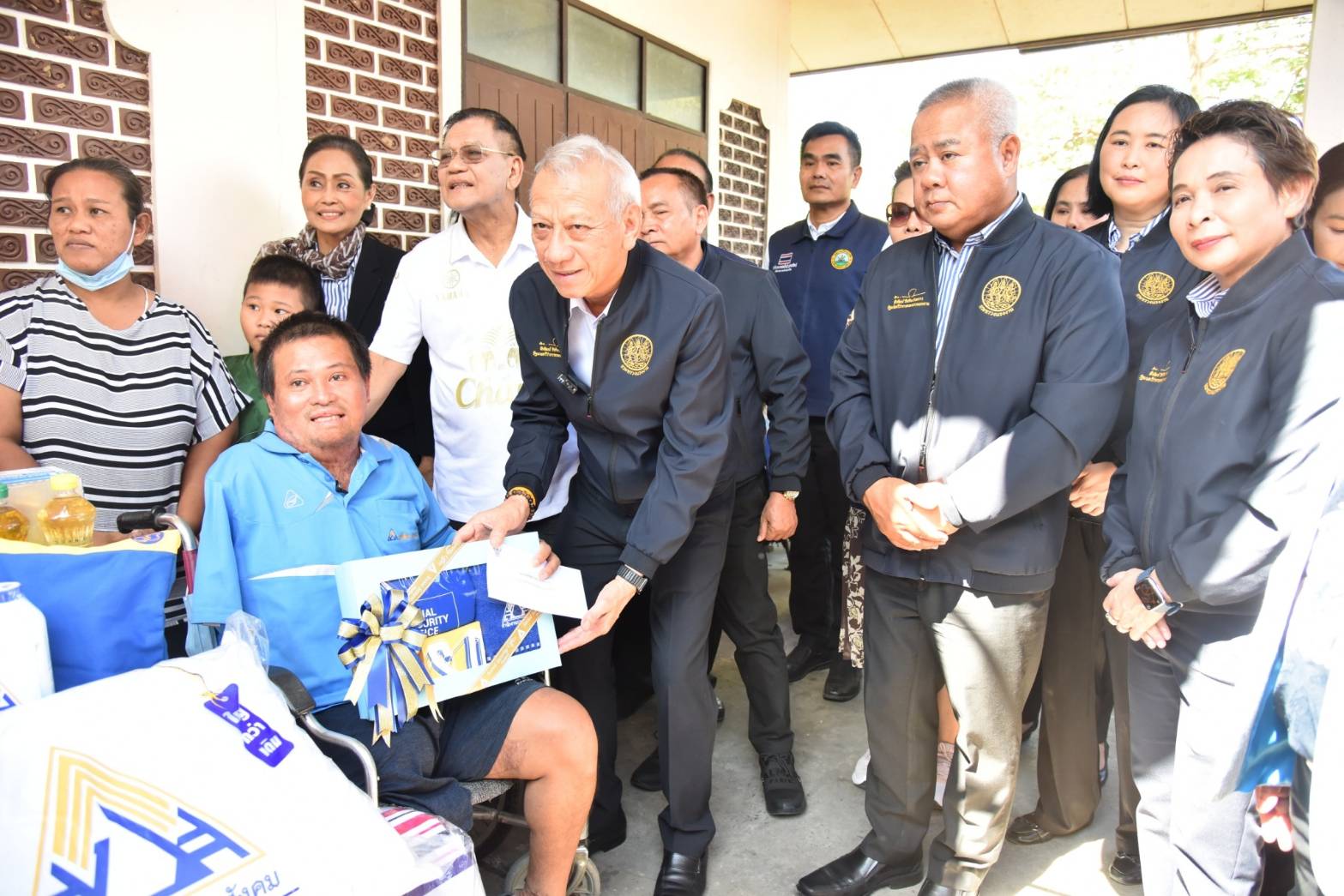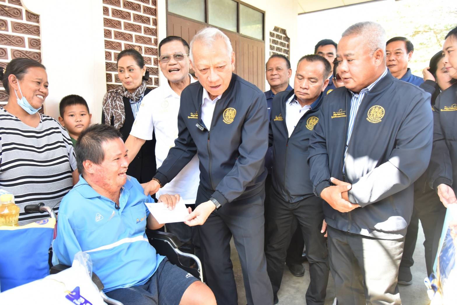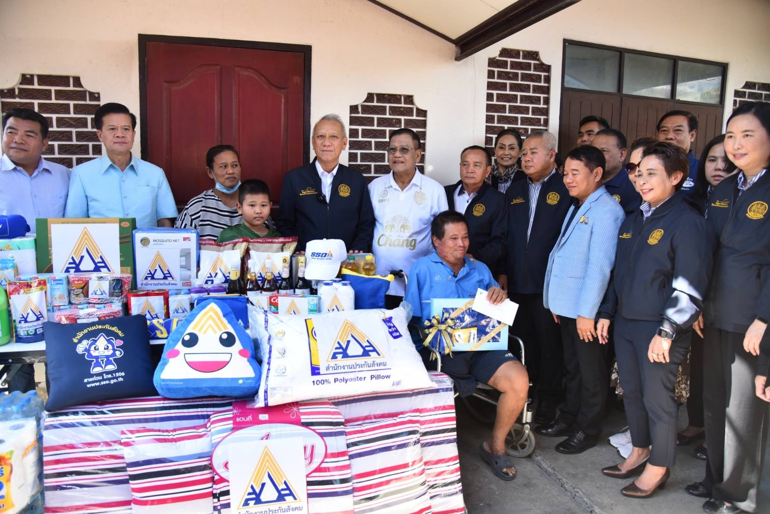 On December 1, 2023, at 11.00 hours, the Labour Minister, Mr. Phiphat Ratchakitprakarn, the Secretariat to the Labour Minister, Mr. Aree Krainara, the Social Security Office’s Secretary-General, Mr. Boonsong Thapchaiyut, and the Ministry of Labour’s executives paid a visit to speak to, encourage, and give consumer items, including appliances, and necessary goods to two disabled insured persons under the care of the Social Security Office in Buriram Province. The first person, Mr. Seksan Manram, was at house number 99, Moo 17, Ban Chum Thong, Chum Het Subdistrict, Mueang District, Buriram Province. He is a disabled person under the Compensation Fund. His disability was caused when he climbed up a ladder for electricity repair. He was shocked by a high voltage while working. There were burns on his body, and his right arm and leg were amputated. Currently, he requires a wheelchair to move and has limited ability to help himself. He lost 50 percent of his body’s functionality. The second case was Mr. Kum Koram, at house number 23, Moo 17, Krasang Subdistrict, Mueang District, Buriram Province. He is a disabled person under the Social Security Fund, Section 33. His disability was caused by a cerebral hemorrhage, resulting in weakness in his right arm and leg. He lost functioning on the right side of his body and has difficulty walking. He requires the use of a cane, and his ears can’t hear well. He lost 50 percent of his body’s functionality.