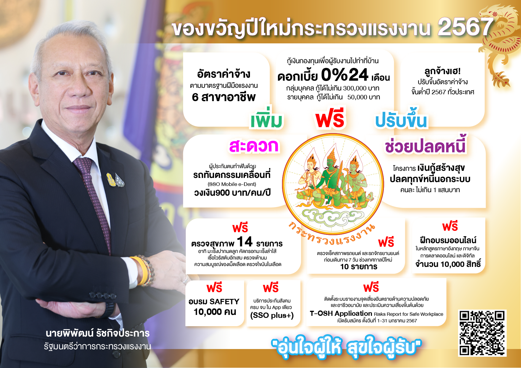 Mr. Phiphat said that the Prime Minister, Mr. Srettha Thavisin, cares about all groups of workers and has instructed all ministries to consider gifts to the people to stimulate the economy and encourage fellow workers across the country, including Thai workers working abroad for the New Year festival. For 2024, the Ministry of Labour has 11 New Year’s gifts under the concept of “Increase, Free, Enhance, Convenient, and Help Pay Off Debt” under the campaign “Giver’s Peace of Mind and Happy Recipients.” The measures aim to provide happiness to workers as follows: