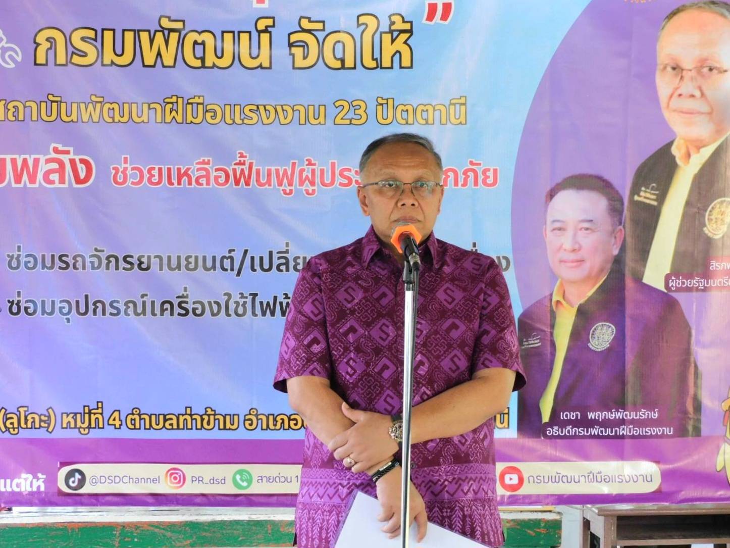 เมื่อวันที่ 20 มกราคม 2568 นายพิพัฒน์ รัชกิจประการ รัฐมนตรีว่าการกระทรวงแรงงาน มอบหมายให้ นายสิรภพ ดวงสอดศรี ผู้ช่วยรัฐมนตรีประจำกระทรวงแรงงาน เป็นประธานพิธีเปิดโครงการ “ซ่อม สร้าง สุข กรมพัฒน์จัดให้” โดยมี นายชาติวุฒิ ทองกัน ผู้ตรวจราชการกรม กรมพัฒนาฝีมือแรงงาน ให้การต้อนรับและกล่าวรายงาน ซึ่งมี นางพาตีเมาะ สะดียามู ผู้ว่าราชการจังหวัดปัตตานี พร้อมหัวหน้าส่วนราชการหน่วยงานสังกัดกระทรวงแรงงานจังหวัดปัตตานี ผู้นำท้องถิ่น และประชาชน ผู้ประสบอุทกภัย ร่วมงาน ณ มัสยิดดารุลมุฮซีนีน (ลูโกะ) ม.4 ต.ท่าข้าม อ.ปะนาเระ จ.ปัตตานี