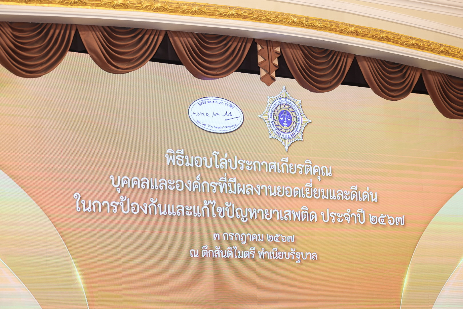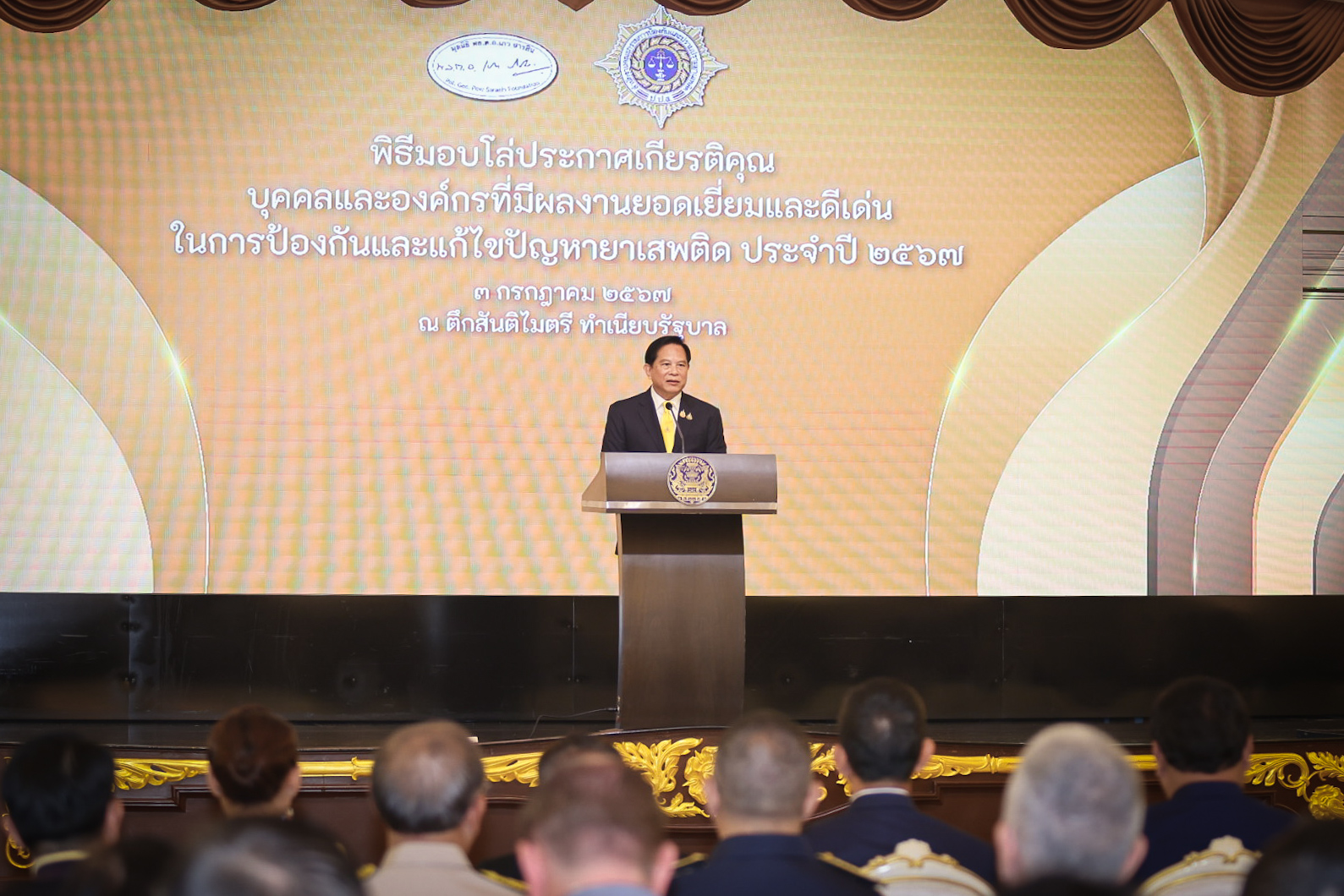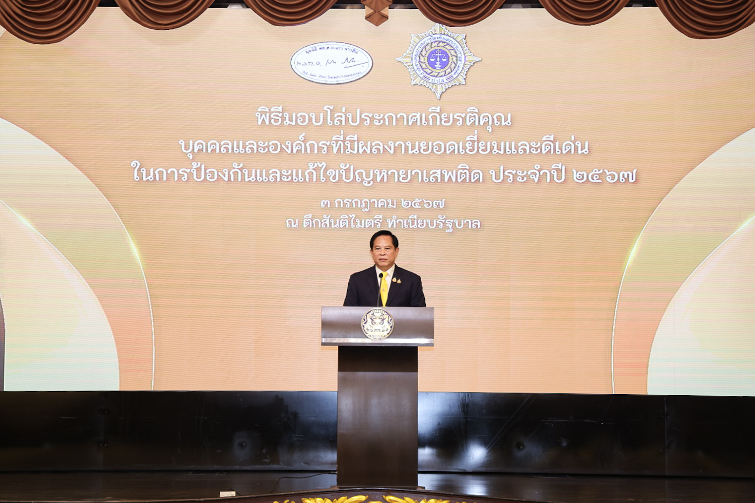 สำหรับพิธีมอบโล่ประกาศเกียรติคุณบุคคลและองค์กรที่มีผลงานยอดเยี่ยมและดีเด่น ในการป้องกันและแก้ไขปัญหายาเสพติดประจําปี 2567 จัดขึ้นเพื่อเป็นการเชิดชูเกียรติบุคคลและองค์กรที่ทุ่มเทเสียสละ ในการป้องกันและแก้ไขปัญหายาเสพติดและเพื่อเป็นการแสดงเจตนารมณ์และความตั้งใจของรัฐบาลไทยที่ให้ความสําคัญกับการป้องกัน และแก้ไขปัญหายาเสพติดอย่างจริงจังและต่อเนื่อง