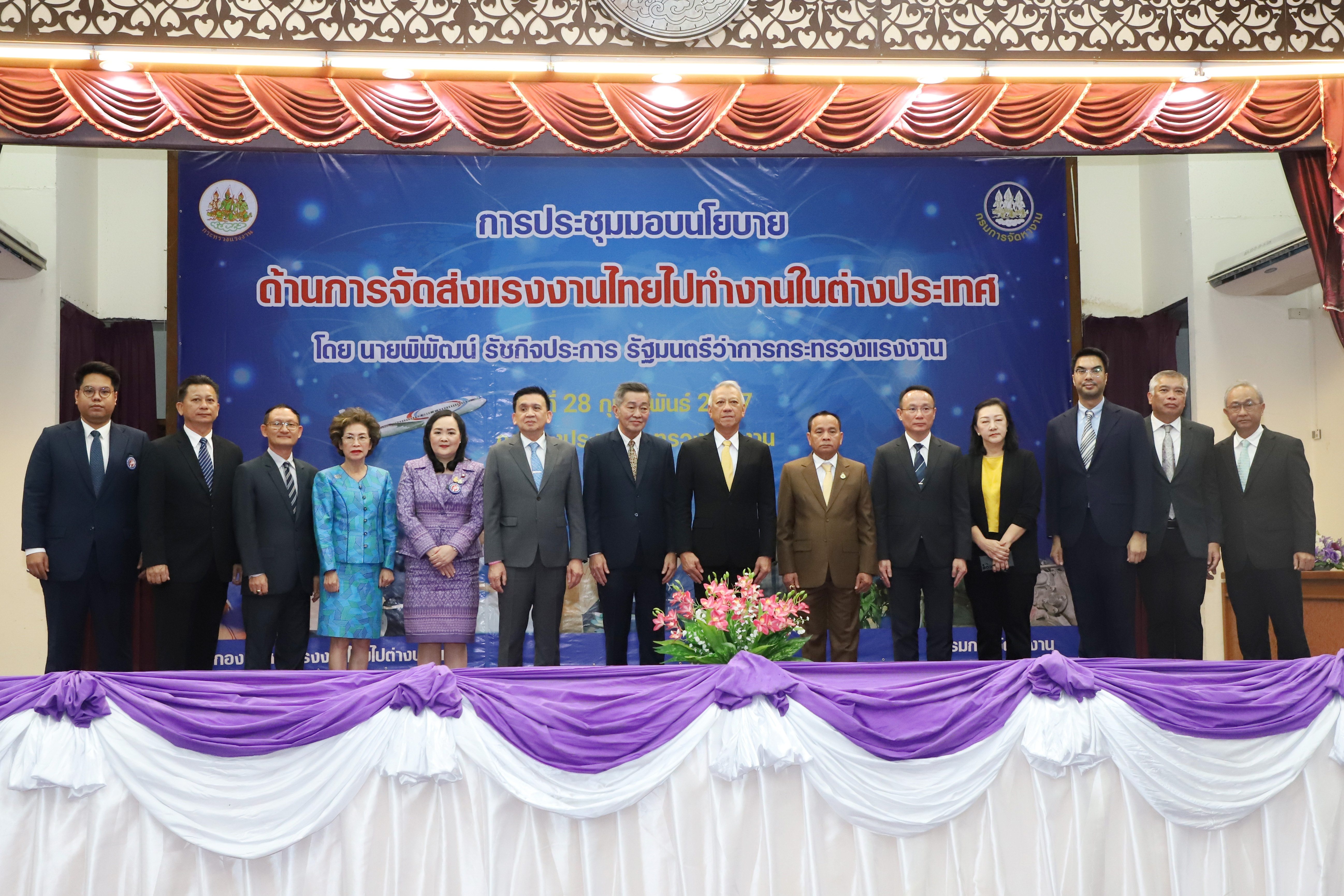 วันที่ 28 กุมภาพันธ์ 2567 นายพิพัฒน์ รัชกิจประการ รัฐมนตรีว่าการกระทรวงแรงงาน เป็นประธานการประชุมมอบนโยบายด้านการจัดส่งแรงงานไทยไปทำงานในต่างประเทศ ประจำปี 2567 โดยมี นายอารี ไกรนรา เลขานุการรัฐมนตรีว่าการกระทรวงแรงงาน พร้อมด้วยนายไพโรจน์ โชติกเสถียร ปลัดกระทรวงแรงงาน นายวรรณรัตน์ ศรีสุขใส รองปลัดกระทรวงแรงงาน เรือเอก สาโรจน์ คมคาย ที่ปรึกษากฎหมาย นางนภสร ทุ่งสุกใส ที่ปรึกษาวิชาการแรงงาน และนางสาวกรจิรัฏฐ์ พงจันทร์ศธร ผู้ช่วยปลัดกระทรวงแรงงาน ร่วมเป็นเกียรติในงาน นายสมชาย มรกตศรีวรรณ อธิบดีกรมการจัดหางาน กล่าวรายงาน สมาคมการจัดหางานไทยไปต่างประเทศ สมาคมนายจ้างส่งเสริมแรงงานไทย และผู้รับอนุญาตจัดหางาน เพื่อไปทำงานในต่างประเทศ จำนวน 144 บริษัท ร่วมประชุม ณ ห้องประชุม ชั้น 5 อาคารกระทรวงแรงงาน