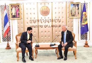 The former President of the Security Services Association of Thailand, Dr. Watcharaphon Busamongkol, said that the Security Services Association of Thailand currently has over 400,000 security personnel. He thanked the Labour Minister and the Ministry of Labour’s executives for providing an opportunity to meet today to learn about labour policies. He said he was happy with the meeting and promised to help drive various policies to upgrade the workers’ skills and take care of their welfare and rights so that security personnel have access to social welfare and a better quality of life.