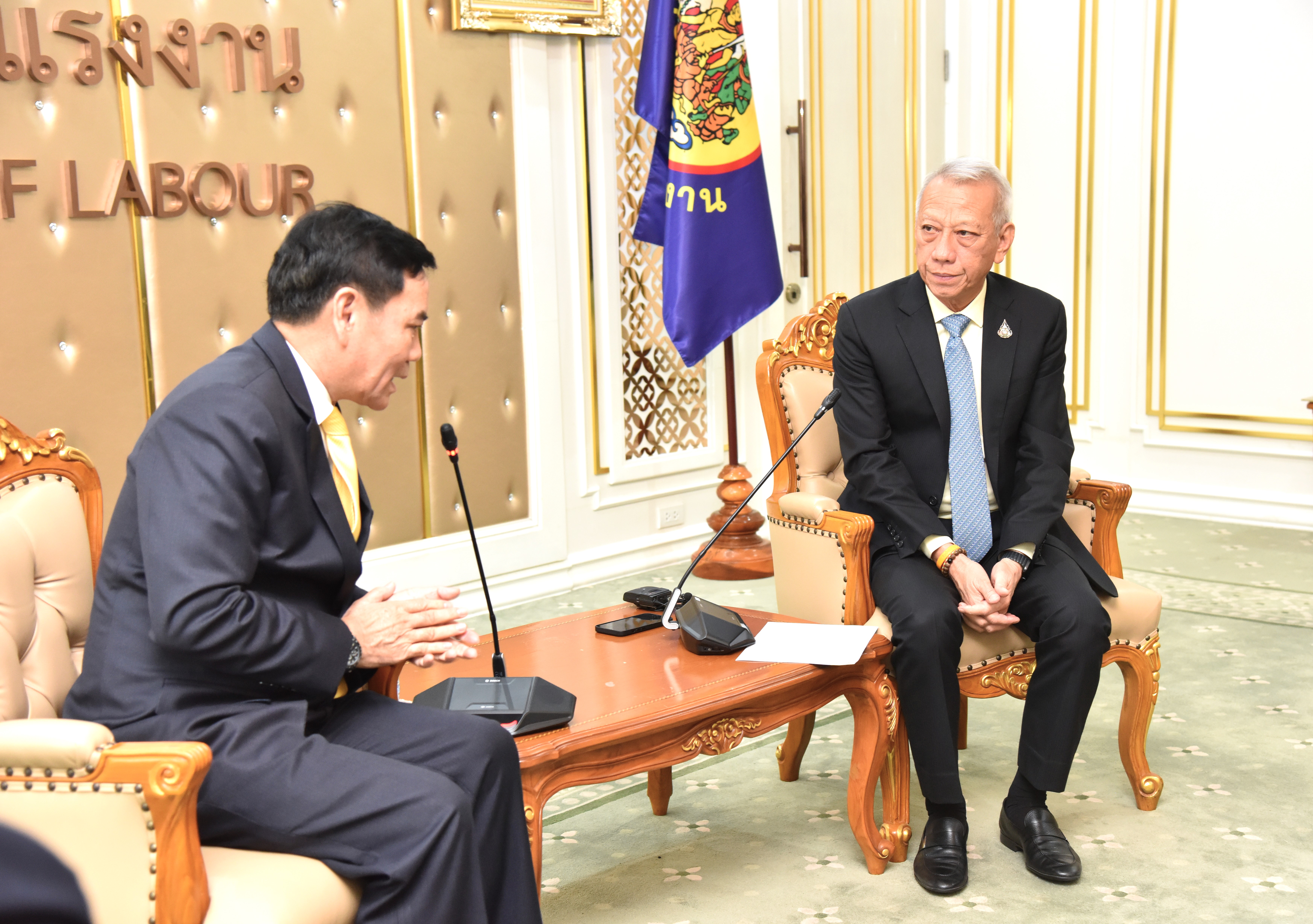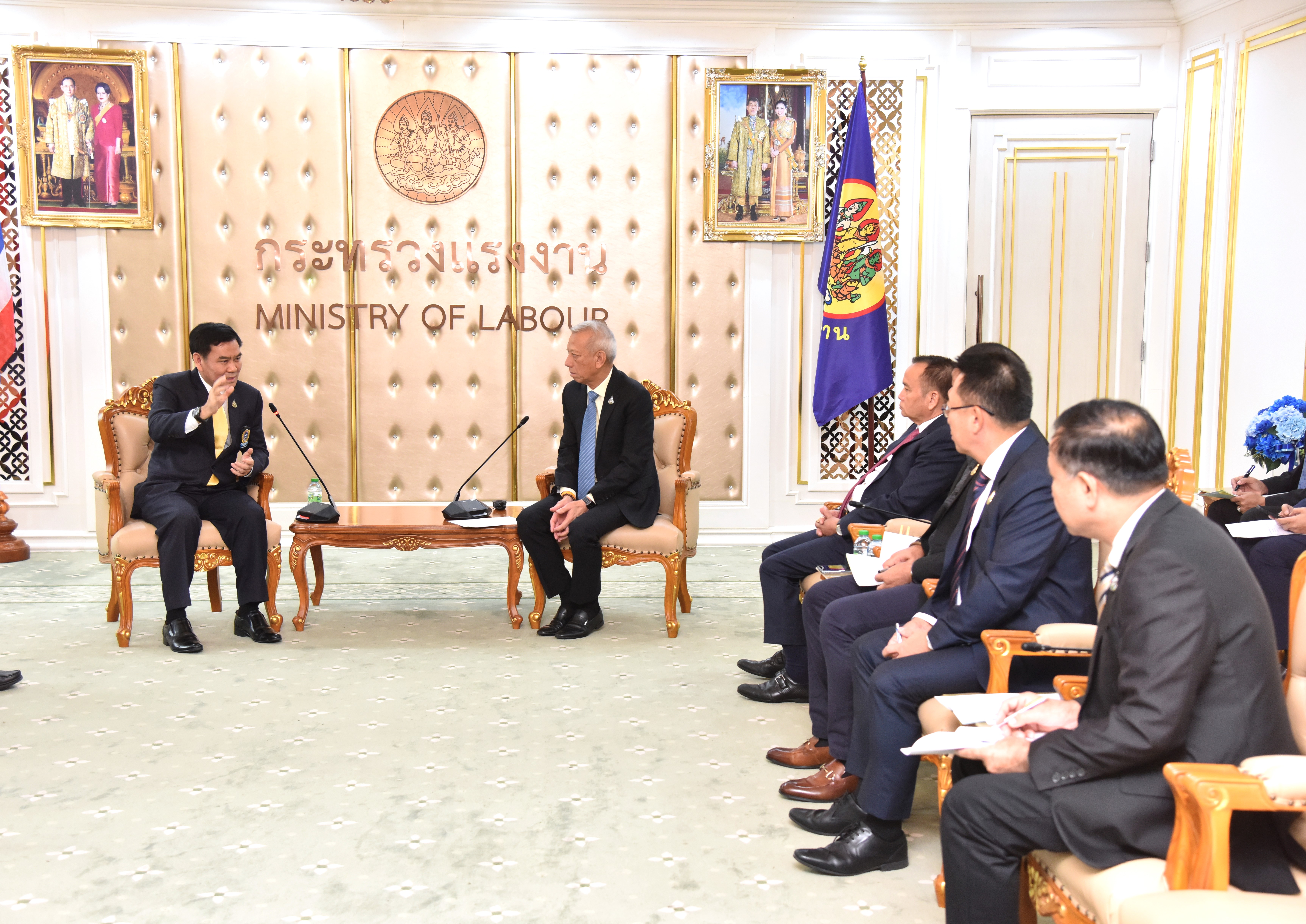 On November 29, 2023, at 11.00 hours, the Labour Minister, Mr. Phiphat Ratchakitprakarn, welcomed the former President of the Security Services Association of Thailand, Dr. Watcharaphon Busamongkol, and the delegation, on the occasion of a meeting to discuss increasing labour protection measures for security personnel. The Secretariat to the Labour Minister, Mr. Aree Krainara, the Ministry of Labour’s Spokesperson, Mr. Phumiphat Mueanchan, the Deputy Permanent Secretary of Labour, Mr. Decha Pruekphathanarak, and the Department of Labour Protection and Welfare’s Inspector-General, Mr. Krirkkrai Nasomyont, joined the welcome at the Chatumongkol Room, 6th floor, Ministry of Labour.