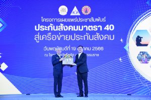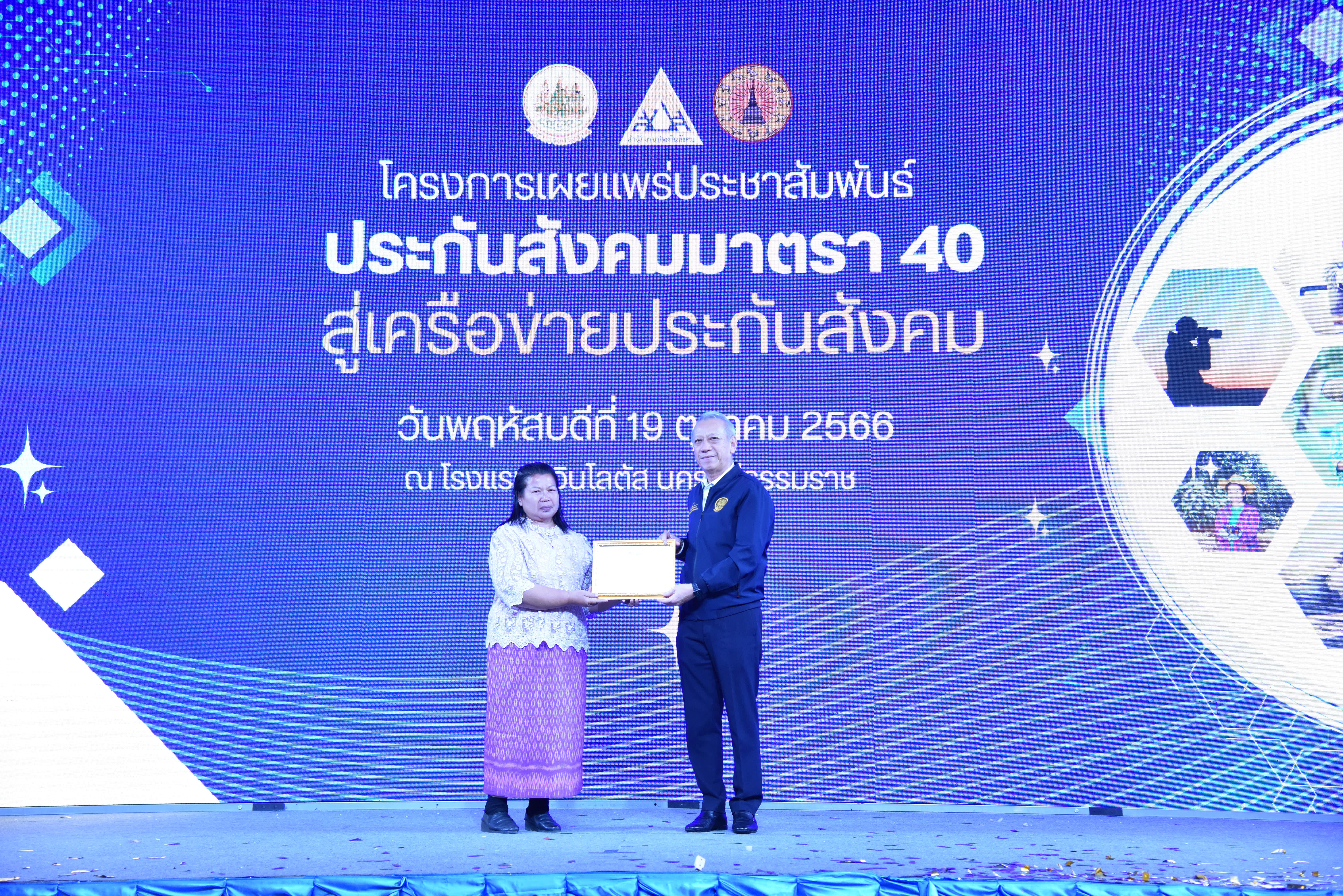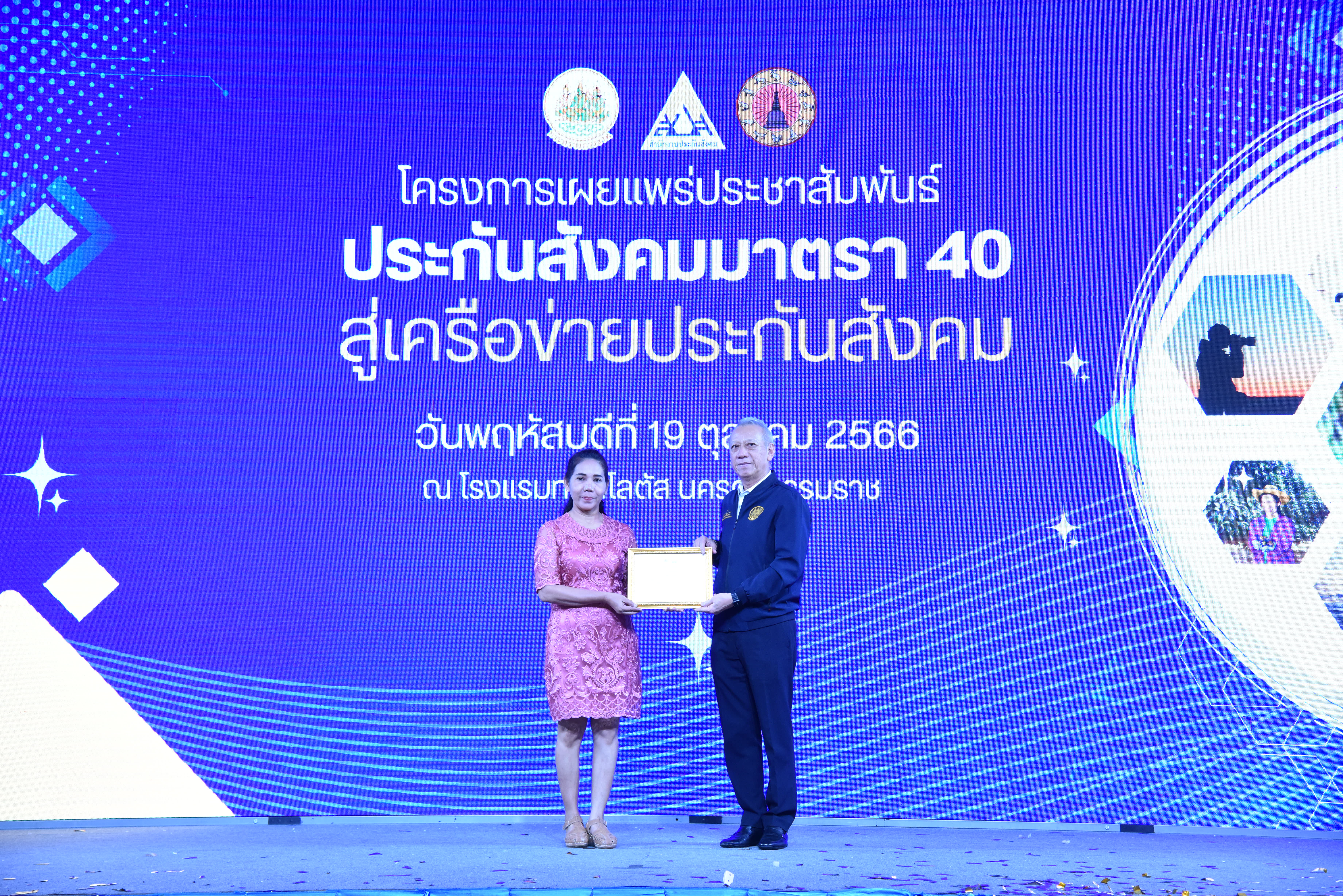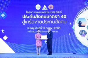 The Social Security Office’s Secretary-General, Mr. Boonsong Thapchaiyut, said that the organization of the Social Security Section 40 Public Relations Project to the Social Security Network, Class 1, has the objective of increasing the potential of the Social Security Network to have knowledge and understanding about access to benefits that insured people will receive, so that they can campaign and encourage more independent sector workers to join the social security system. Today’s event had 400 people attending, including people insured under Section 40, self-employed people, social security networks, labour volunteers, community leaders, and village headmen in Nakhon Si Thammarat Province. In this regard, the Labour Minister, Mr. Phiphat Ratchakitprakarn, awarded certificates to 6 outstanding social security support networks. In addition, within the event area, there were also services taking applications for Section 40 insured persons, discussions, and exchange of knowledge on social security Section 40. Stores were set up to sell products made by the networks. Various exhibitions were organized by agencies under the Ministry of Labour, including activities of network partners as well.