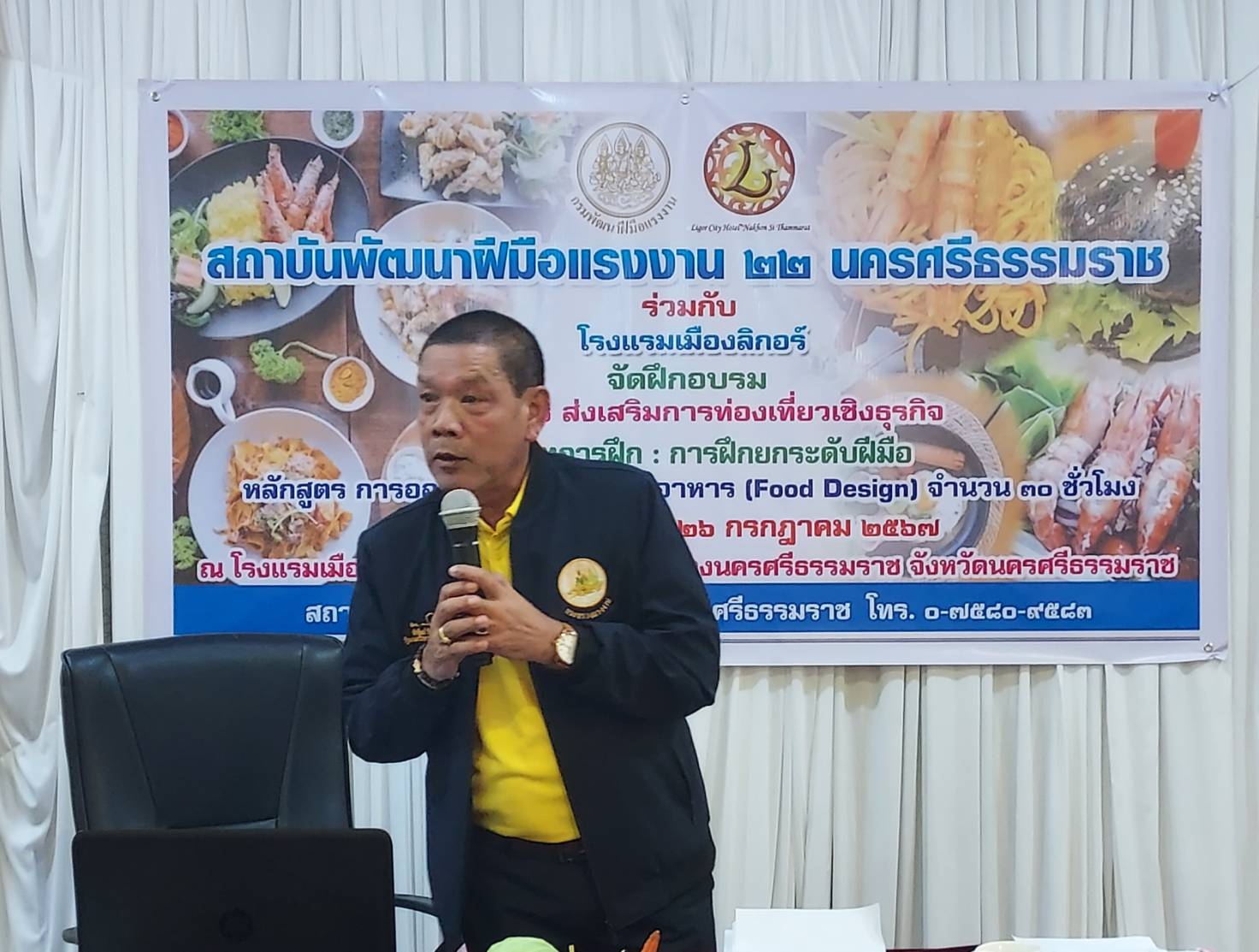 นายภูมิพัฒน์ เหมือนจันทร์ โฆษกกระทรวงแรงงาน เปิดเผยว่า รัฐมนตรีว่าการกระทรวงแรงงาน มอบหมายให้ผมพร้อมคณะที่ปรึกษารัฐมนตรีว่าการกระทรวงแรงงาน ลงพื้นที่จังหวัดนครศรีธรรมราช ตรวจเยี่ยมการพัฒนาทักษะให้แก่แรงงานในพื้นที่ ซึ่งในครั้งนี้ สถาบันพัฒนาฝีมือแรงงาน 22 นครศรีธรรมราช มีการจัดฝึกอบรมให้แก่แรงงานในชุมชนหลักสูตรการออกแบบการนำเสนออาหาร (food design) และหลักสูตรการทำขนมฟิวชั่น เพื่อเป็นการยกระดับอาหารของท้องถิ่นให้มีความทันสมัย รู้จักการจัดวาง และสร้างสรรค์การนำเสนออาหารที่น่าสนใจ ประกอบกับปัจจุบันเป็นโลกแห่งโซเชียล นักท่องเที่ยวส่วนใหญ่จะต้องมีการถ่ายรูปอาหาร รีวิวอาหารลงโซเชี่ยลก่อนอยู่แล้ว หากอาหารมีสีสันสวยงาม น่าทาน การกระทำเหล่านี้เป็นการประชาสัมพันธ์ที่ดี เกิดการบอกต่ออย่างรวดเร็ว ผู้พบเห็นก็จะอยากมาทานอาหารและท่องเที่ยวในจังหวัดและแหล่งชุมชนที่ขึ้นชื่อ ทำให้จังหวัดมีรายได้เพิ่มขึ้น และส่งผลให้เศรษฐกิจของไทยเกิดความคล่องตัว
