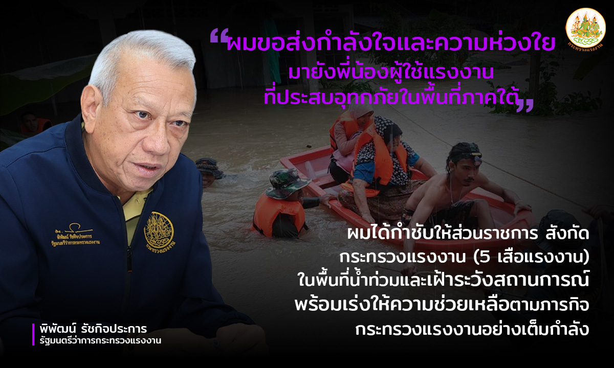 “ผมขอส่งกำลังใจและความห่วงใยมายังพี่น้องผู้ใช้แรงงานที่ประสบอุทกภัยในพื้นที่ภาคใต้ ผมได้กำชับให้ส่วนราชการสังกัดกระทรวงแรงงาน (5 เสือแรงงาน) ในพื้นน้ำท่วมและเฝ้าระวังสถานการณ์ พร้อมเร่งให้ความช่วยเหลือตามภารกิจกระทรวงแรงงานอย่างเต็มกำลัง”นายพิพัฒน์ กล่าวท้ายสุด