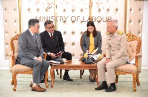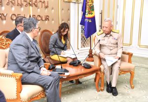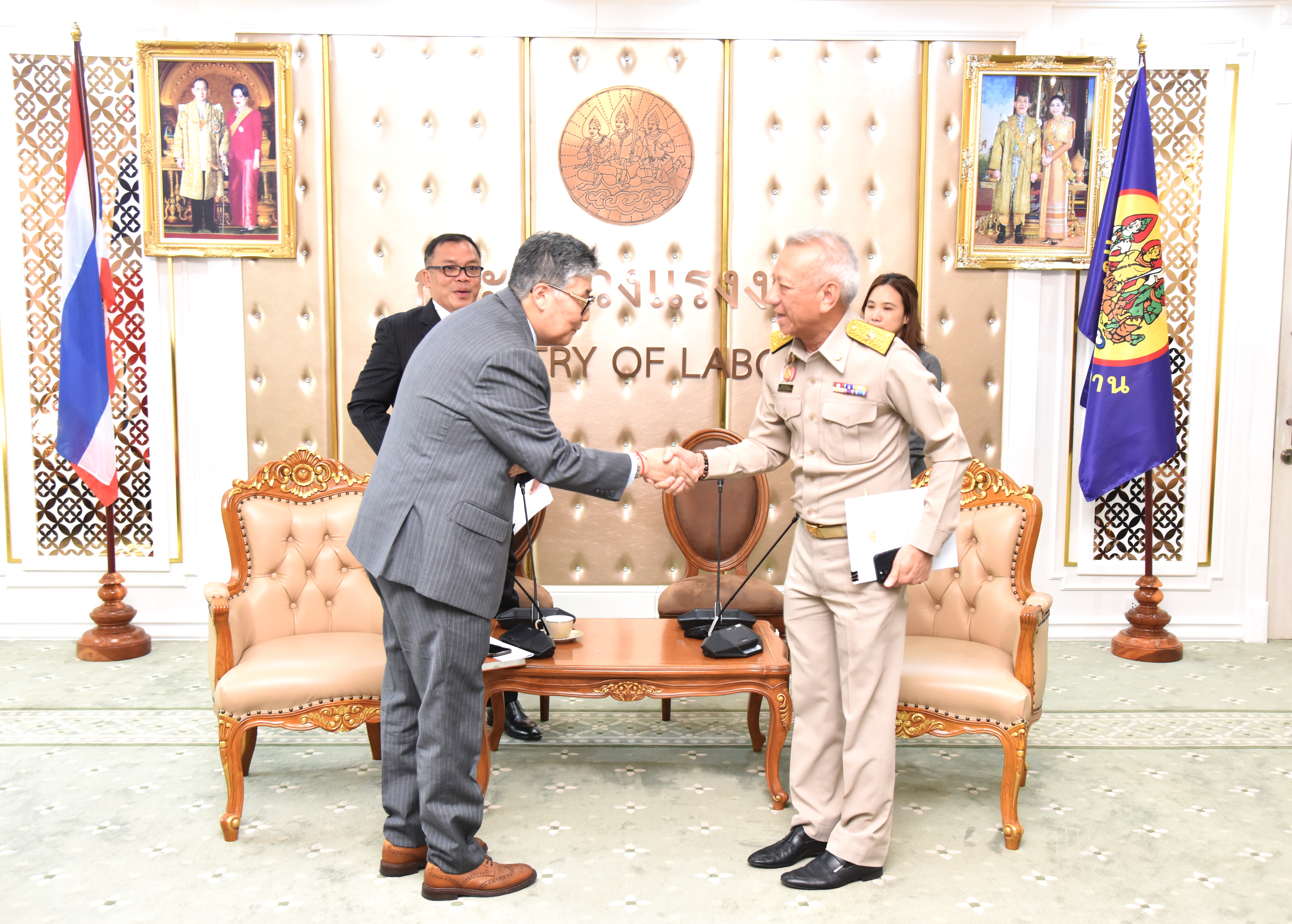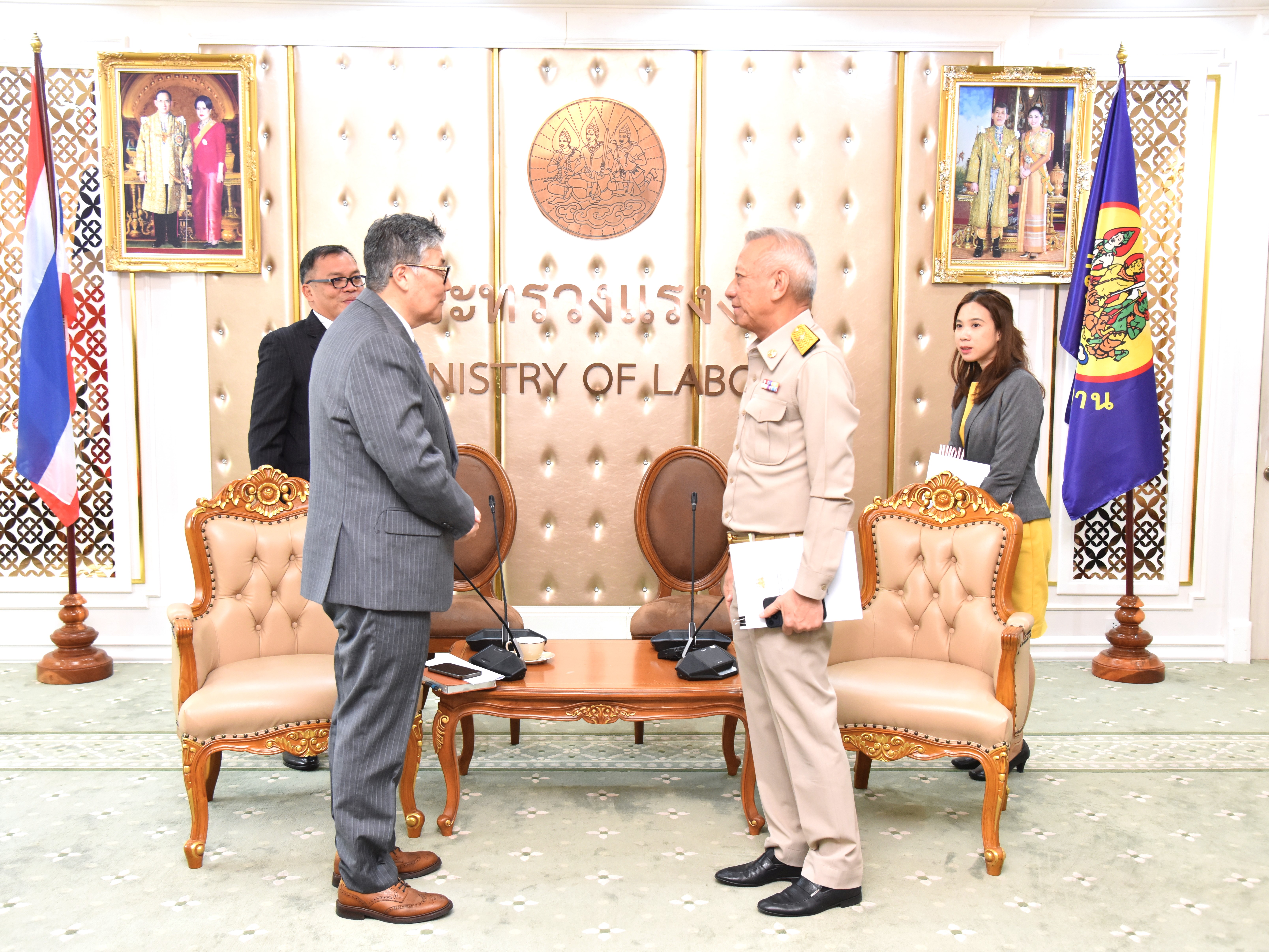 วันที่ 25 ธันวาคม 2566 เวลา 13.30 น. นายพิพัฒน์ รัชกิจประการ รัฐมนตรีว่าการกระทรวงแรงงาน ให้การต้อนรับ นายคิม จองมิน (Mr.Kim Jongmin) ประธานหอการค้าเกาหลี – ไทย และคณะ ในโอกาสเข้าพบเพื่อเยี่ยมคารวะแสดงความยินดีต่อรัฐมนตรีว่าการกระทรวงแรงงานและหารือแนวทางการส่งเสริมขยายตลาดแรงงานไทยในสาธารณรัฐเกาหลี โดยมี นายอารี ไกรนรา เลขานุการรัฐมนตรีว่าการกระทรวงแรงงาน นายเดชา พฤกษ์พัฒนรักษ์ รองปลัดกระทรวงแรงงาน นายสิบหมื่นชัย โพธิสินธุ์ รองอธิบดีกรมการจัดหางาน พร้อมด้วยผู้บริหารระดับสูงกระทรวงแรงงาน เข้าร่วม ณ ห้องจัตุมงคล ชั้น 6 อาคารกระทรวงแรงงาน