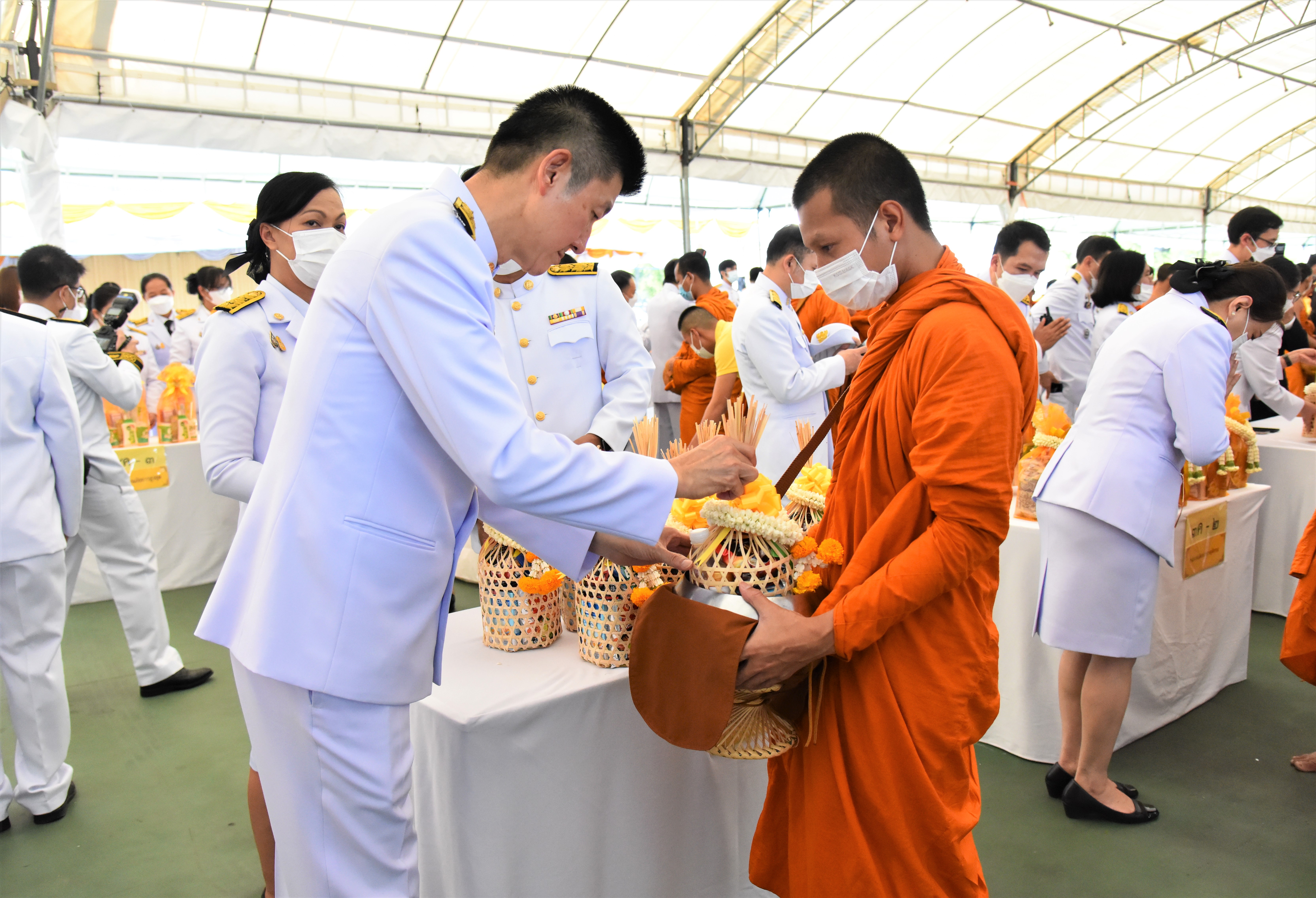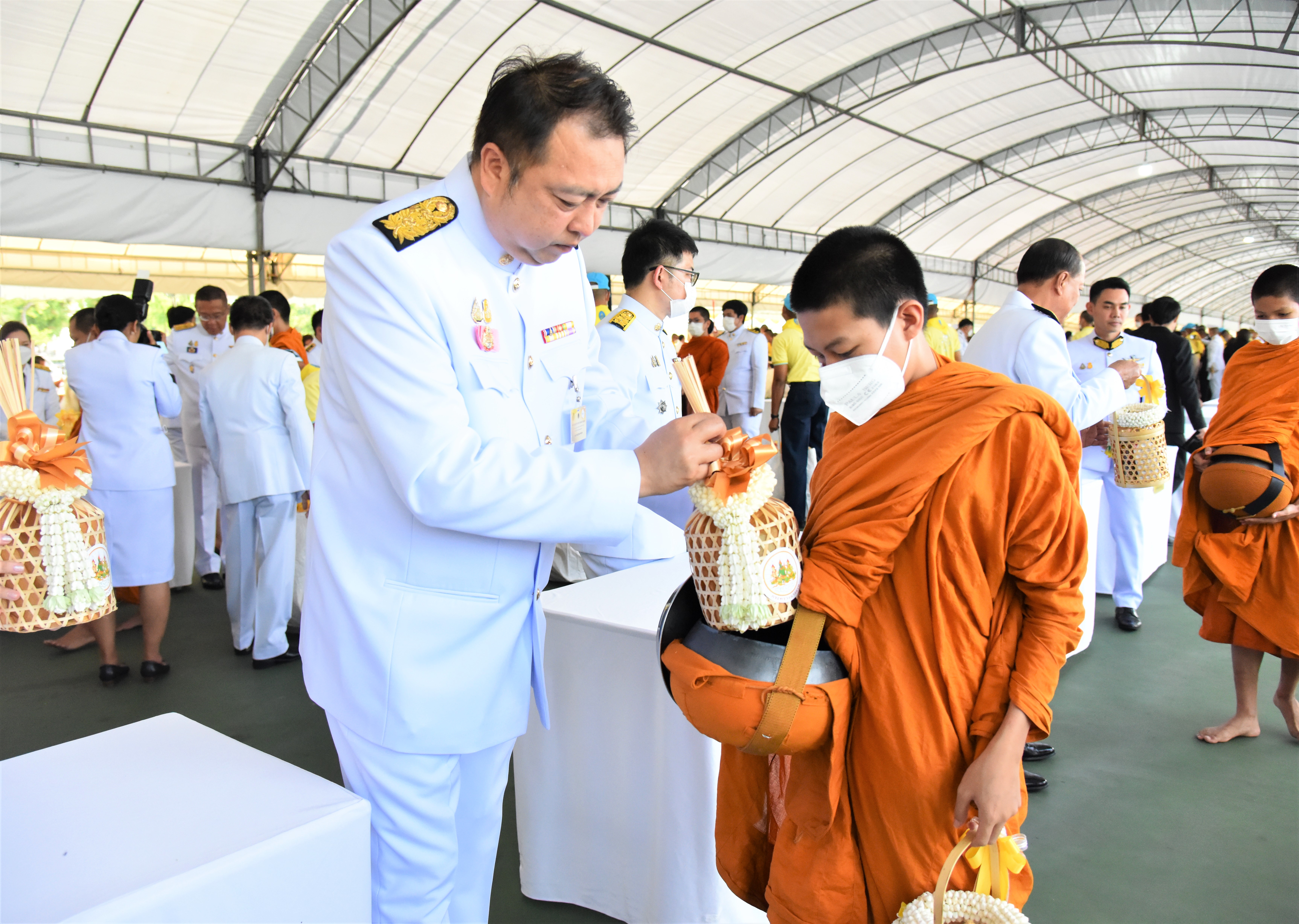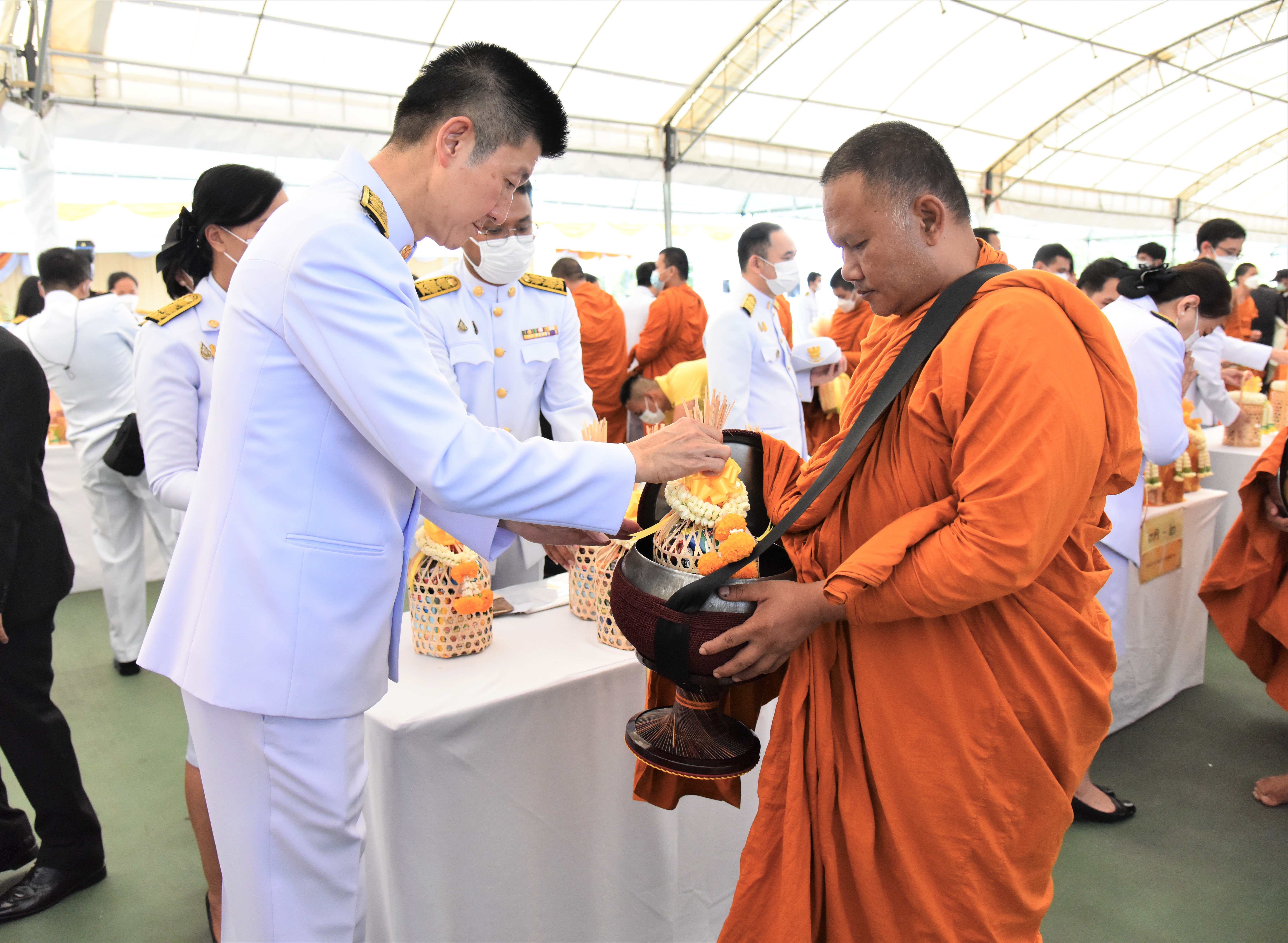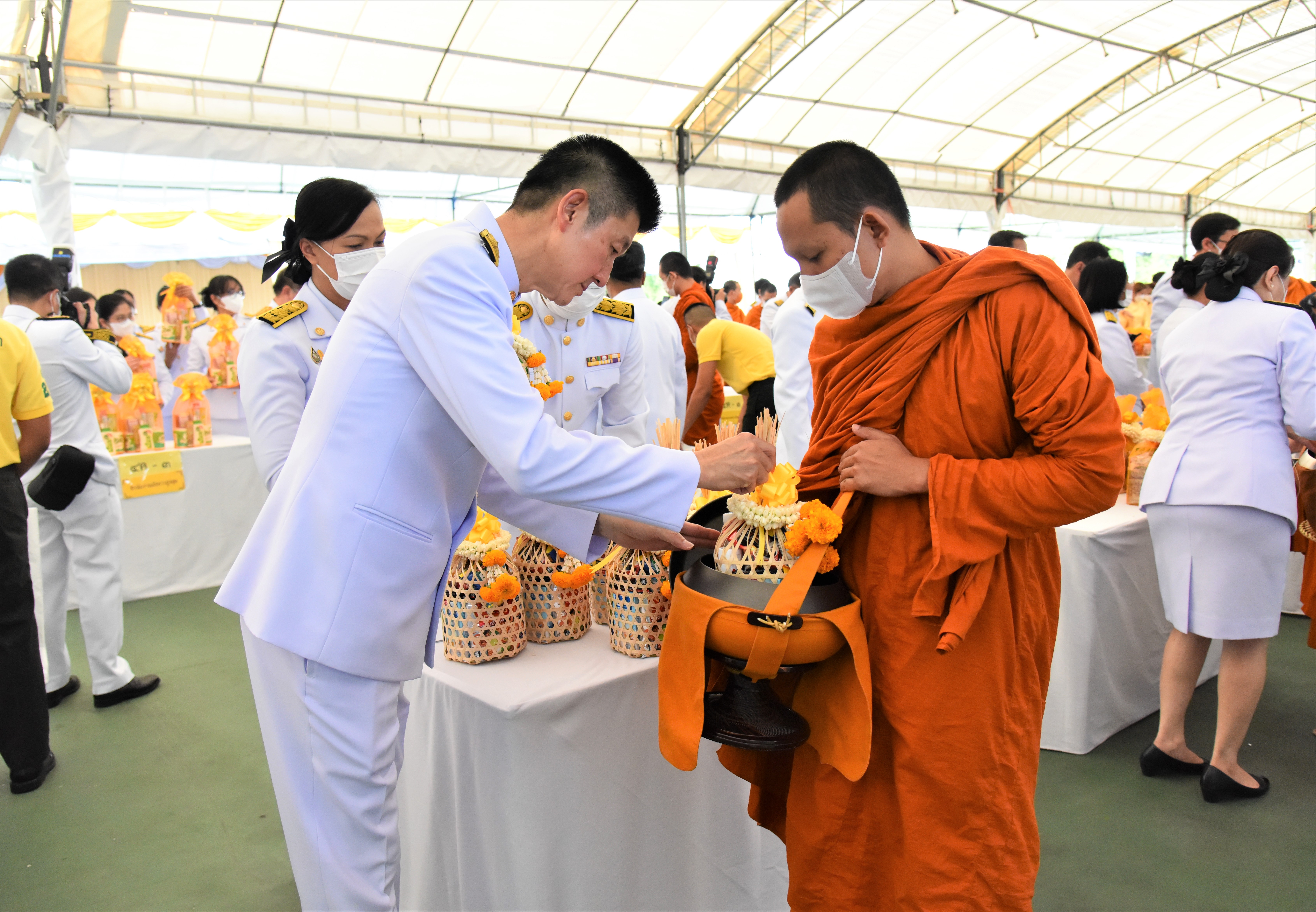 On July 28, 2023, at 07.00 hours, the Labour Minister, Mr. Suchart Chomklin, the Permanent Secretary of Labour, Mr. Boonchob Suttamanaswong, and the Ministry of Labour’s executives participated in the merit-making ceremony to offer alms to His Majesty the King on the occasion of His Majesty’s birthday on July 28, 2023. The Prime Minister and Minister of Defense, General Prayuth Chan-ocha, and wife, Mrs. Naraporn Chan-ocha, presided over the ceremony at Sanam Luang.