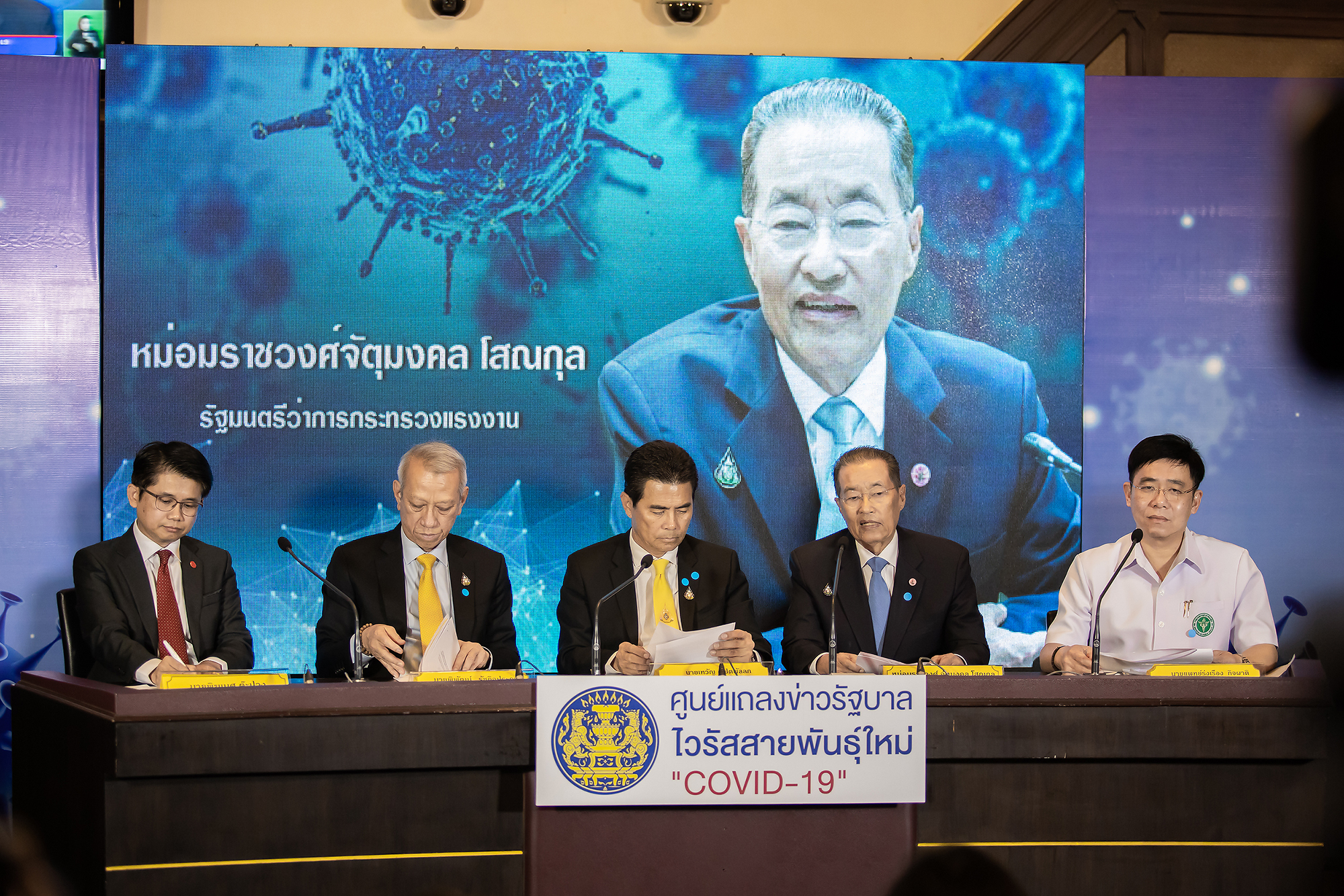 วันนี้ (13 มี.ค. 63) เวลา 14.00 น. หม่อมราชวงศ์จัตุมงคล โสณกุล รัฐมนตรีว่าการกระทรวงแรงงาน แถลงข่าวต่อสื่อมวลชนเกี่ยวกับมาตรการเยียวยาแรงงานไทยบรรเทาผลกระทบจากเชื้อไวรัสโควิด-19 ด้านความเป็นอยู่และอาชีพ พร้อมด้วย นางเธียรรัตน์ นะวะมะวัฒน์ รองปลัดกระทรวงแรงงาน เข้าร่วมในครั้งนี้ด้วย ณ ศูนย์แถลงข่าวรัฐบาลไวรัสสายพันธุ์ใหม่ (COVID-19) ตึกนารีสโมสร ทำเนียบรัฐบาล โดยแรงงานไทยที่กลับมาจากประเทศกลุ่มเสี่ยงจากการแพร่ระบาดของเชื้อไวรัสโควิด- 19 และผ่านการกักตัวเองอยู่ที่บ้านพ้น 14 วันแล้ว ทางเจ้าหน้าที่กระทรวงแรงงานในแต่ละจังหวัด จะดูแลตรวจสอบสิทธิ์การเป็นสมาชิกกองทุนเพื่อช่วยเหลือคนหางานไปทำงานในต่างประเทศ ให้แก่แรงงานไทยที่เดินทางกลับจากประเทศเสี่ยง หากเป็นสมาชิกกองทุนดังกล่าว ได้รับเงินช่วยเหลือ 15,000 บาท ซึ่งทางการของประเทศนั้นๆ ต้องประกาศเป็นประเทศที่มีโรคระบาดแล้ว ผู้ที่ประสงค์จะทำงาน กรมการจัดหางานได้เตรียมตำแหน่งว่างไว้รองรับ 60,000 อัตรา ส่วนผู้ที่ต้องการพัฒนาทักษะฝีมือและประกอบอาชีพอิสระ กรมพัฒนาฝีมือแรงงาน จะฝึกฝีมือให้ รวมถึงให้คำปรึกษาด้านกฎหมายคุ้มครองแรงงานและสิทธิประโยชน์ประกันสังคมอีกด้วย