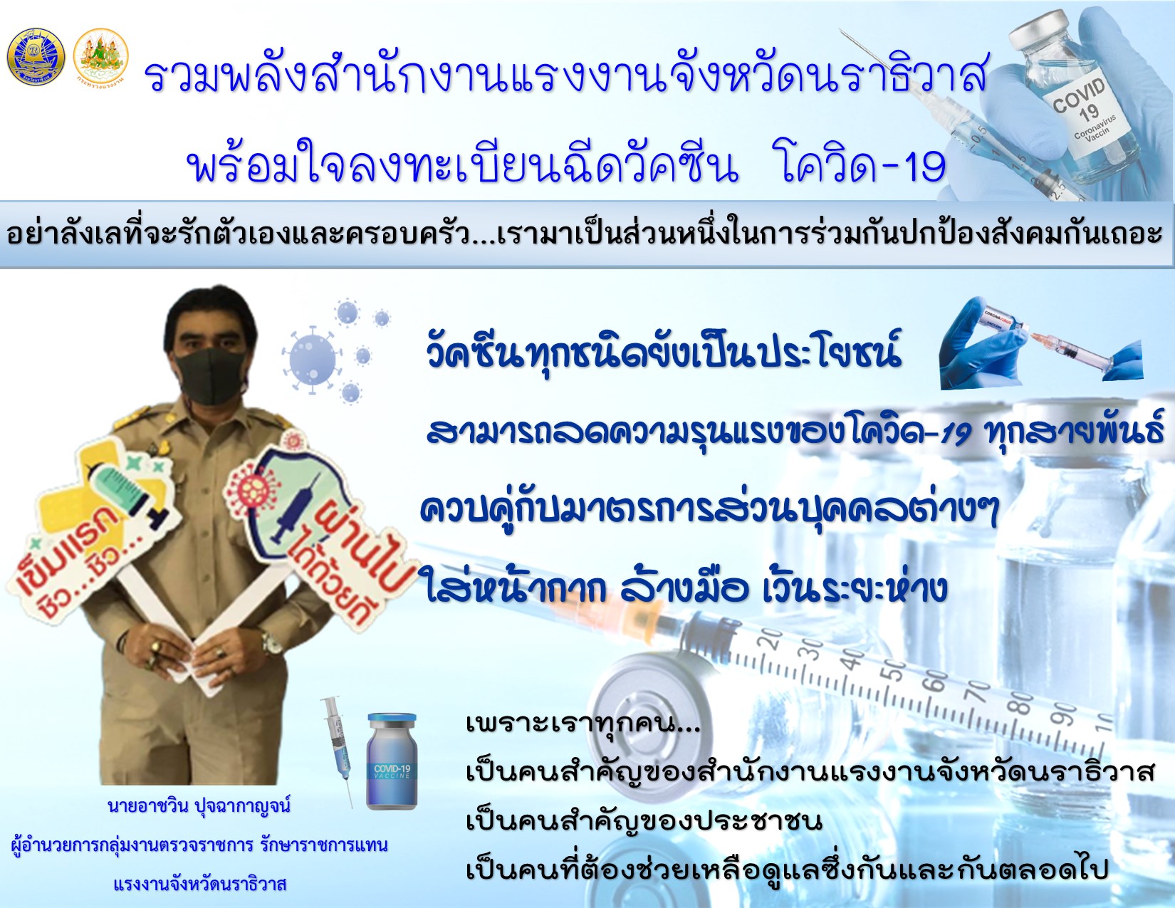 รวมพลังสำนักงานแรงงานจังหวัดนราธิวาส พร้อมใจลงทะเบียนฉีดวัคซีน โควิด-19