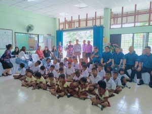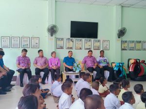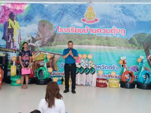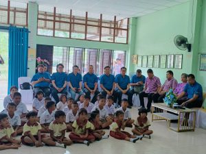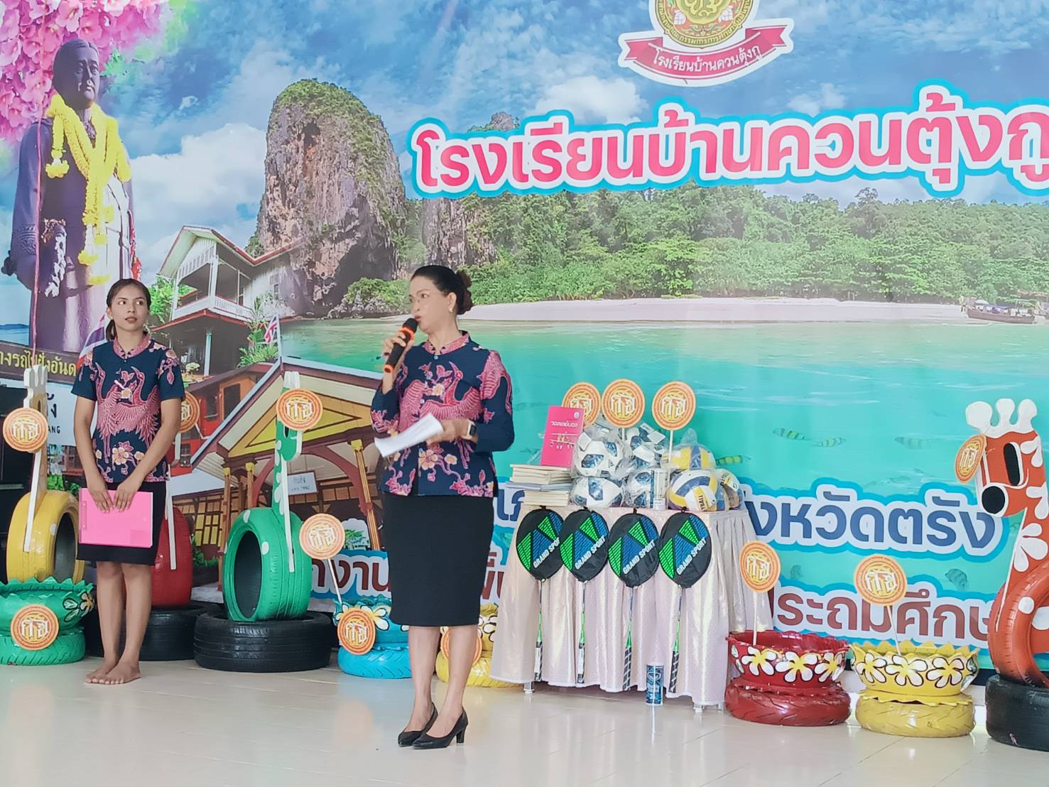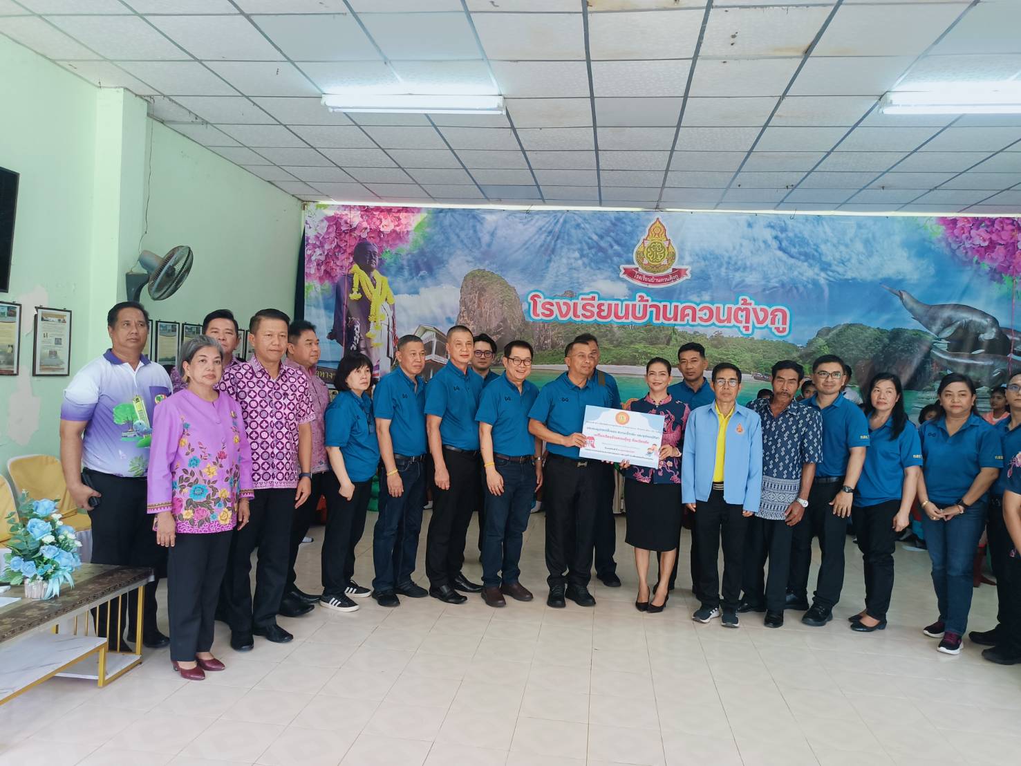 จากนั้น นายวรรณรัตน์ ศรีสุขใส รองปลัดกระทรวงแรงงาน ในฐานะประธานกรรมการ กสจ.ชุดที่ 13 นำคณะเจ้าหน้าที่ กสจ. ร่วมกิจกรรม CSR มอบเครื่องเล่นสนามเด็กเล่น อุปกรณ์กีฬา และเลี้ยงอาหารกลางวัน เพื่อแบ่งปันความสุขให้แก่เด็กนักเรียน โดยมี นางรัชดาภรณ์ หลำหลง ผู้อำนวยการโรงเรียนบ้านควนตุ้งกู คณะครู นักเรียน ร่วมให้การต้อนรับ ณ โรงเรียนบ้านควนตุ้งกู อำเภอกันตัง จังหวัดตรัง