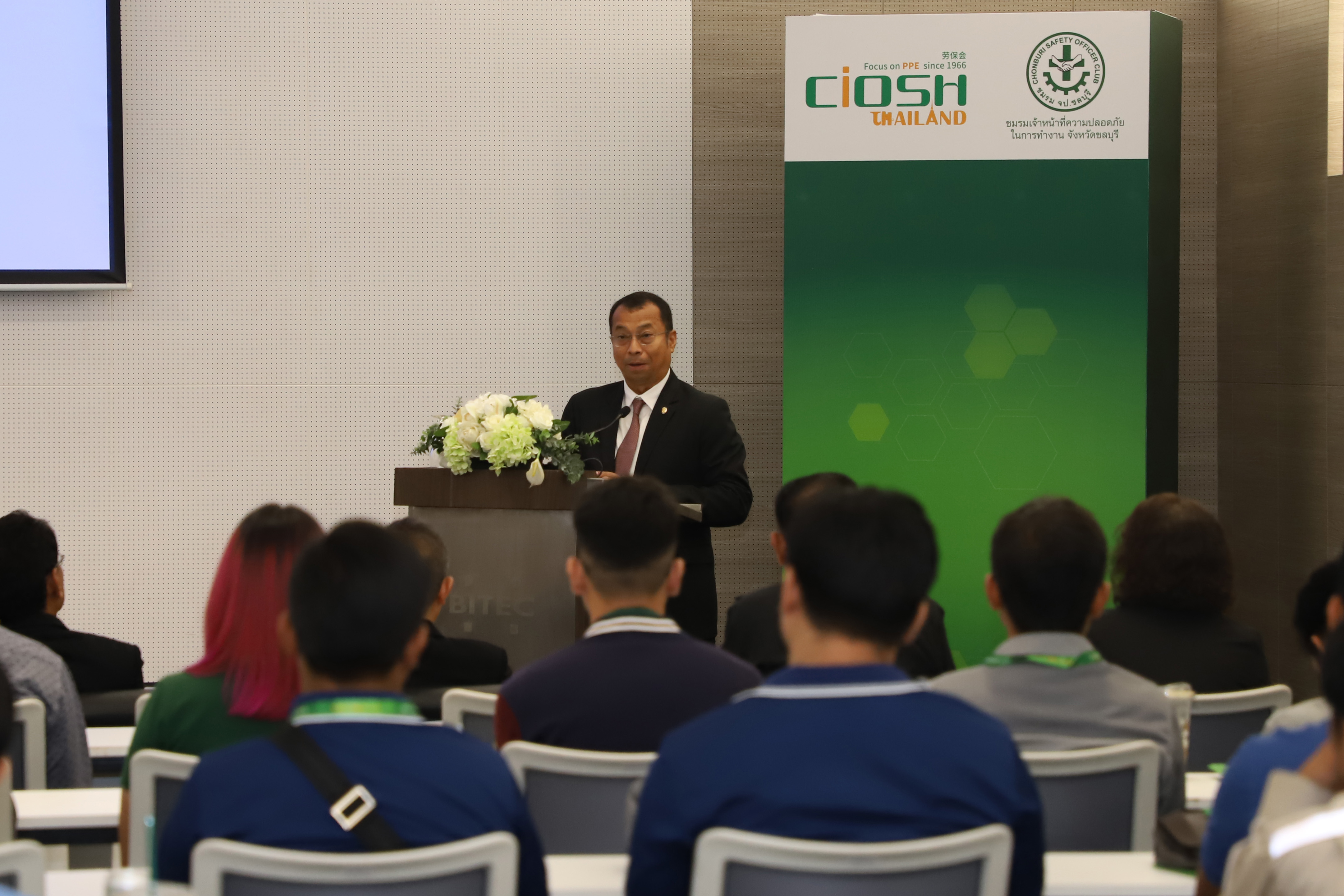 เจ้าหน้าที่ความปลอดภัยในการทำงาน ถือว่าเป็นบุคคลที่มีความสำคัญและมีคุณค่าขององค์กร เป็นกำลังสำคัญในการขับเคลื่อนงานด้านความปลอดภัยในการทำงานให้ประสบความสำเร็จ และกลไกในการถ่ายทอดความรู้ ความเข้าใจ สู่ผู้ปฏิบัติงานทุกระดับ ผมขอชื่นชมชมรมเจ้าหน้าที่ความปลอดภัยในการทำงานจังหวัดชลบุรี ที่ได้รวมตัวกันเป็นภาคีเครือข่ายที่เข้มแข็ง และร่วมกันพัฒนาความปลอดภัยในการทำงานผ่านการดำเนินงานและการจัดกิจกรรมต่าง ๆ ตลอดจนสร้างการมีส่วนร่วมให้เกิดขึ้นระหว่างภาครัฐ เครือข่ายความปลอดภัยในการทำงาน และสถานประกอบกิจการ อันแสดงให้เห็นถึงพลังในการขับเคลื่อนงานด้านความปลอดภัย อาชีวอนามัย และสภาพแวดล้อมในการทำงานที่เกิดผลสัมฤทธิ์และเป็นรูปธรรม ซึ่งผมหวังเป็นอย่างยิ่งว่าการจัดกิจกรรมที่เป็นประโยชน์ในครั้งนี้ จะเป็นโอกาสที่ทุกท่านจะได้รับความรู้ในการปฏิบัติงานบนที่สูงและวิธิการเลือกใช้อุปกรณ์ป้องกันเพื่อลดความเสี่ยงในการเกิดโรคจากการทำงาน และนำไปเผยแพร่และสร้างการรับรู้ในวงกว้าง และพัฒนาจนเป็นวัฒนธรรมความปลอดภัยในการทำงานขึ้นในสังคมไทย เพื่อให้ผู้ใช้แรงงานมีคุณภาพชีวิติที่ดีและมีความปลอดภัยในการทำงาน นายวรรณรัตน์ กล่าวท้ายสุด