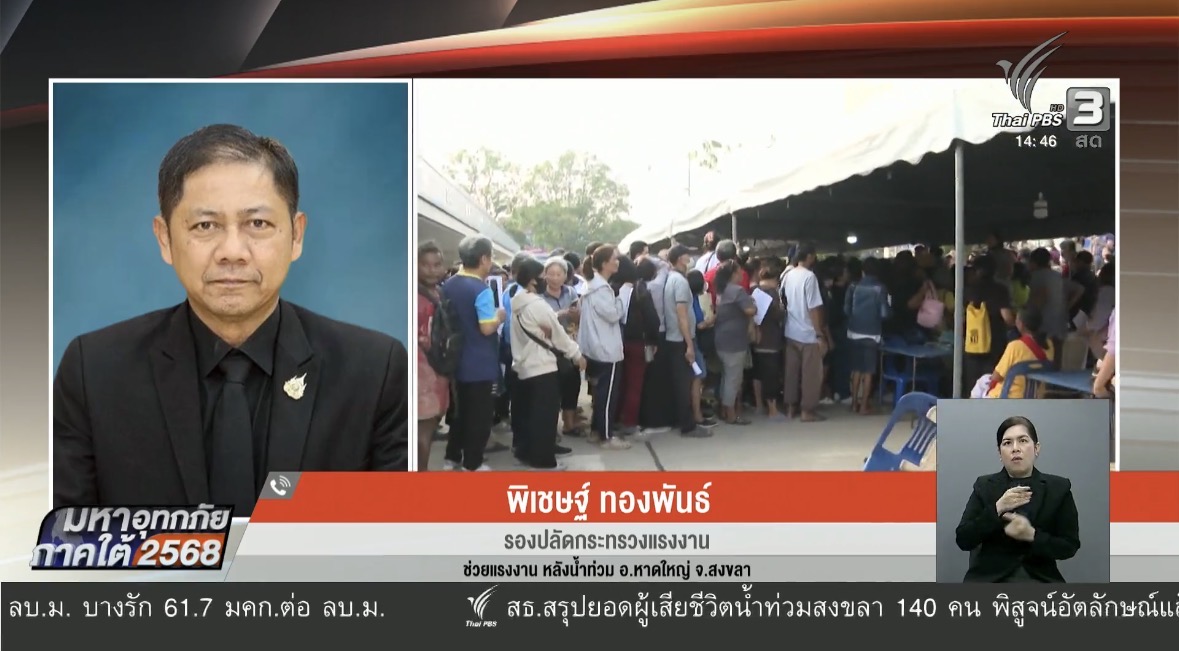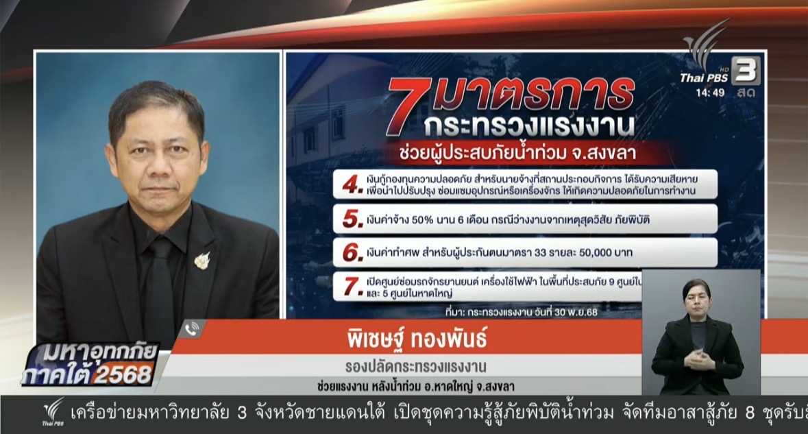 วันที่ 2 ธันวาคม 2568 เวลา 14.30 น. พันตำรวจโท วรรณพงษ์ คชรักษ์ ปลัดกระทรวงแรงงาน มอบหมายให้ นายพิเชษฐ์ ทองพันธ์ รองปลัดกระทรวงแรงงาน ให้สัมภาษณ์สดทางโทรศัพท์ ประเด็น มาตรการกระทรวงแรงงานช่วยเหลือแรงงานที่ได้รับผลกระทบจากน้ำท่วม อ.หาดใหญ่ จ.สงขลา ทางสถานีโทรทัศน์ Thai PBS ณ ห้องปฏิบัติราชการชั้น 9 อาคารกระทรวงแรงงาน