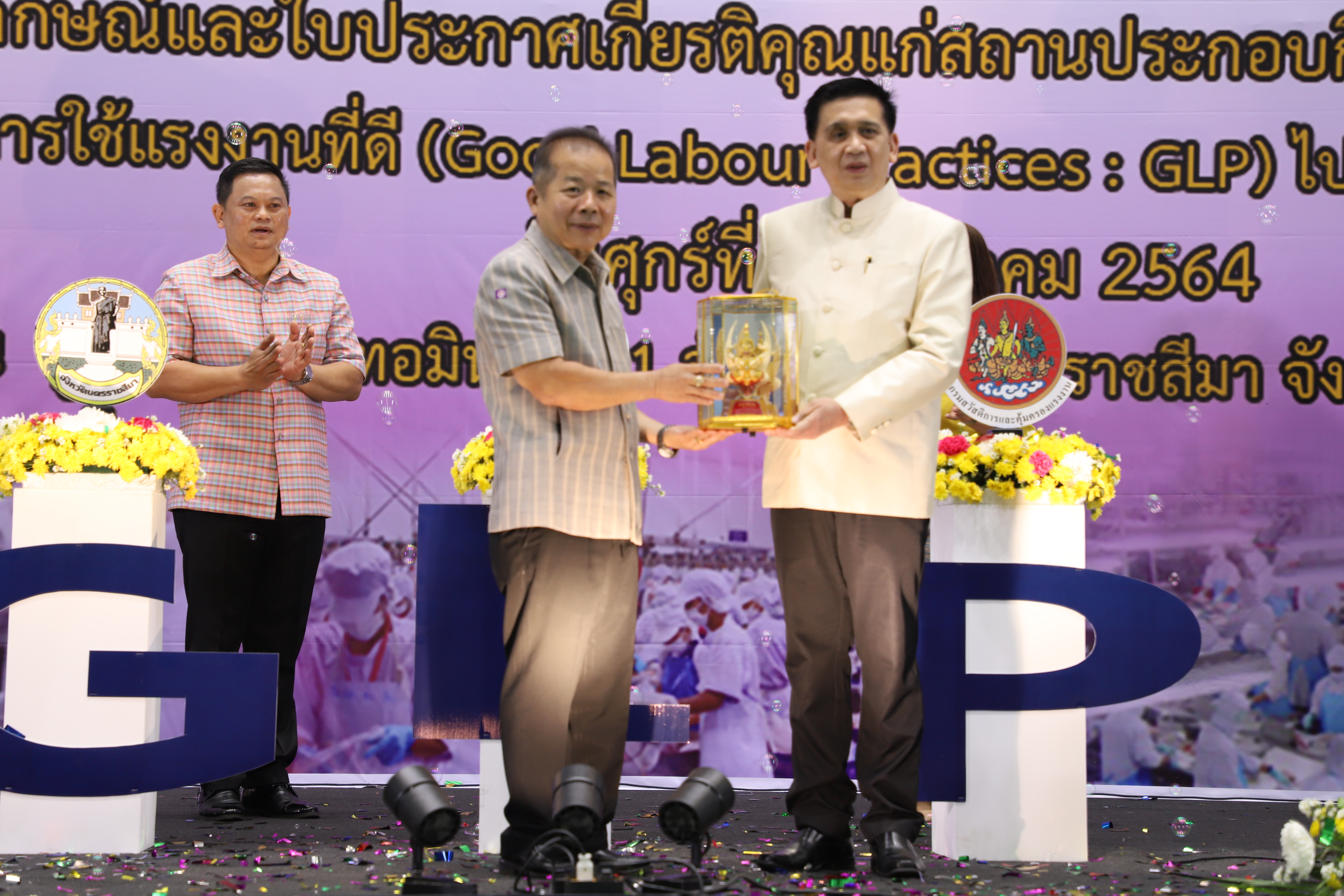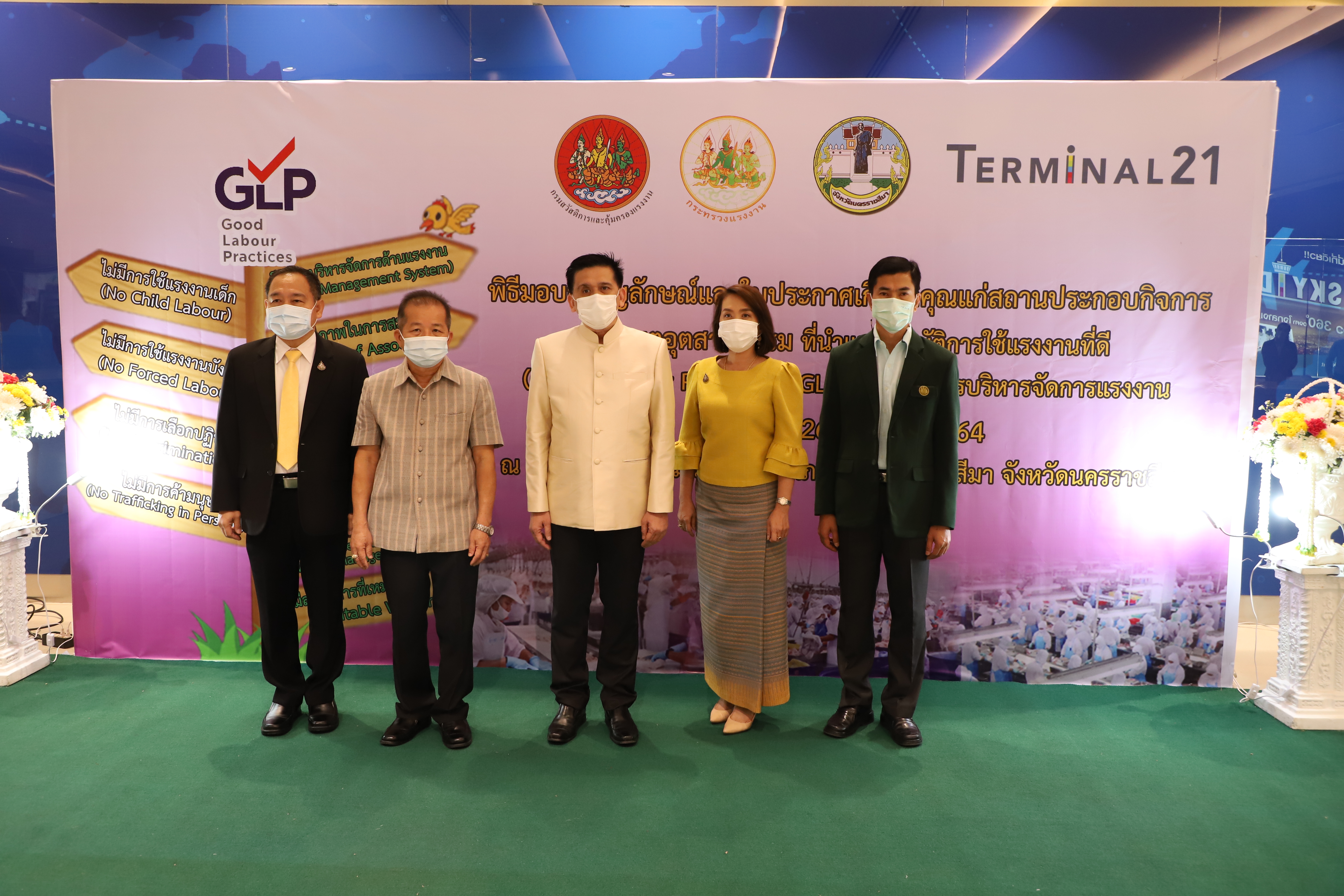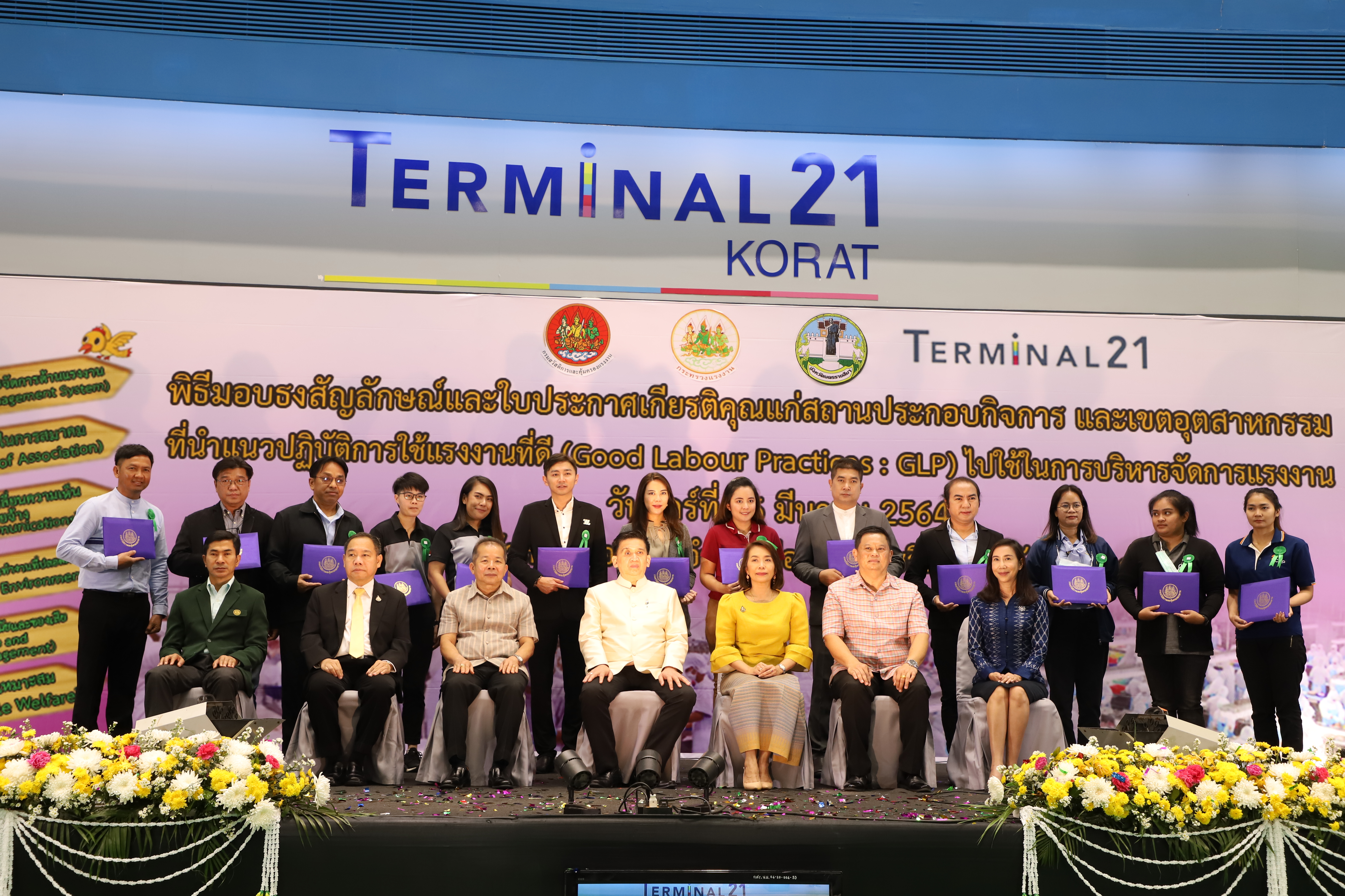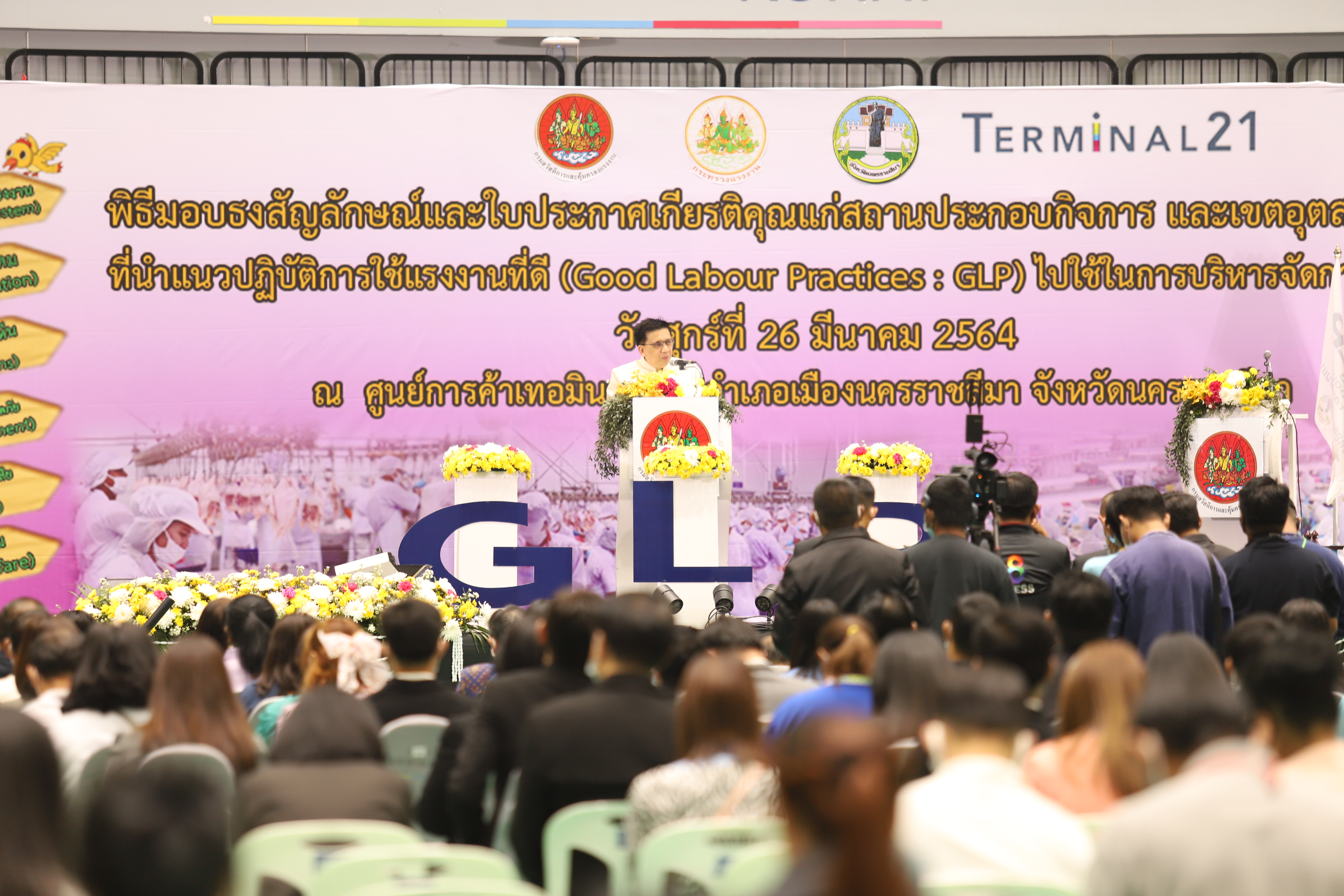 วันที่ 26 มีนาคม 2564 เวลา 10.00 น. นายไพโรจน์ โชติกเสถียร รองปลัดกระทรวงแรงงาน เป็นประธานในพิธีมอบธงสัญลักษณ์และใบประกาศเกียรติคุณแก่สถานประกอบกิจการ และเขตอุตสาหกรรมที่นำแนวปฏิบัติที่ดี (Good Labour Practices : GLP) ไปใช้ในการบริหารจัดการแรงงาน โดยสอดคล้องกับมาตรฐานแรงงานตามหลักสากล ส่งผลให้ผู้ใช้แรงงานมีความมั่นคงและคุณภาพชีวิตในการทำงานที่ดีขึ้น นำไปสู่การสร้างความเชื่อมั่นต่อนักลงทุน และการเพิ่มขีดความสามารถในการแข่งขันทางการค้า อันจะช่วยให้สินค้าที่ผลิตในประเทศไทยได้รับการยอมรับในแง่ของความรับผิดชอบต่อสังคม โดยมี นายประทีป ทรงลำยอง ผู้ตรวจราชการกระทรวงแรงงาน เข้าร่วมในครั้งนี้ด้วย ณ Terminal Hall ชั้น 4 ศูนย์การค้าเทอมินอล 21 จังหวัดนครราชสีมา ทั้งนี้ รองปลัดกระทรวงแรงงาน กล่าวว่า รัฐบาลภายใต้การนำของ พลเอก ประยุทธ์ จันทร์โอชา นายกรัฐมนตรีและรัฐมนตรีว่าการกระทรวงกลาโหม และกระทรวงแรงงานภายใต้การนำของ พลเอก ประวิตร วงษ์สุวรรณ รองนายกรัฐมนตรี ให้ความสำคัญกับการขับเคลื่อนประเทศ โดยมุ่งหวังที่จะยกระดับคุณภาพชีวิตในการทำงานให้ดีขึ้น เพื่อนำประเทศไทยเข้าสู่ “ความมั่นคง มั่งคั่ง ยั่งยืน”