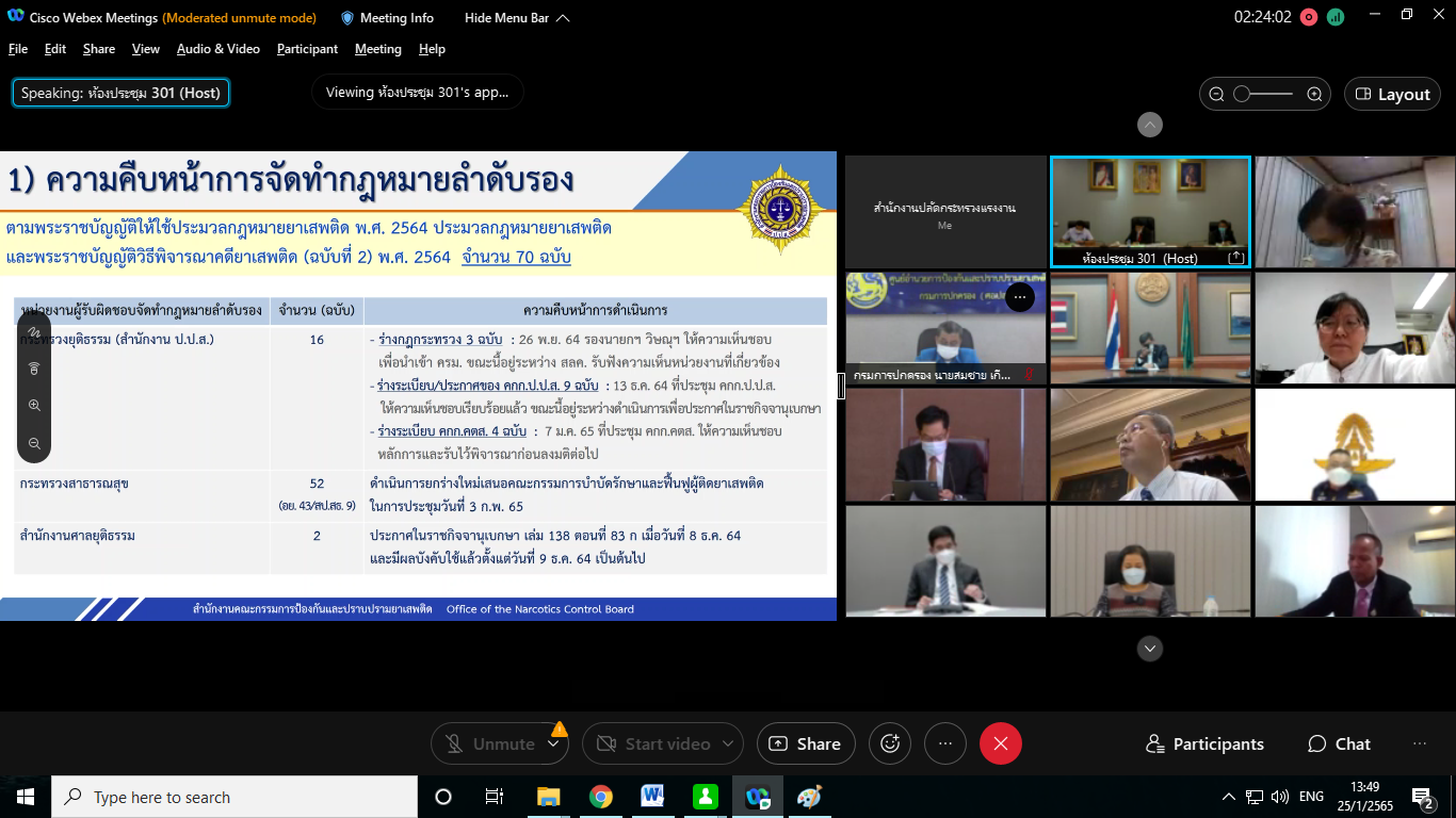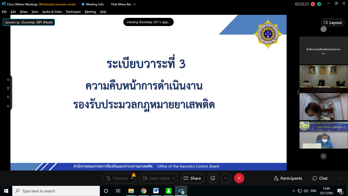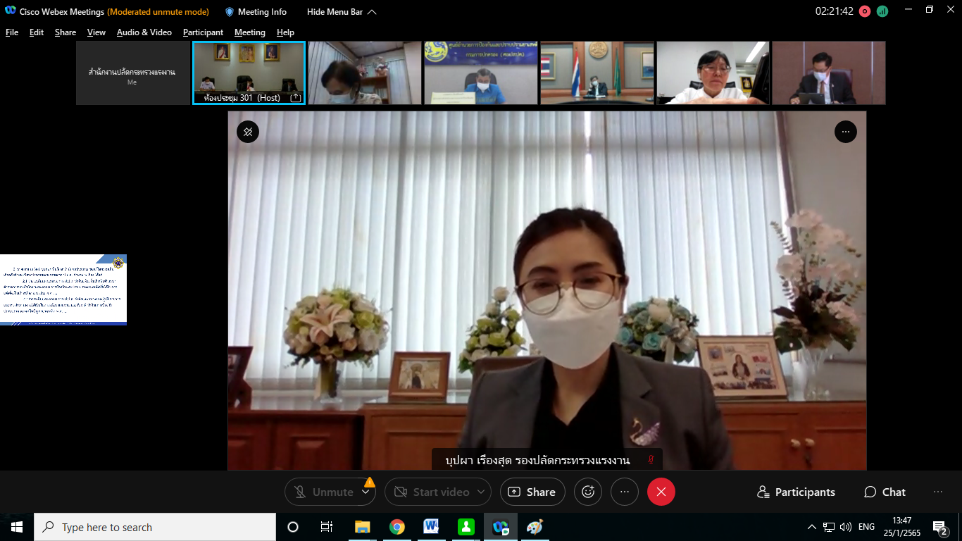 วันที่ 25 มกราคม 2565 เวลา 13.30 น. นางสาวบุปผา เรืองสุด รองปลัดกระทรวงแรงงาน ร่วมการประชุมคณะกรรมการป้องกันและปราบปรามยาเสพติด (คณะกรรมการ ป.ป.ส.) ครั้งที่ 1/2565 ผ่านระบบ (Cisco Webex) ณ ห้องทำงานรองปลัดกระทรวงแรงงาน ชั้น 7 อาคารกระทรวงแรงงาน
