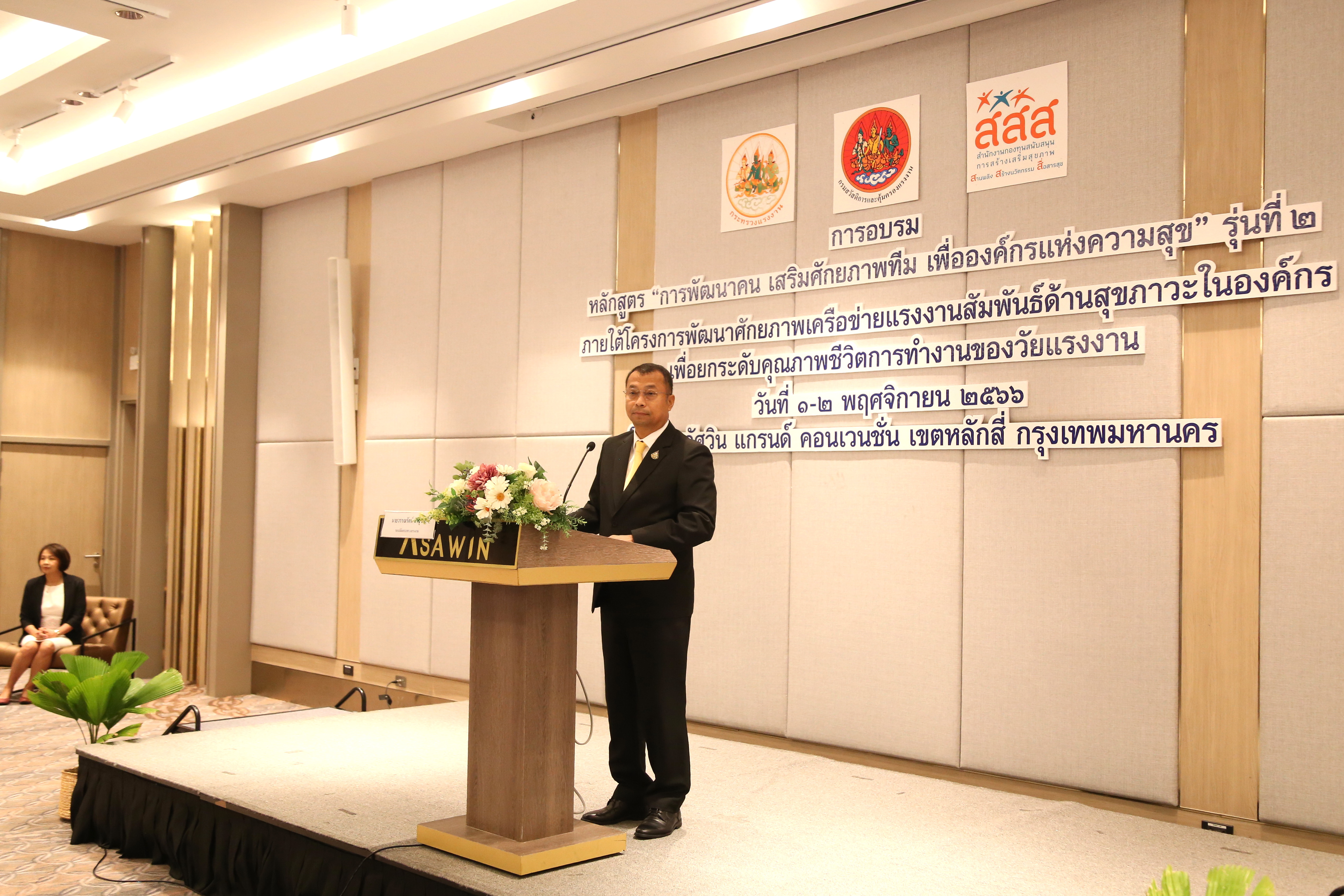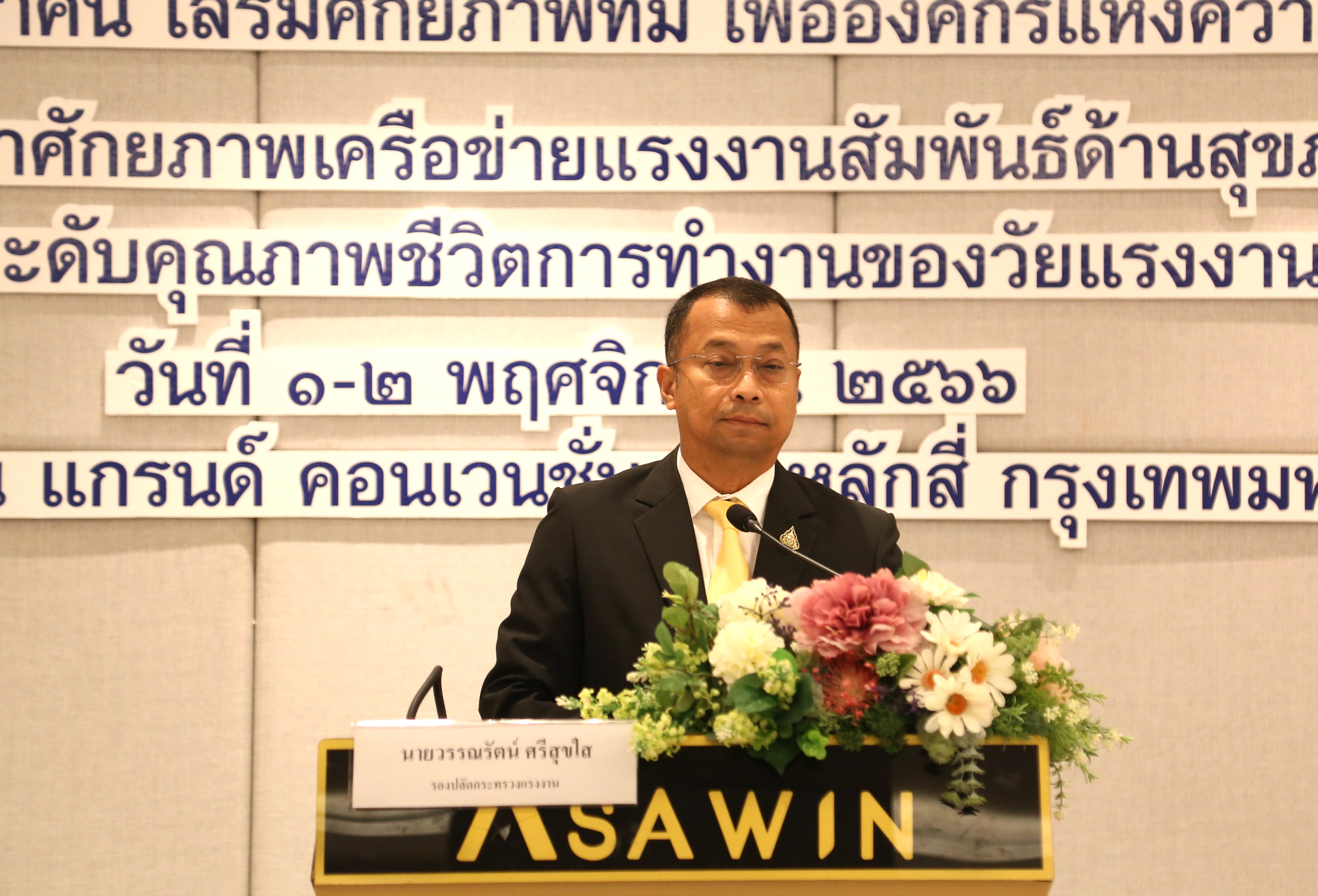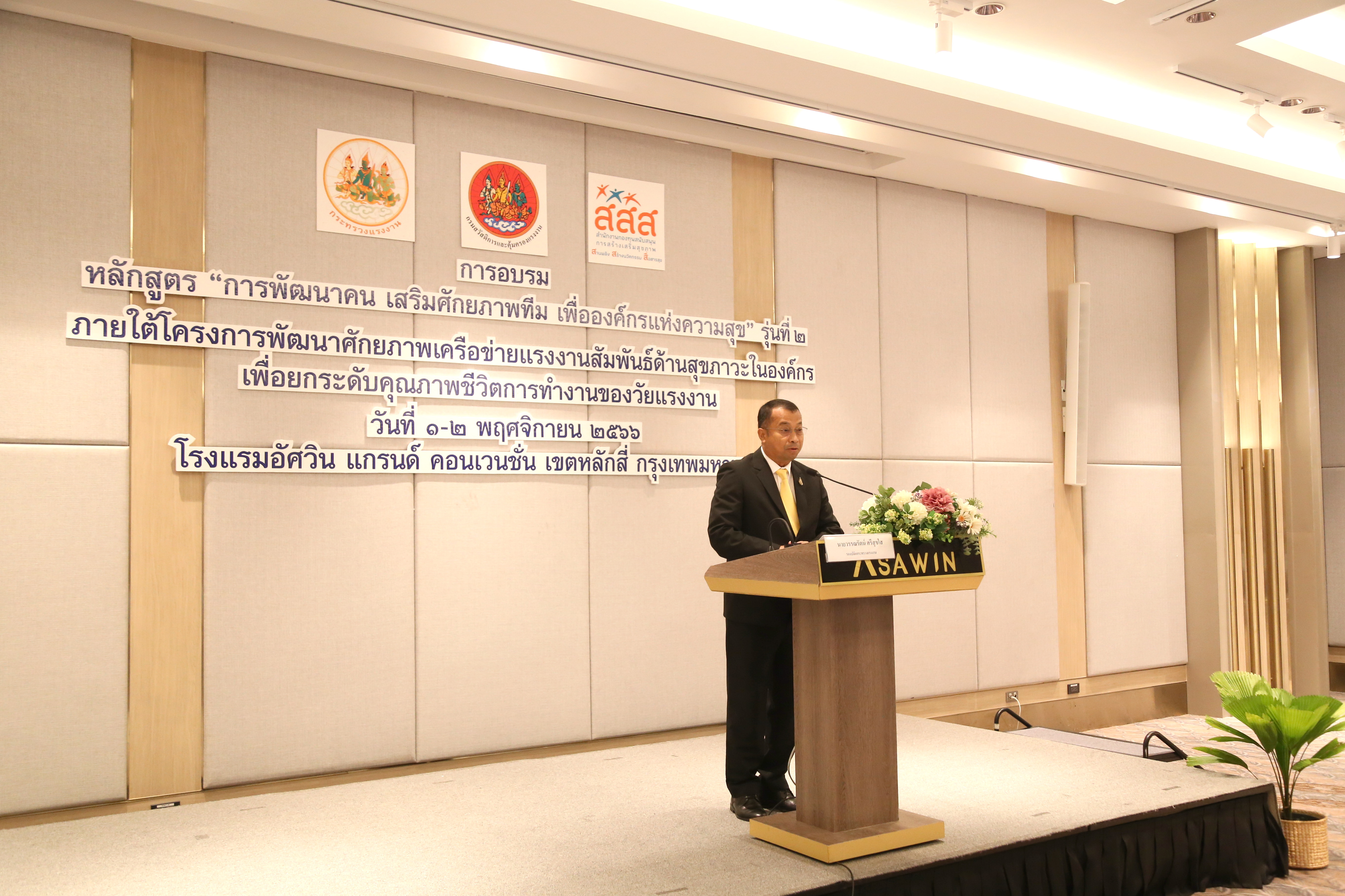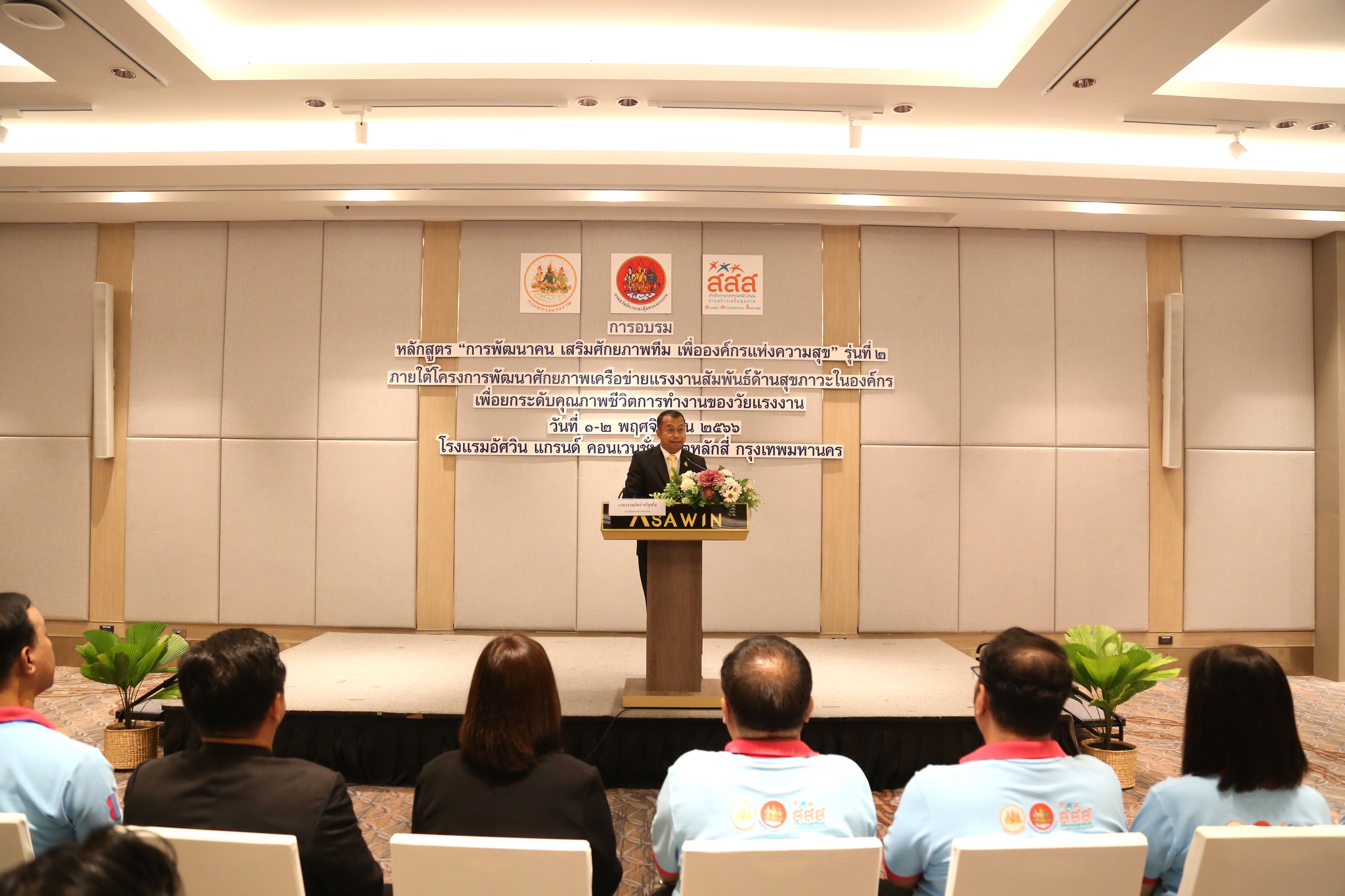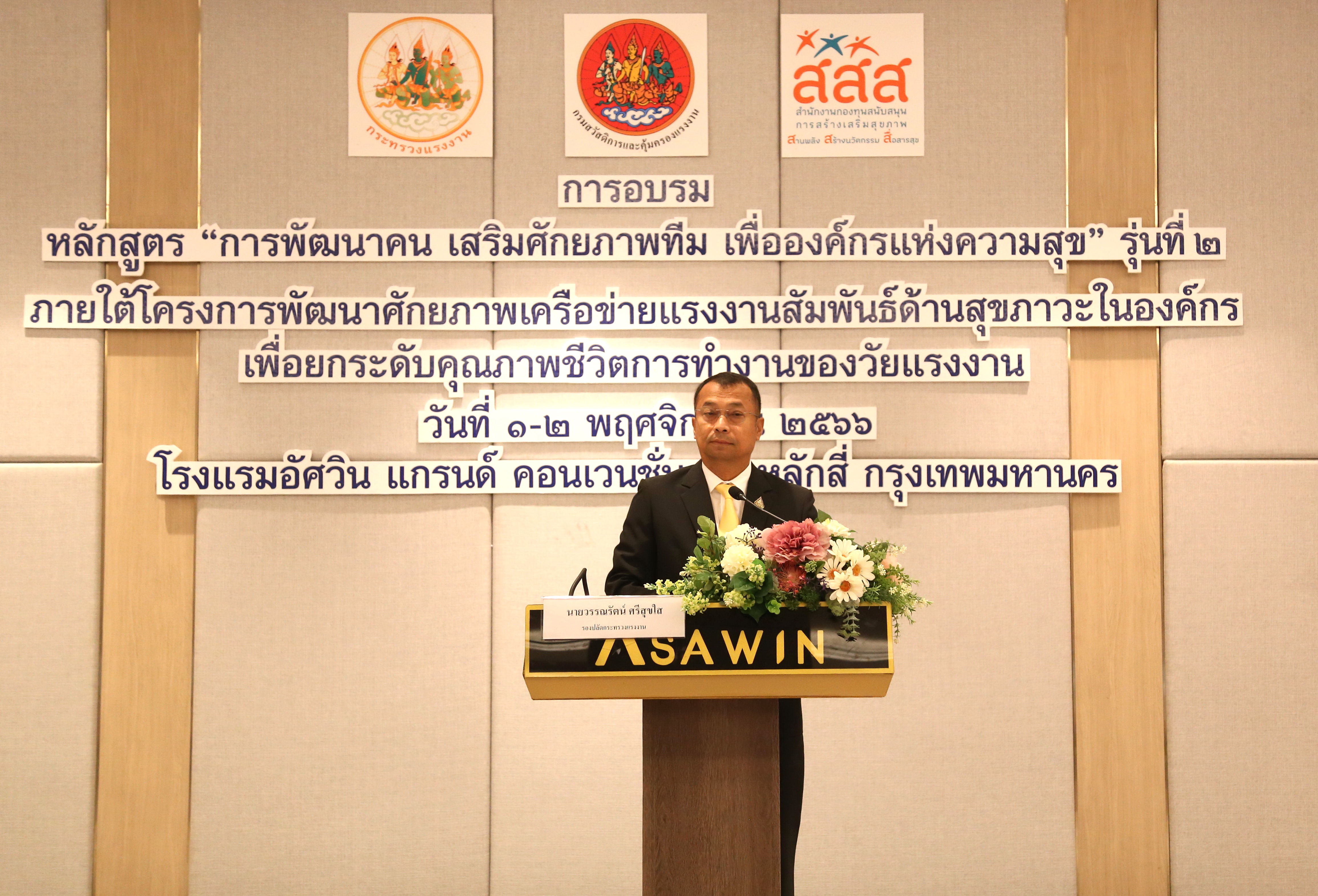 วันที่ 1 พฤศจิกายน 2566 เวลา 9.00 น. นายวรรณรัตน์ ศรีสุขใส รองปลัดกระทรวงแรงงาน เป็นประธานพิธีเปิดการอบรม หลักสูตร “การพัฒนาคน เสริมศักยภาพทีม เพื่อองค์กรแห่งความสุข” รุ่นที่ 2 โครงการพัฒนาศักยภาพเครือข่ายแรงงานสัมพันธ์ด้านสุขภาวะในองค์กร เพื่อยกระดับคุณภาพชีวิตการทำงานของวัยแรงงาน ณ ห้องพระอินทร์ โรงแรมอัศวิน แกรนด์ คอนเวนชั่น ถนนวิภาวดีรังสิต กรุงเทพมหานคร