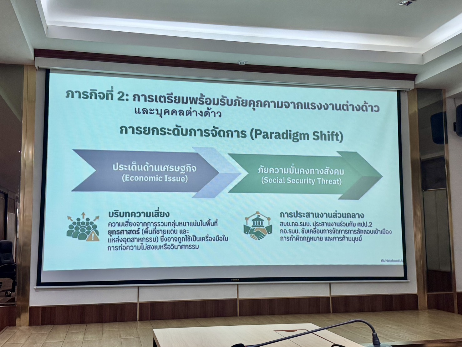การเฝ้าระวังแรงงานต่างด้าวติดตามสถานภาพและพฤติกรรมของแรงงานต่างด้าวที่อาจส่งผลกระทบต่อความมั่นคง โดยเฉพาะกลุ่มที่มีการรวมตัวและมีพฤติกรรมก่อกวน รวมถึง เปิดเวทีให้ กอ.รมน. จังหวัดที่เกี่ยวข้องรวม 21 จังหวัด ชี้แจงปัญหาและข้อขัดข้องในพื้นที่เพื่อหาแนวทางแก้ไขร่วมกัน