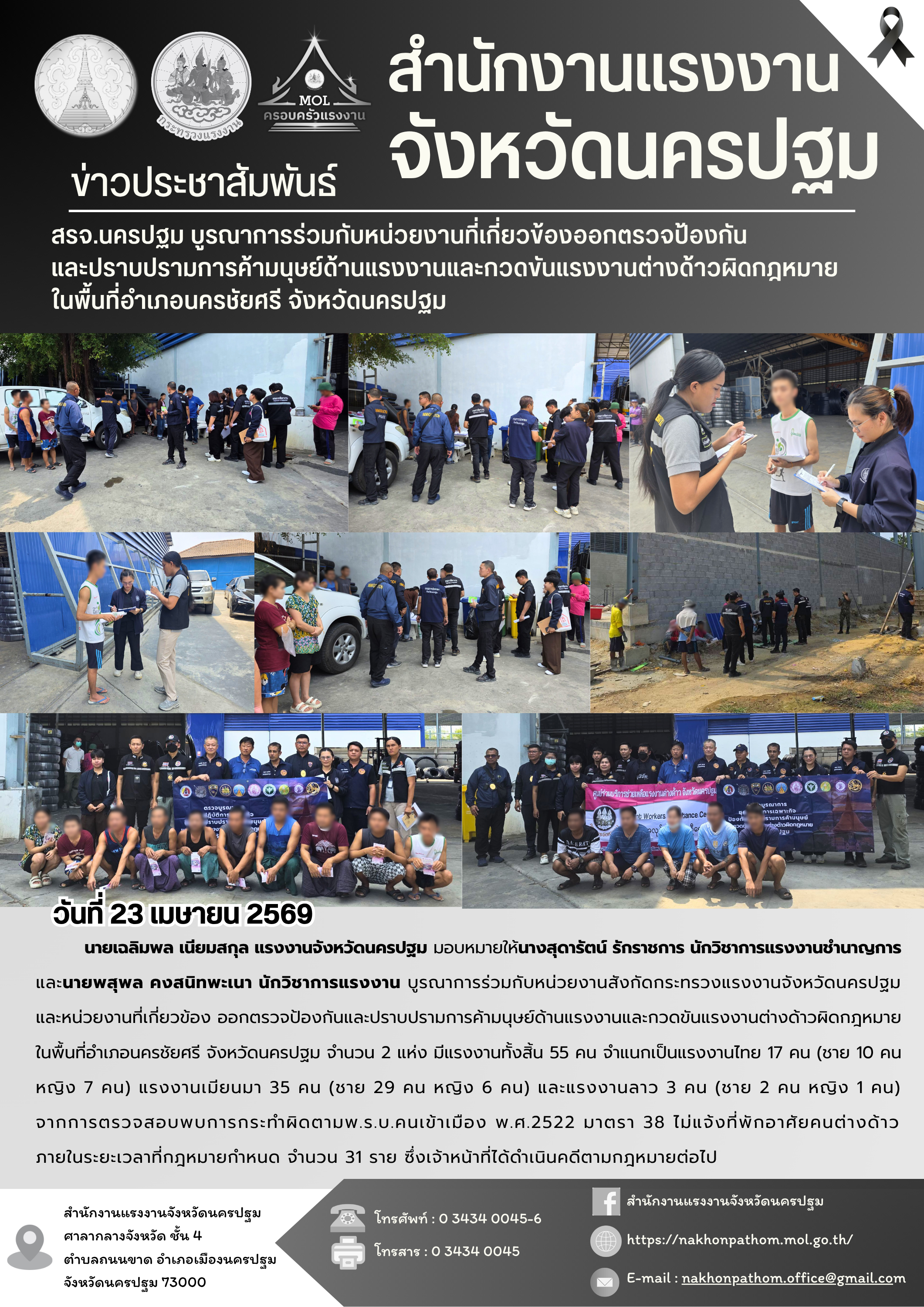 สรจ.นครปฐม บูรณาการร่วมกับหน่วยงานที่เกี่ยวข้องออกตรวจป้องกันและปราบปรามการค้ามนุษย์ด้านแรงงานและกวดขันแรงงานต่างด้าวผิดกฎหมาย ในพื้นที่อำเภอนครชัยศรี จังหวัดนครปฐม