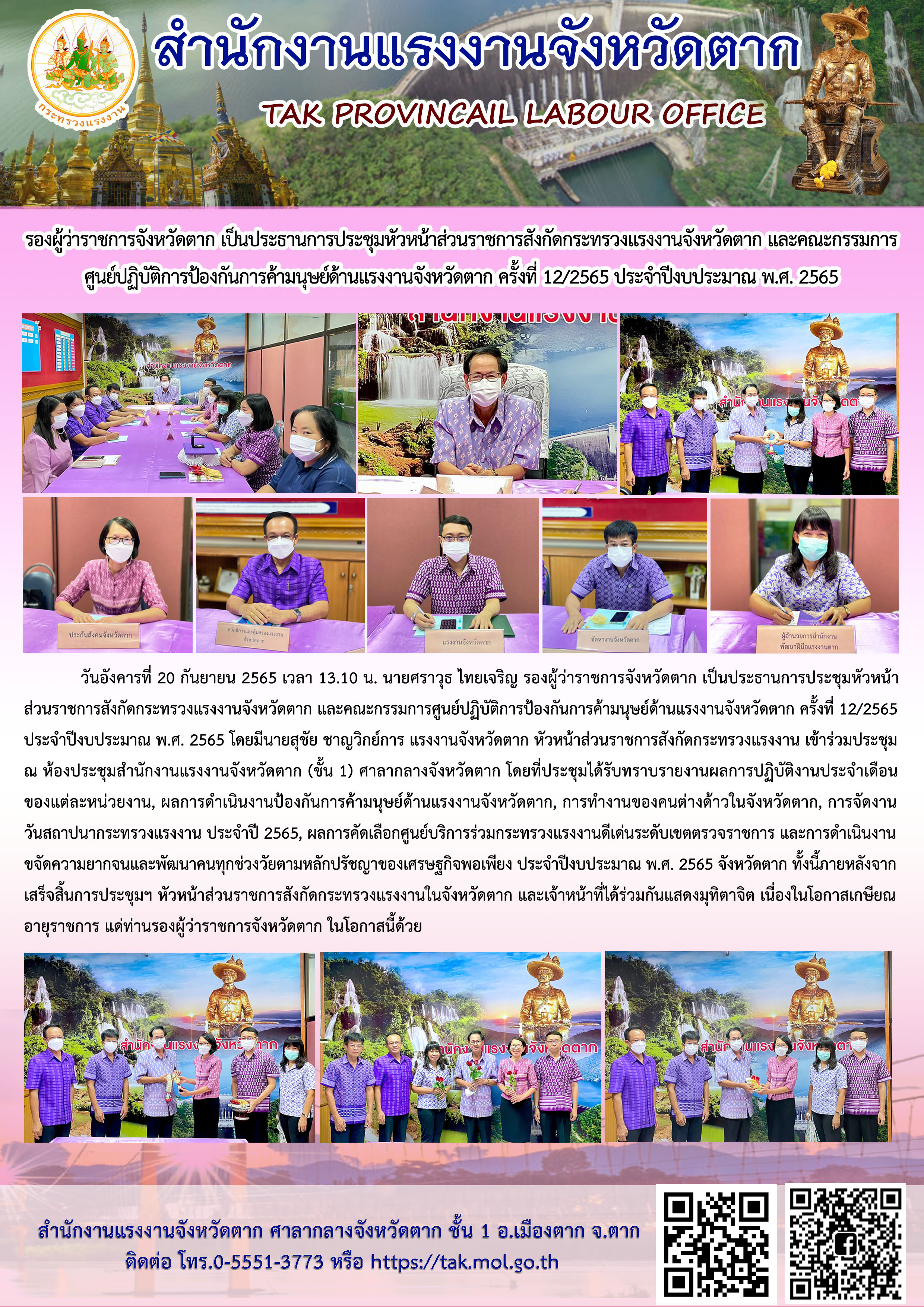 รองผู้ว่าราชการจังหวัดตาก เป็นประธานการประชุมหัวหน้าส่วนราชการสังกัดกระทรวงแรงงานจังหวัดตาก และคณะกรรมการศูนย์ปฏิบัติการป้องกันการค้ามนุษย์ด้านแรงงานจังหวัดตาก ครั้งที่ 12/2565 ประจำปีงบประมาณ พ.ศ.2565