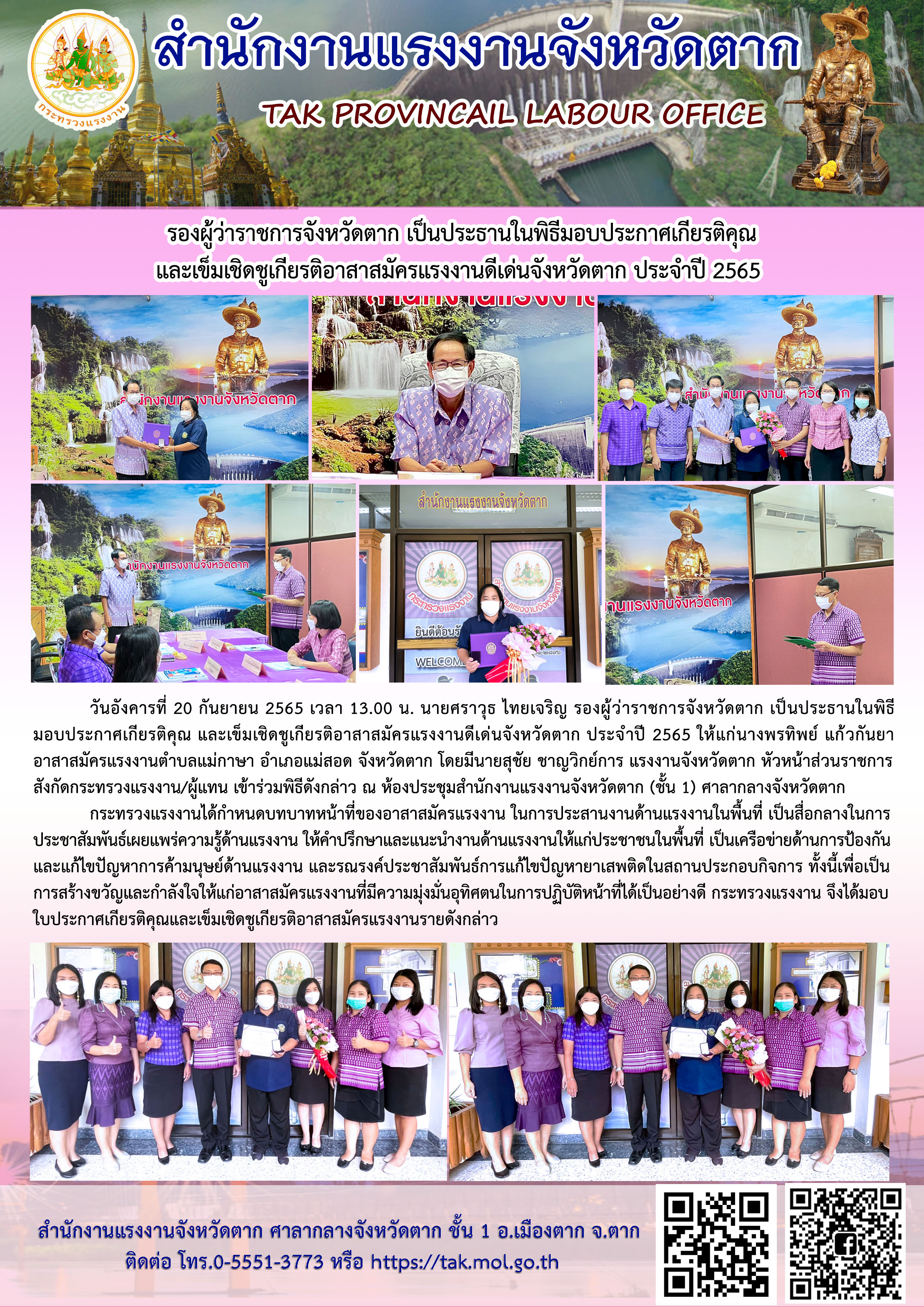 รองผู้ว่าราชการจังหวัดตาก เป็นประธานในพิธีมอบประกาศเกียรติคุณ และเข็มเชิดชูเกียรติอาสาสมัครแรงงานดีเด่นจังหวัดตาก ประจำปี 2565