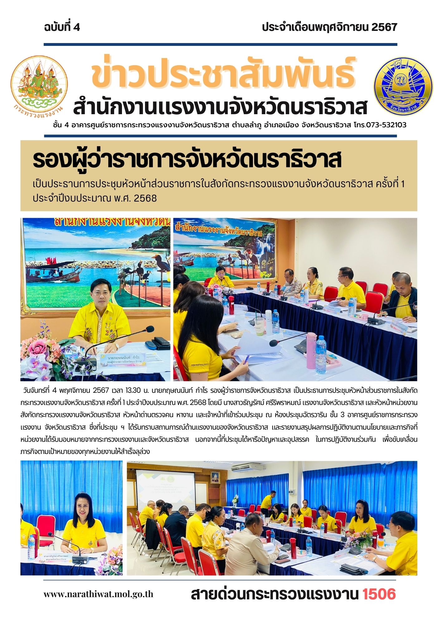 วันจันทร์ที่ 4 พฤศจิกายน 2567 เวลา 13.30 น. นายกฤษณนันท์ กำไร รองผู้ว่าราชการจังหวัดนราธิวาส เป็นประธานการประชุมหัวหน้าส่วนราชการในสังกัดกระทรวงแรงงานจังหวัดนราธิวาส ครั้งที่ 1 ประจำปีงบประมาณ พ.ศ. 2568 โดยมี นางสาวธัญรัศม์ ศรีริพราหมณ์ แรงงานจังหวัดนราธิวาส และหัวหน้าหน่วยงานสังกัดกระทรวงแรงงานจังหวัดนราธิวาส หัวหน้าด่านตรวจคน หางาน และเจ้าหน้าที่เข้าร่วมประชุม ณ ห้องประชุมฉัตรวาริน ชั้น 3 อาคารศูนย์ราชการกระทรวงแรงงาน จังหวัดนราธิวาส ซึ่งที่ประชุม ฯ ได้รับทราบสถานการณ์ด้านแรงงานของจังหวัดนราธิวาส และรายงานสรุปผลการปฏิบัติงานตามนโยบายและภารกิจที่หน่วยงานได้รับมอบหมายจากกระทรวงแรงงานและจังหวัดนราธิวาส นอกจากนี้ที่ประชุมได้หารือปัญหาและอุปสรรค ในการปฏิบัติงานร่วมกัน เพื่อขับเคลื่อนภารกิจตามเป้าหมายของทุกหน่วยงานให้สำเร็จลุล่วง