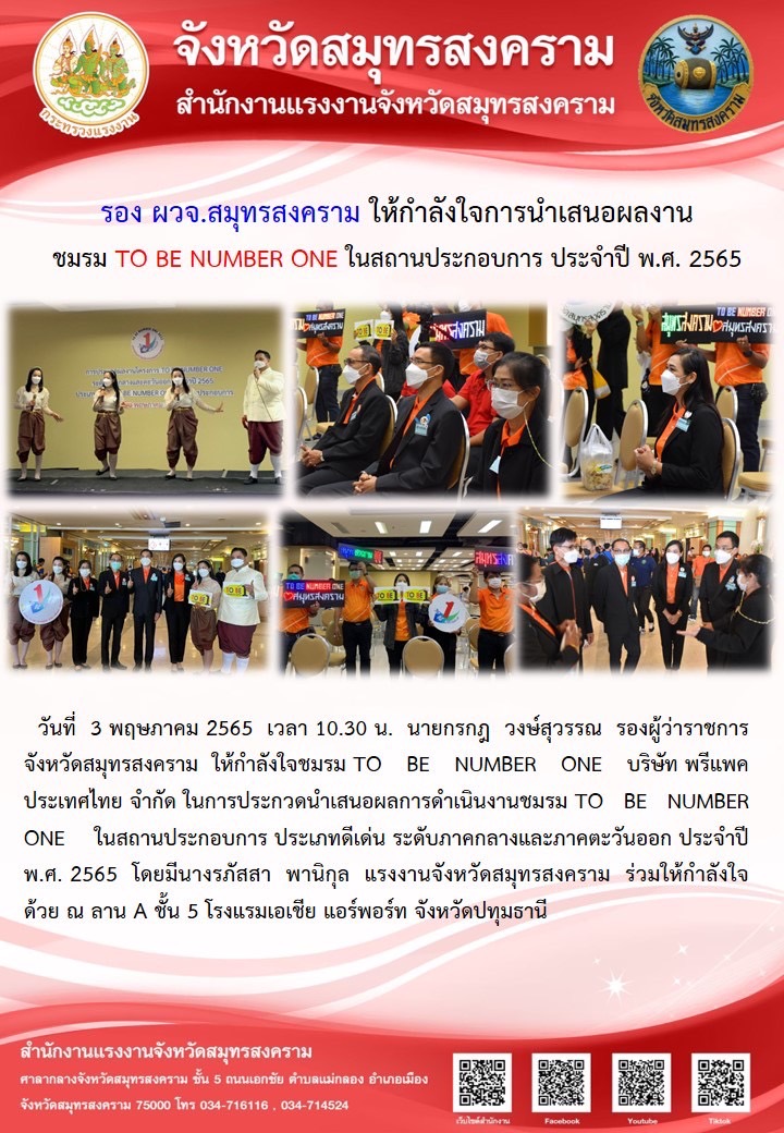 วันที่ 3 พฤษภาคม 2565 เวลา 10.30 น. นายกรกฎ วงษ์สุวรรณ รองผู้ว่าราชการจังหวัดสมุทรสงคราม ให้กำลังใจชมรม TO BE NUMBER ONE บริษัท พรีแพค ประเทศไทย จำกัด ในการประกวดนำเสนอผลการดำเนินงานชมรม TO BE NUMBER ONE ในสถานประกอบการ ประเภทดีเด่น ระดับภาคกลางและภาคตะวันออก ประจำปี พ.ศ. 2565 โดยมีนางรภัสสา พานิกุล แรงงานจังหวัดสมุทรสงคราม ร่วมให้กำลังใจด้วย ณ ลาน A ชั้น 5 โรงแรมเอเชีย แอร์พอร์ท จังหวัดปทุมธานี