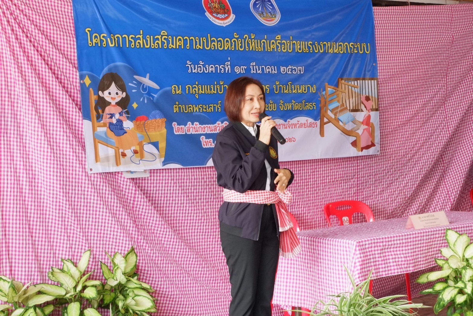 โดยในช่วงบ่าย นางมารศรี ใจรังษี รองเลขาธิการสำนักงานประกันสังคม รักษาการในตำแหน่งผู้ตรวจราชการกระทรวงแรงงาน พร้อมด้วยหัวหน้าส่วนราชการสังกัดกระทรวงแรงงานจังหวัดยโสธร ลงพื้นที่ตรวจเยี่ยมโครงการส่งเสริมความปลอดภัยให้แก่เครือข่ายแรงงานนอกระบบ โดยสํานักงานสวัสดิการและคุ้มครองแรงงานจังหวัดยโสธร มีผู้เข้าร่วมโครงการฯ จำนวน 30 คน ณ กลุ่มแม่บ้านเกษตรกรบ้านโนนยาง ตําบลพระเสาร์ อําเภอมหาชนะชัย จังหวัดยโสธร โดยมีนายสมศักดิ์ ตะเคียน นายกองค์การบริหารส่วนตำบลพระเสาร์ ร่วมให้การต้อนรับ