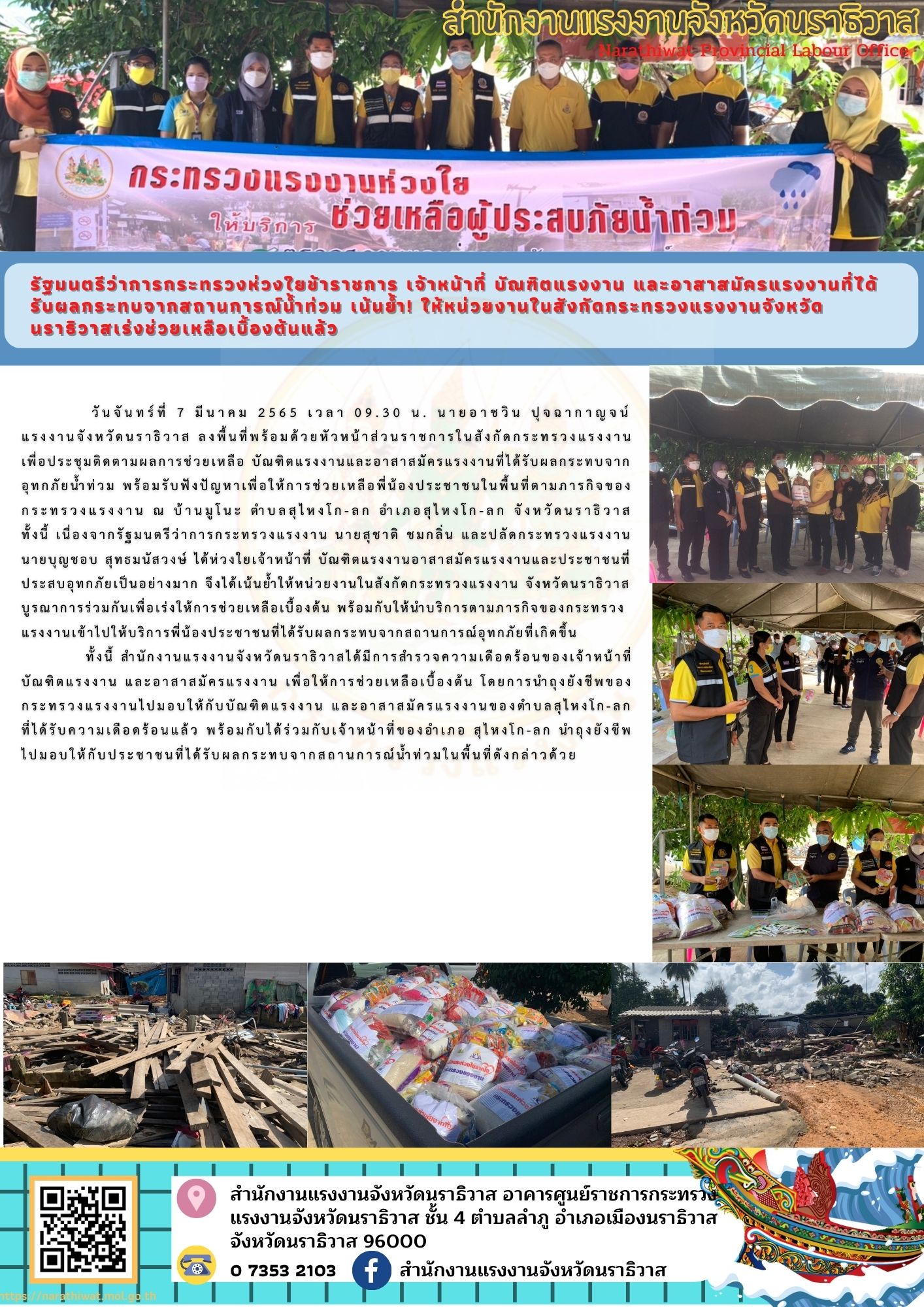 วันจันทร์ที่ 7 มีนาคม 2565 เวลา 09.30 น. นายอาชวิน ปุจฉากาญจน์แรงงานจังหวัดนราธิวาส ลงพื้นที่พร้อมด้วยหัวหน้าส่วนราชการในสังกัดกระทรวงแรงงาน เพื่อประชุมติดตามผลการช่วยเหลือ บัณฑิตแรงงานและอาสาสมัครแรงงานที่ได้รับผลกระทบจากอุทกภัยน้ำท่วม พร้อมรับฟังปัญหาเพื่อให้การช่วยเหลือพี่น้องประชาชนในพื้นที่ตามภารกิจของกระทรวงแรงงาน ณ บ้านมูโนะ ตำบลสุไหงโก-ลก อำเภอสุไหงโก-ลก จังหวัดนราธิวาสทั้งนี้ เนื่องจากรัฐมนตรีว่าการกระทรวงแรงงาน นายสุชาติ ชมกลิ่น และปลัดกระทรวงแรงงาน นายบุญชอบ สุทธมนัสวงษ์ ได้ห่วงใยเจ้าหน้าที่ บัณฑิตแรงงานอาสาสมัครแรงงานและประชาชนที่ประสบอุทกภัยเป็นอย่างมาก จึงได้เน้นย้ำให้หน่วยงานในสังกัดกระทรวงแรงงาน จังหวัดนราธิวาส บูรณาการร่วมกันเพื่อเร่งให้การช่วยเหลือเบื้องต้น พร้อมกับให้นำบริการตามภารกิจของกระทรวงแรงงานเข้าไปให้บริการพี่น้องประชาชนที่ได้รับผลกระทบจากสถานการณ์อุทกภัยที่เกิดขึ้น